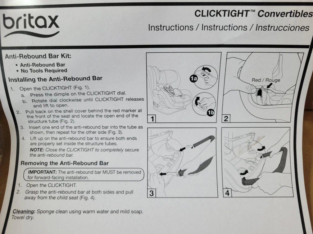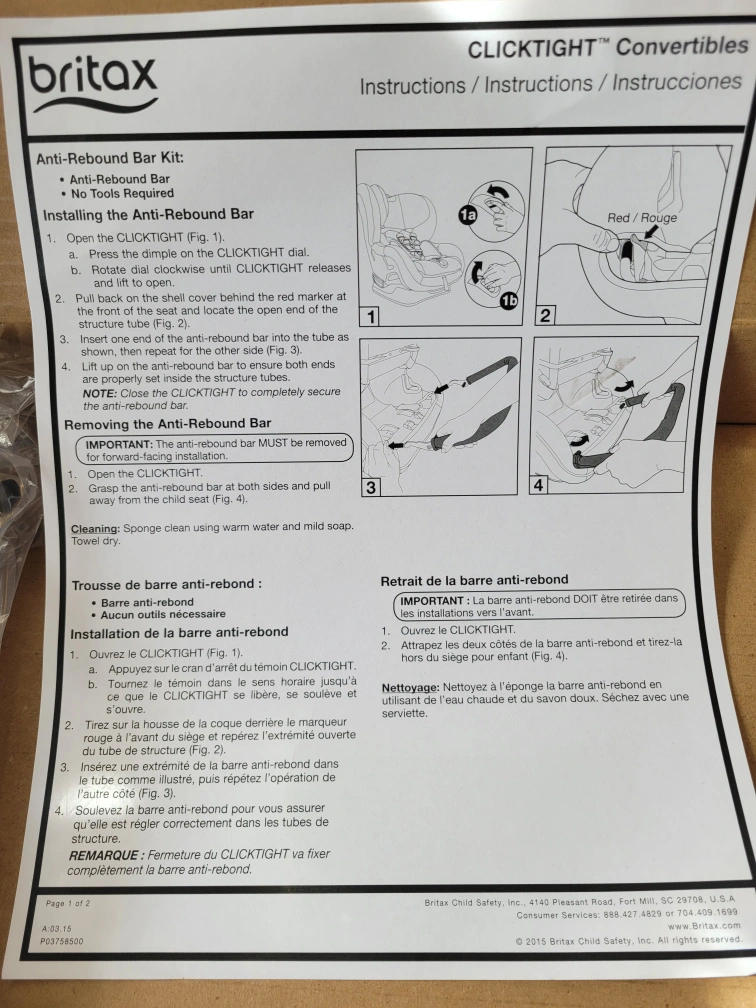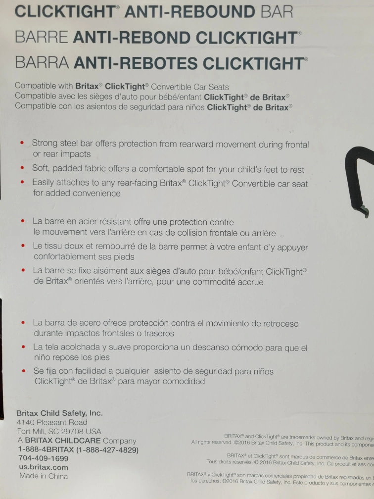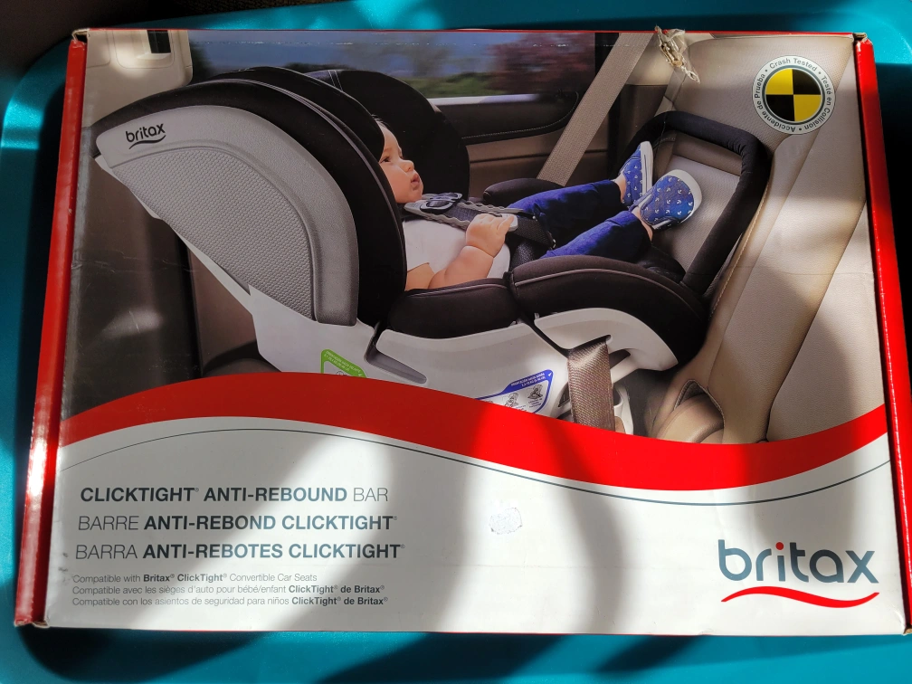 Brand new, never used Britax ClickTight anti-rebound bar. Compatible with select Britax car seats. Offers protection from rearward movement during frontal impacts. Includes soft padded fabric. Easy attachment. two available