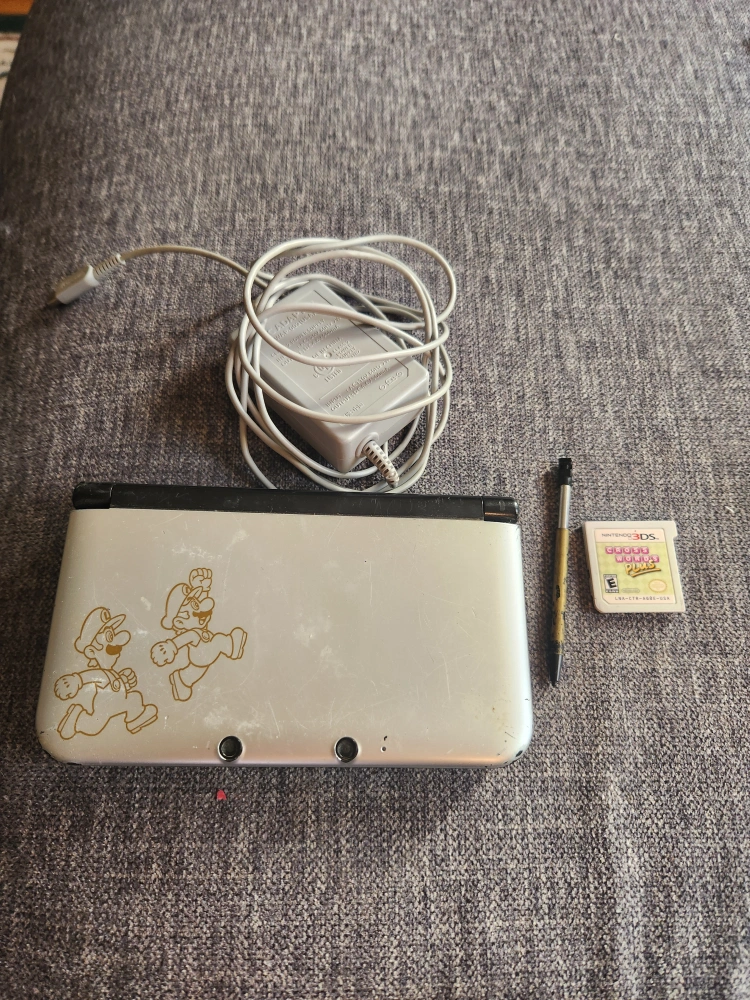 Pre-owned Nintendo 3DS XL. Mario and Luigi editions, Includes charger, stylus and cross word game. Some heavy wear and tear but it still worked great until the battery gave way. if you can get your hands on a new one, it should still work.