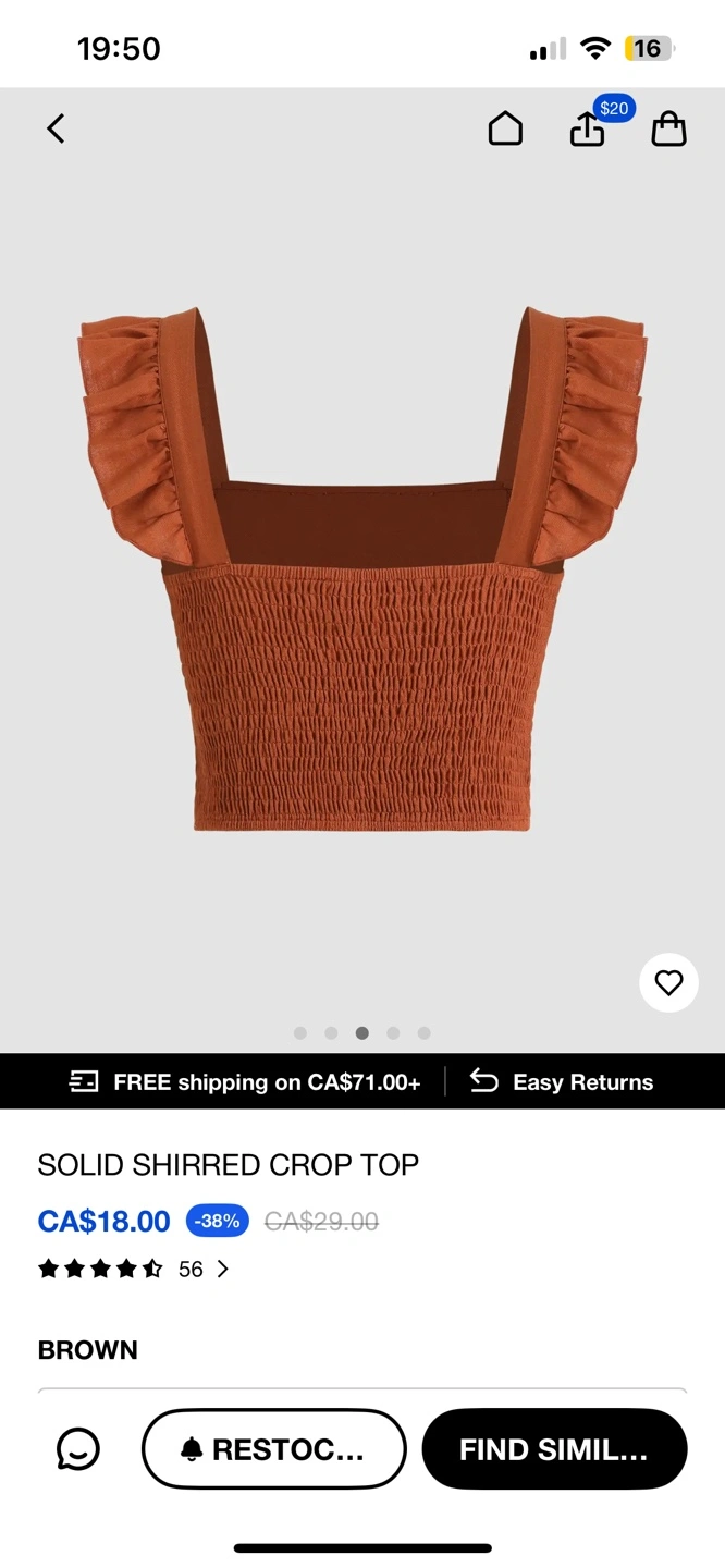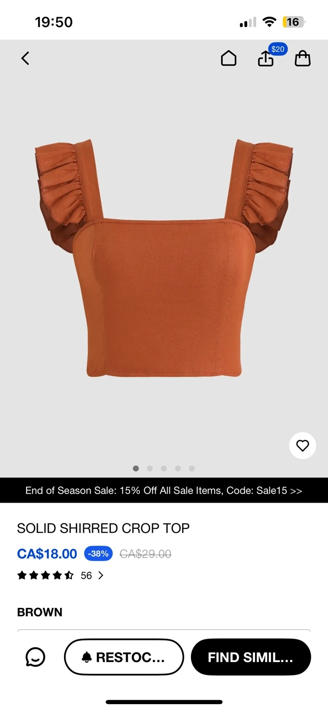 Cute brown crop top. Features shirring and ruffle sleeves. Square neckline. Perfect for summer.