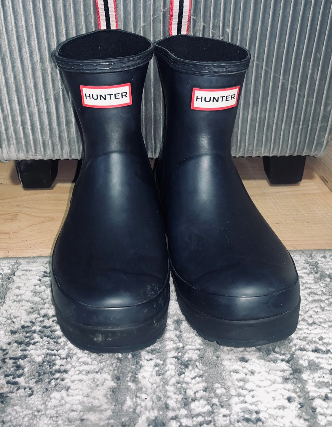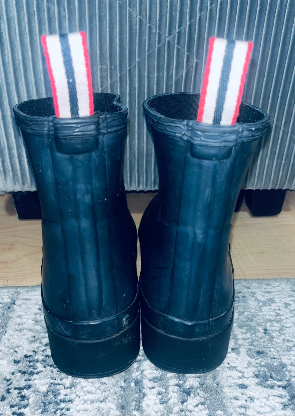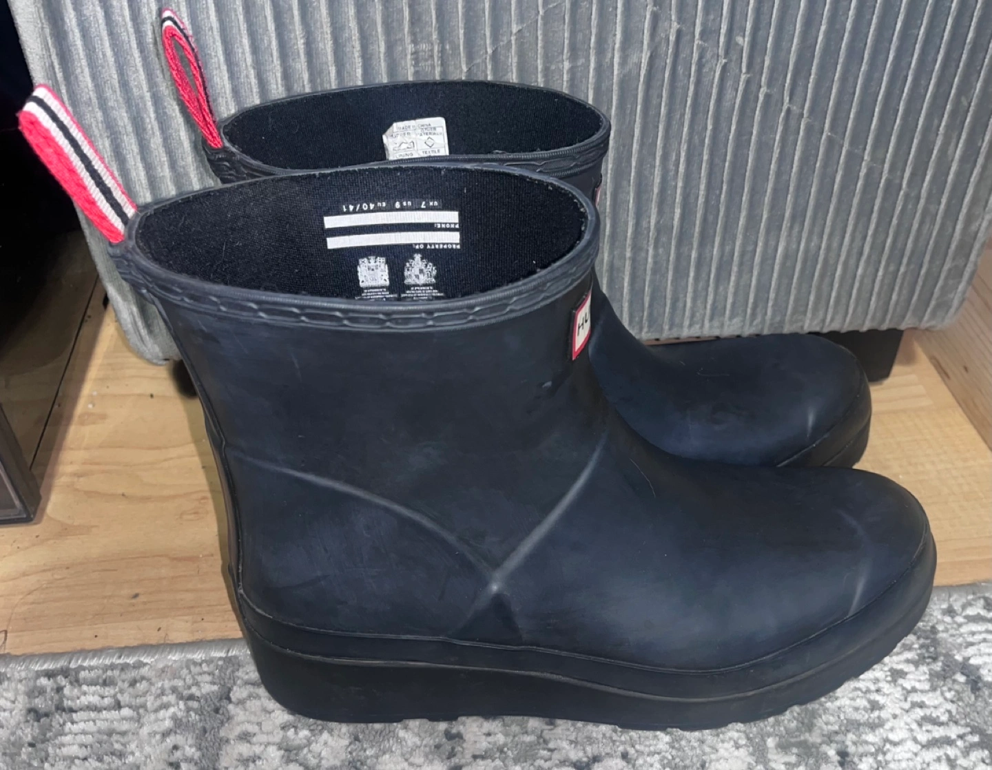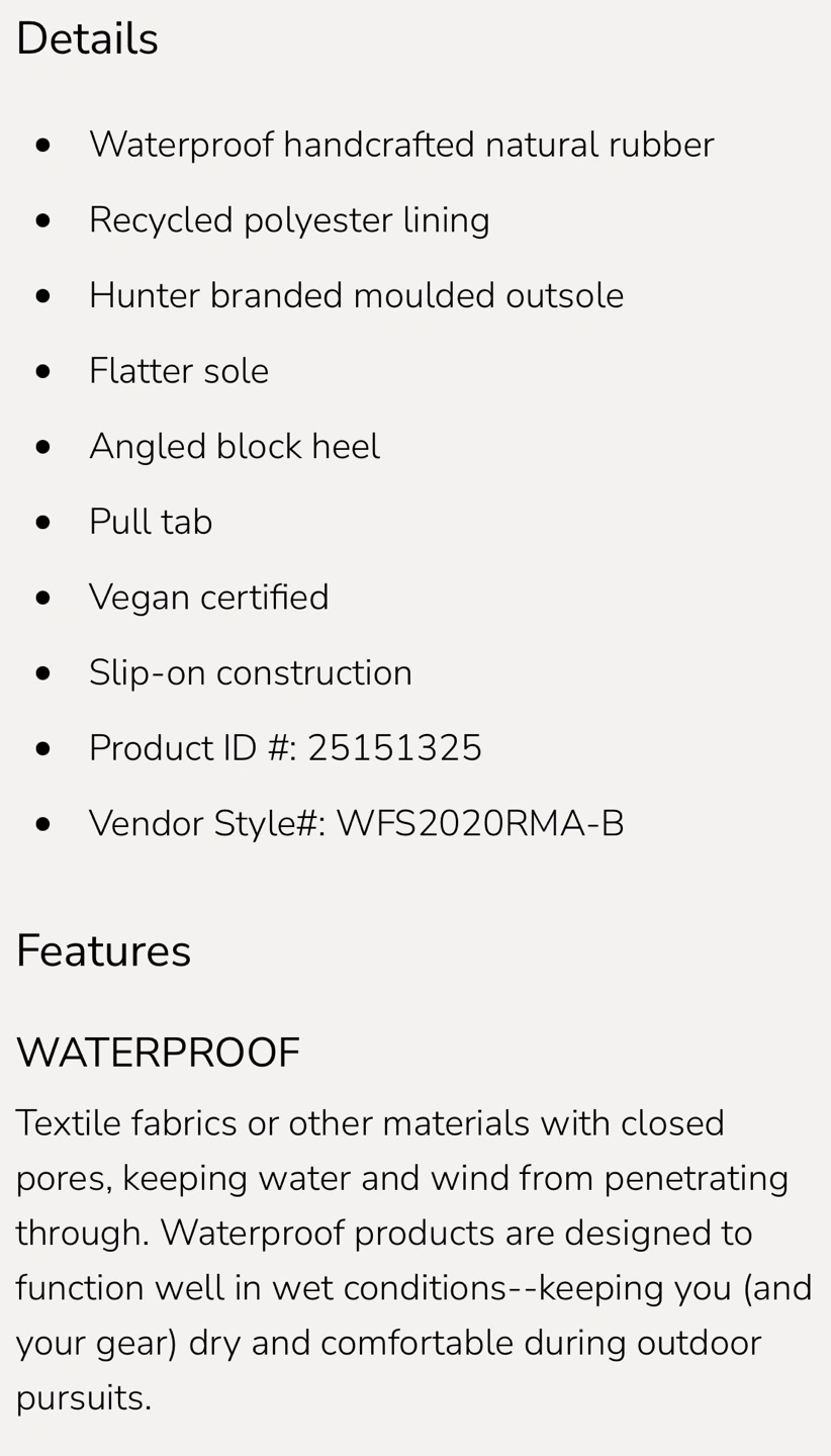 Waterproof handcrafted natural rubber boots. Recycled polyester lining. Hunter branded moulded outsole. Flatter sole. Angled block heel. Pull tab. Vegan certified. Slip-on construction. Great for rainy days!