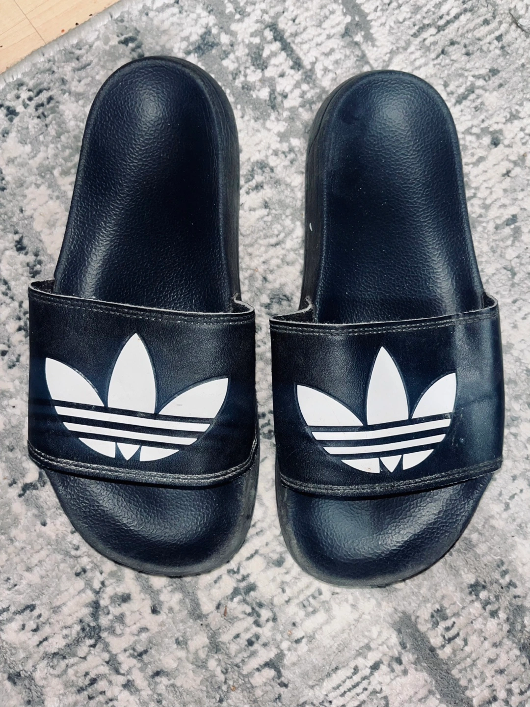 Pair of black Adidas slides. Size 7 US women's. Well worn but comfy, no damage.