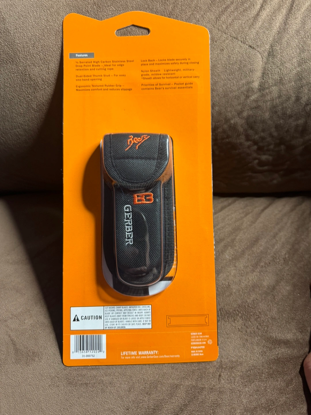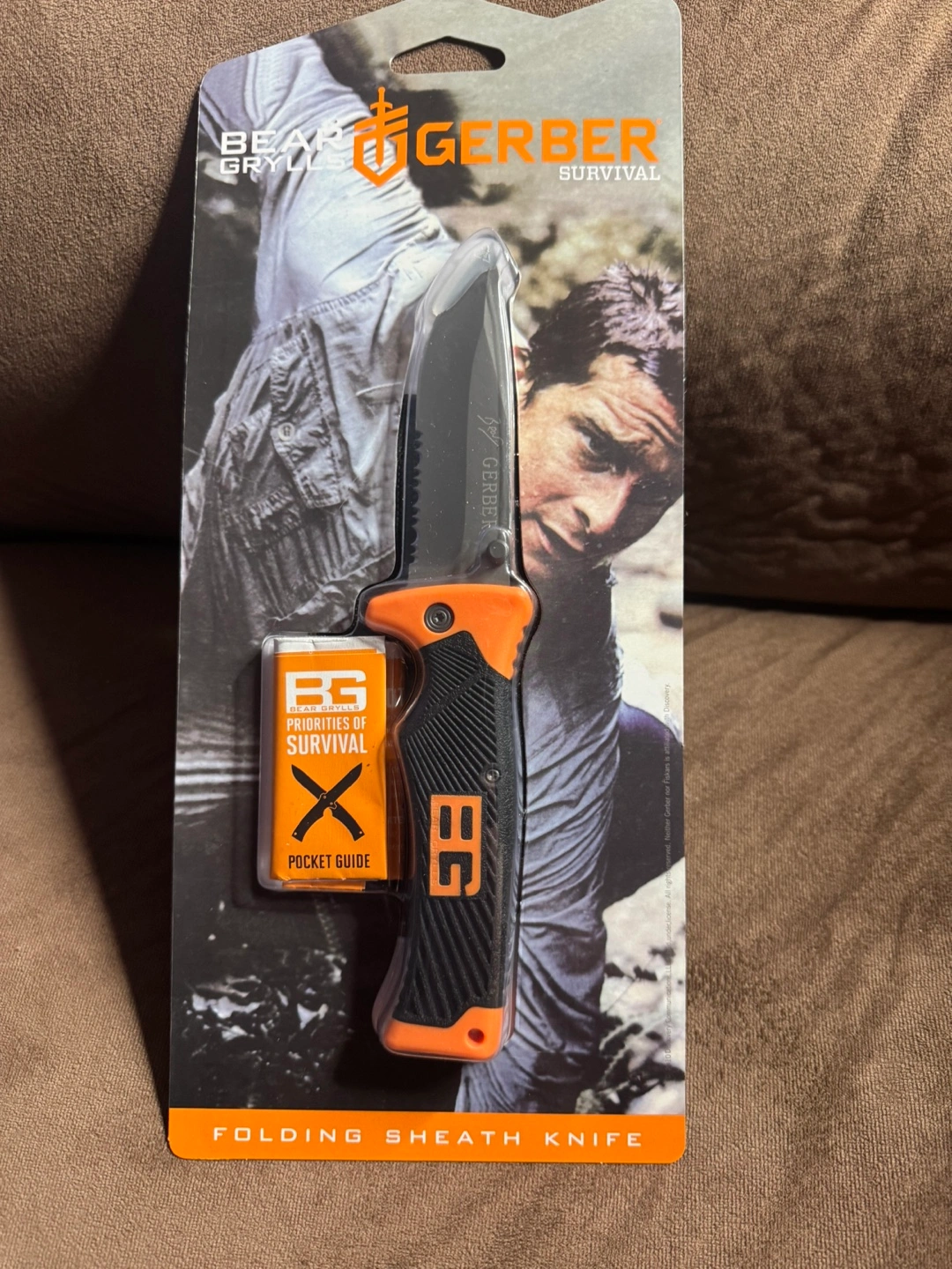 New, never used. Folding knife with sheath. Black and orange handle. Includes a Bear Grylls pocket guide.