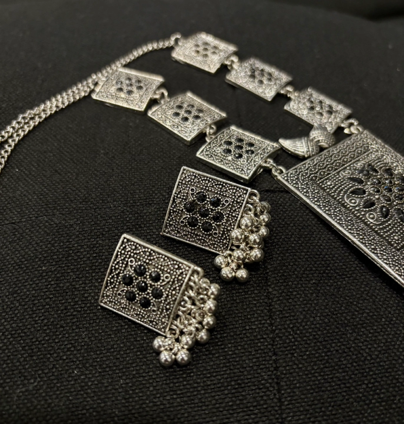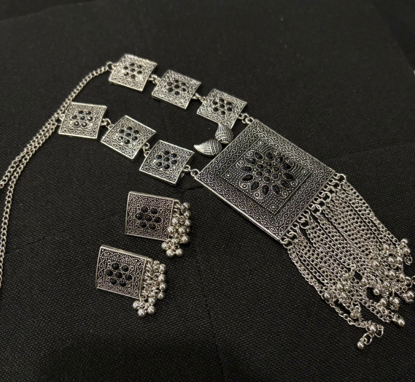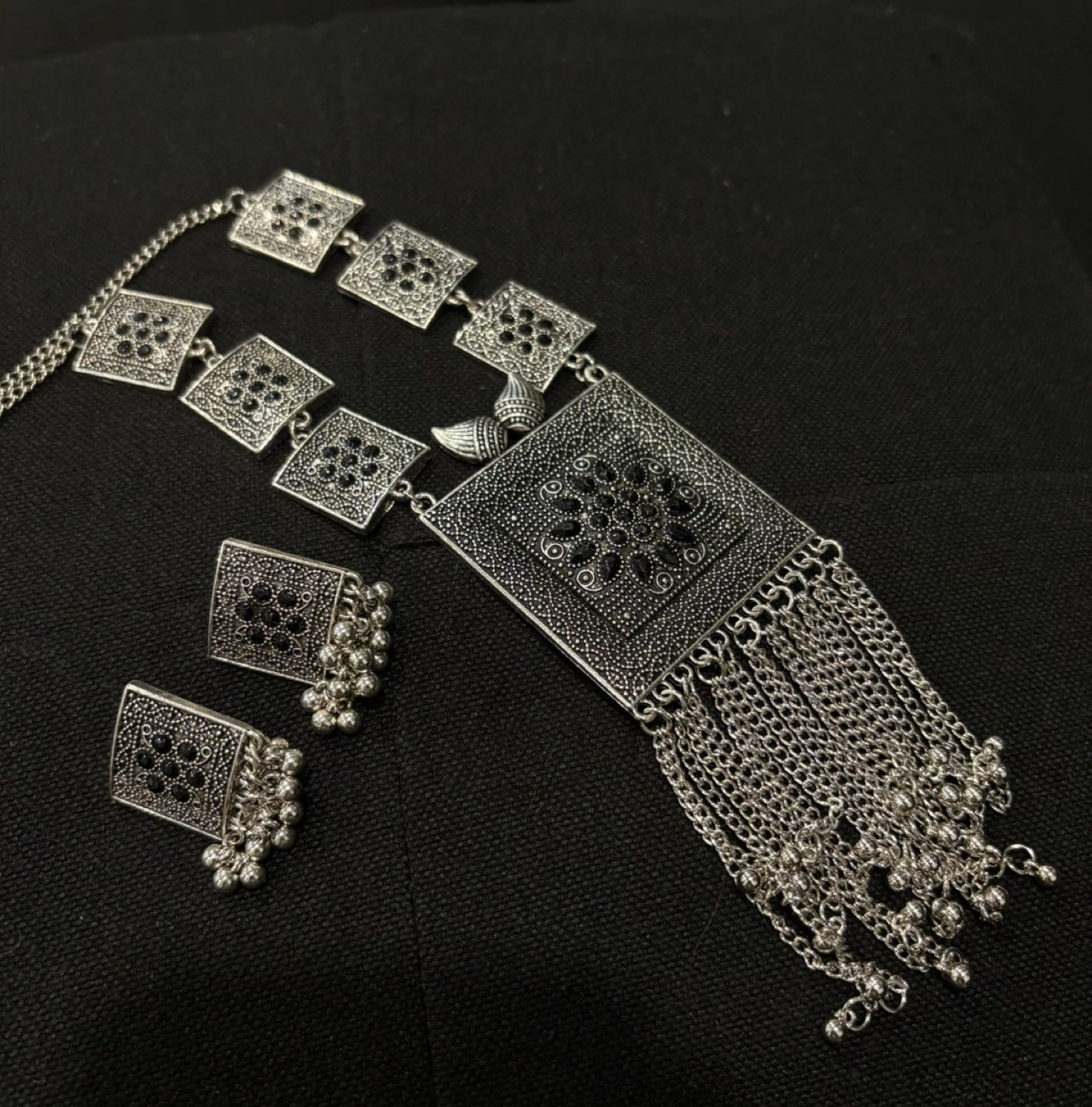 Beautiful oxidized silver necklace set. Features a long pendant necklace with square detailing and matching square stud earrings. Chain and tassel accents. Elegant and eye-catching.