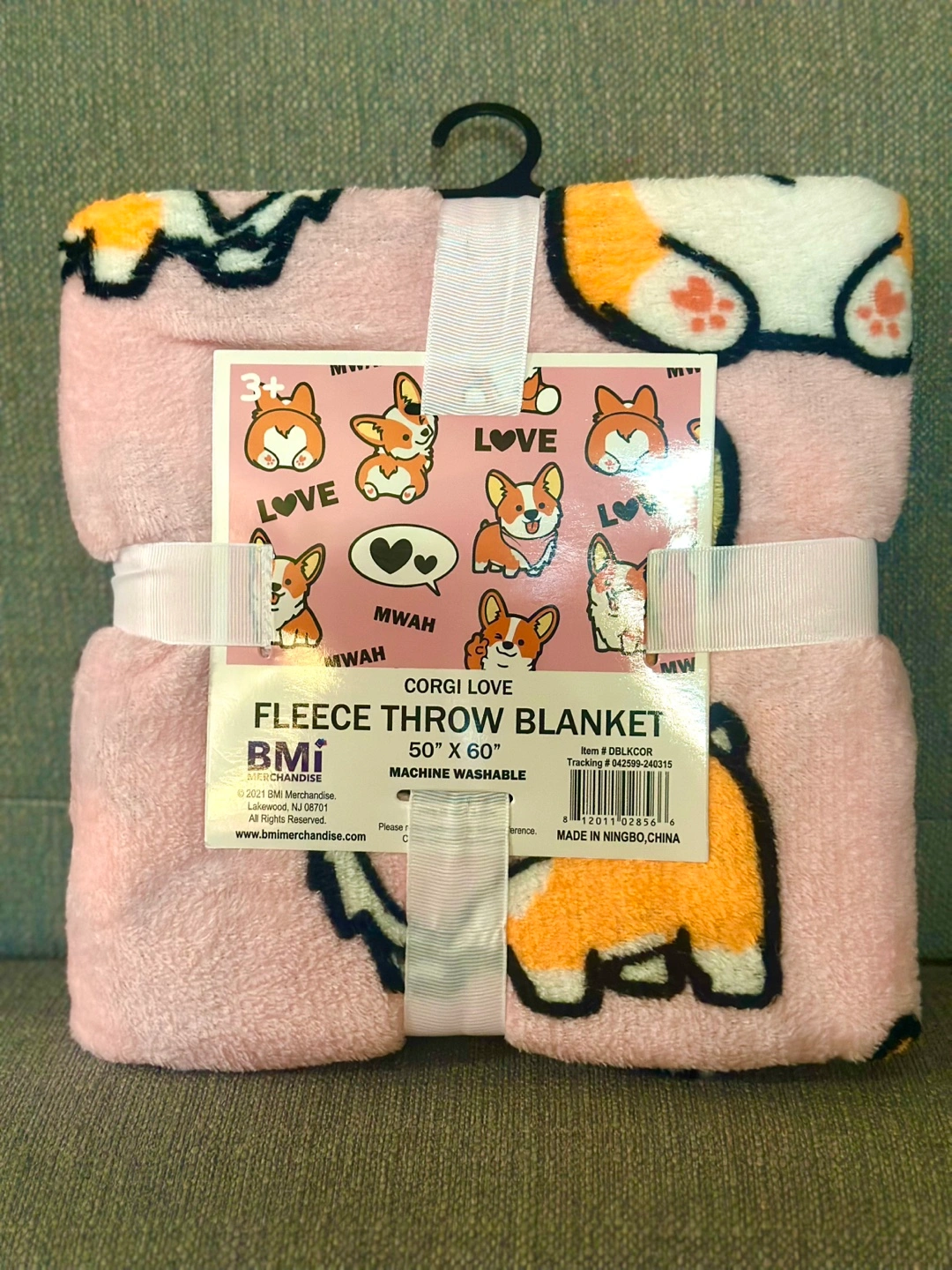 Item Available. LEAVE CONTACT NUMBER. Pick up only near South Kingsway and The Queensway. Check my other listings - more items for sale. Open to trades - please specify offer. Fleece throw blanket, 50" x 60", machine washable. Features Corgi dog illustrations on pink background.