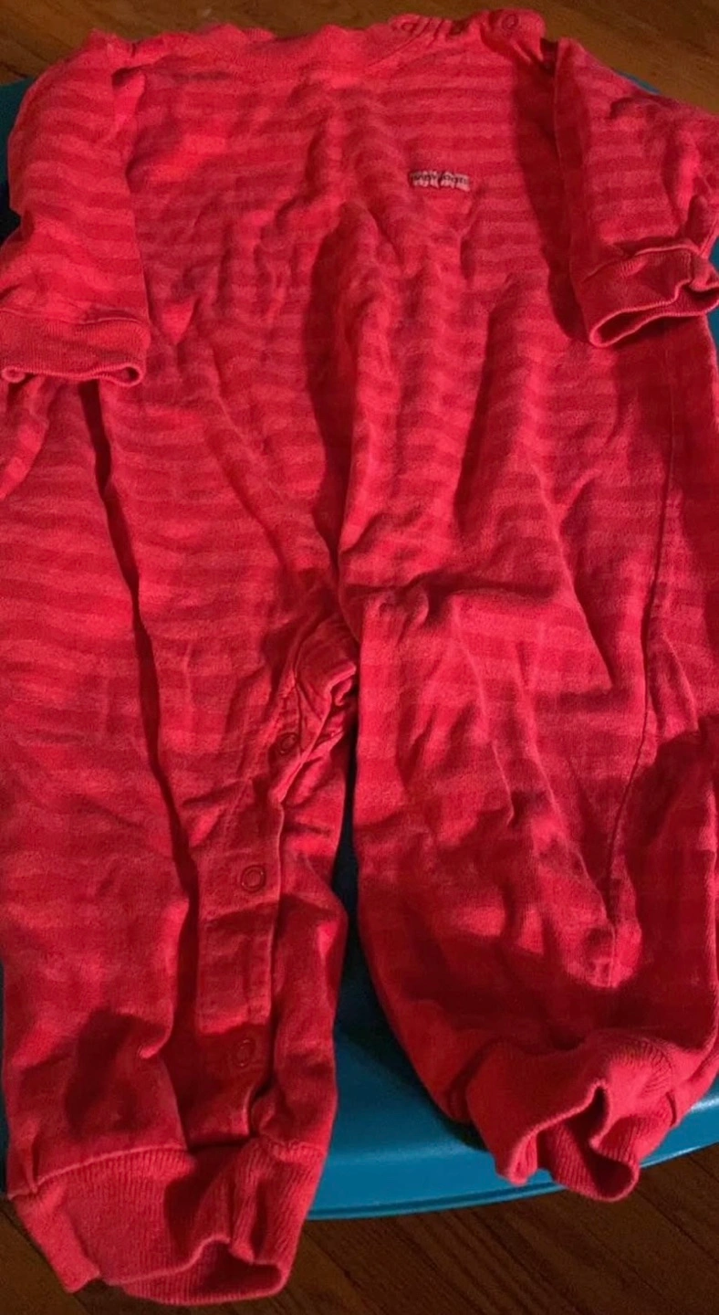 Adorable red striped baby sleep and play. Long sleeves, snap closures. Size not on it, there is no tag and I don’t know size. Pre-owned.