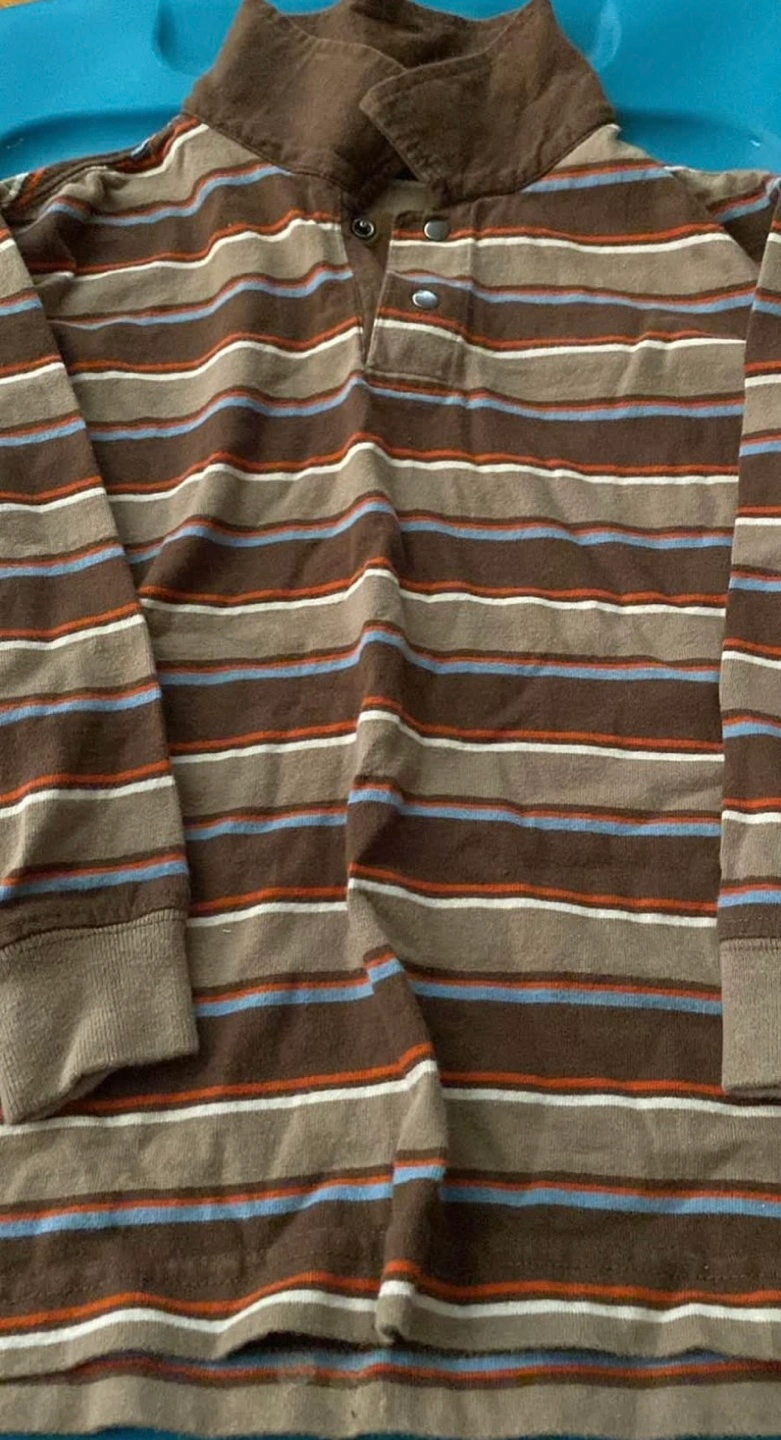 Old navy Brown, beige, and blue horizontal striped long-sleeve shirt. Collared henley style. Size extra small. No delivery, holds, or refunds. Price firm.