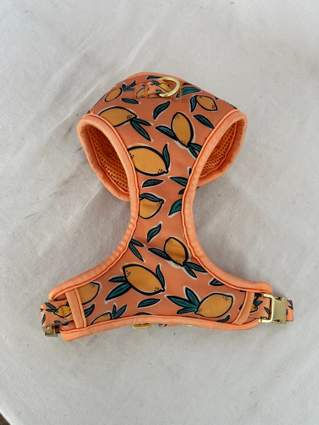 Adorable lemon print dog harness. Peach coloured base with a breathable mesh design. Gold coloured buckles and D-ring. Perfect for your stylish pup.