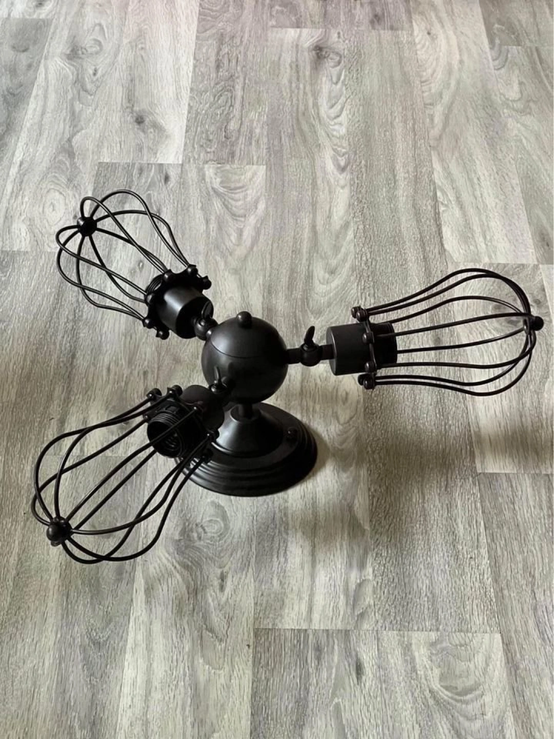 Industrial-style wall sconce. Features three cage shades. Black metal finish. Wall mount fixture. Light bulb not included