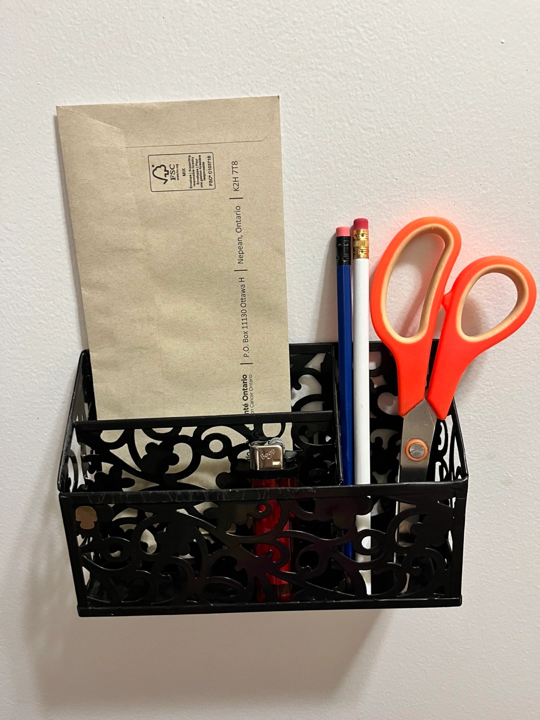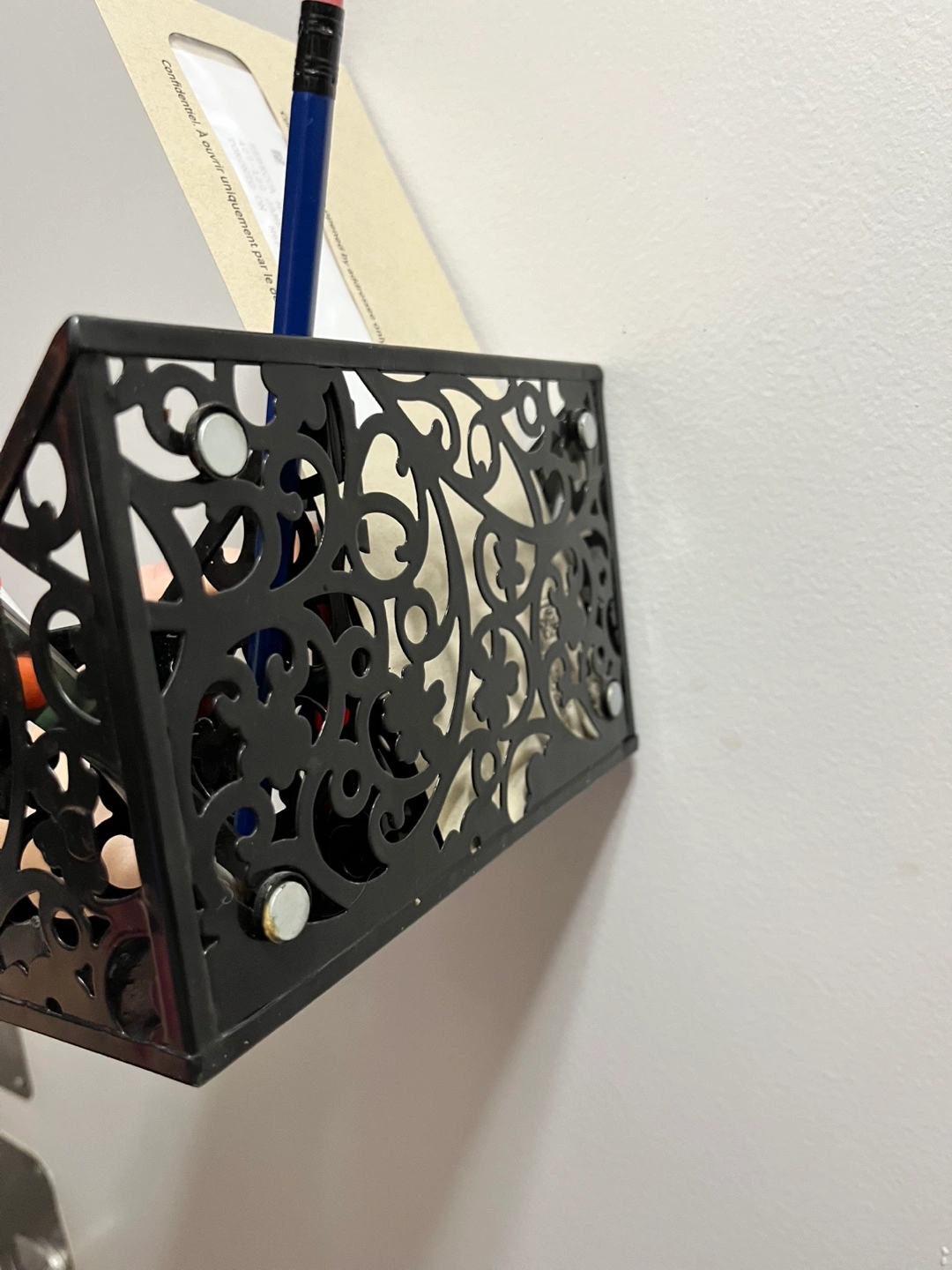 Small black metal organizer with strong magnets for easy attachment. 7.5 inches long and 2.5 in deep overall. Can attach to a fridge, door, or any compatible metal surface. Features decorative cutouts and three compartments. Great for holding pens, mail, and other small items. Perfect for keeping items up high or out of the way. LOCATION: This item is for pickup at my home near King St West and Jameson Avenue in Parkdale (exact address is only given for confirmed pickups)