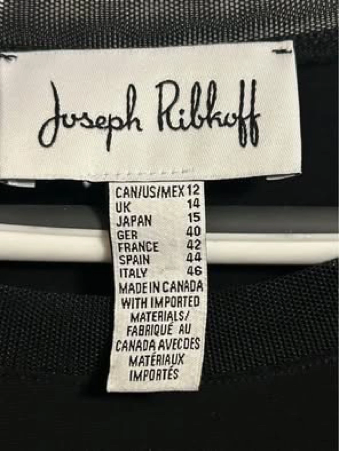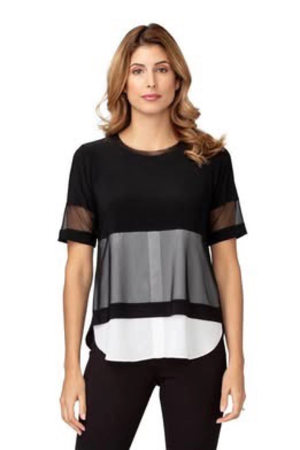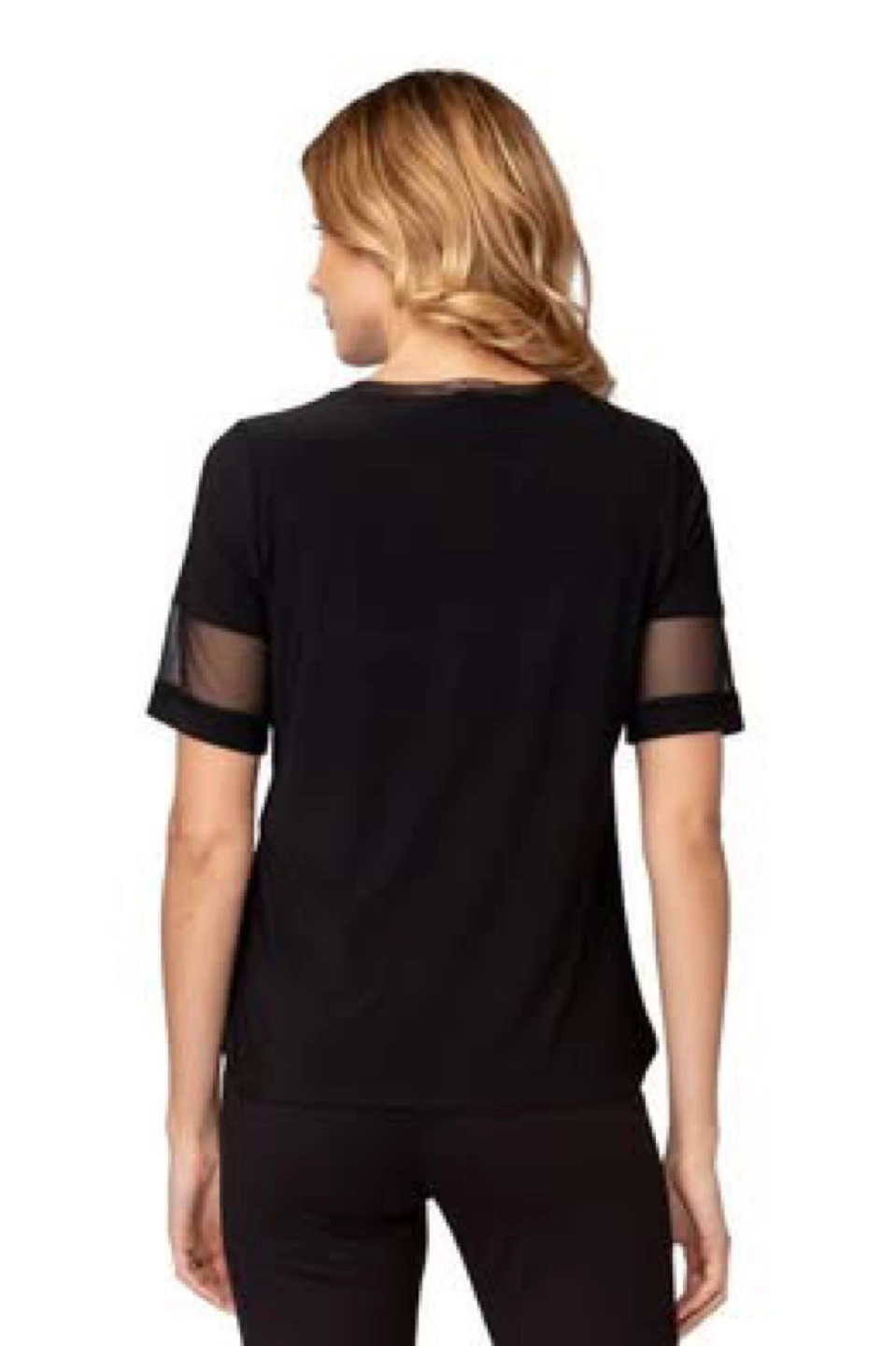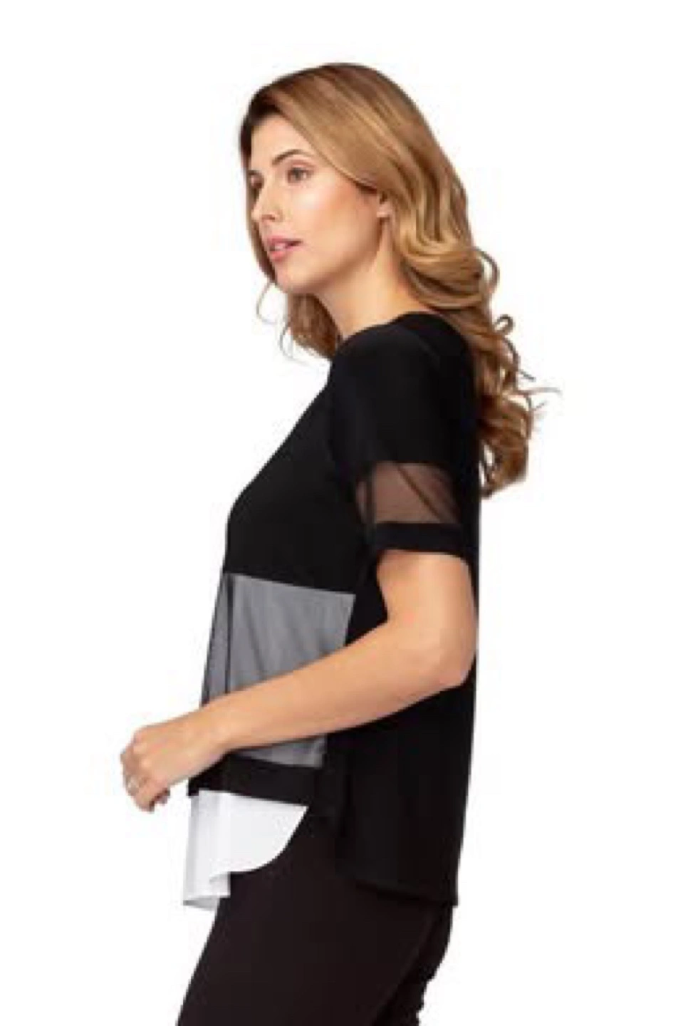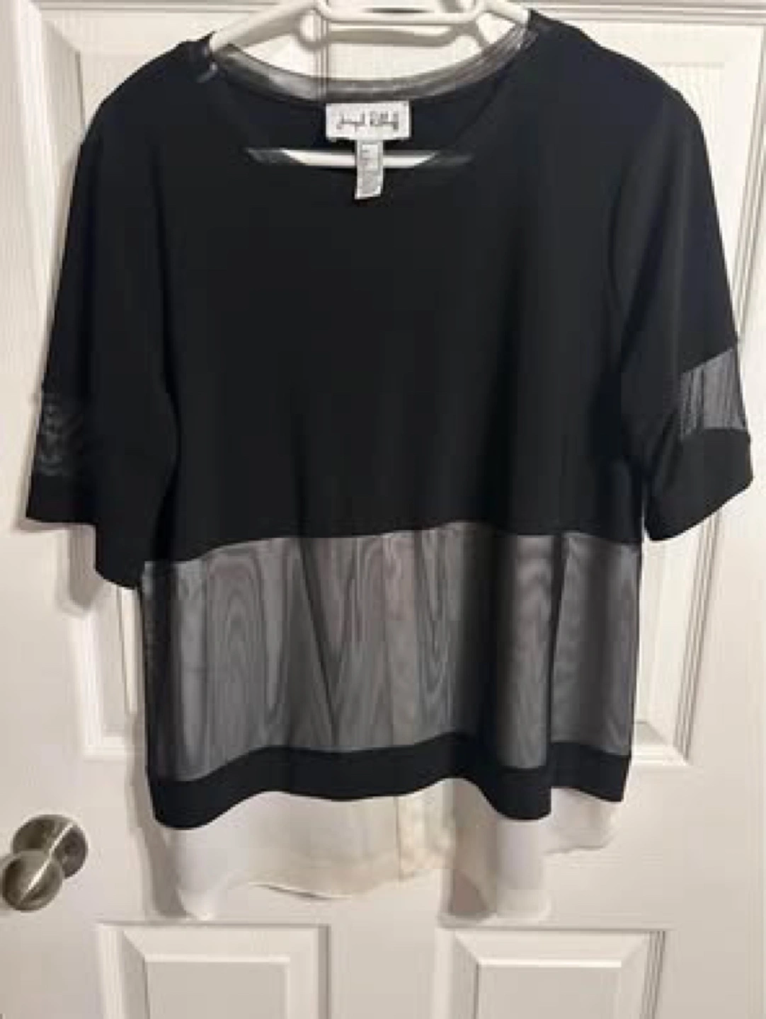 Black short sleeve top. Features sheer mesh panels and a layered white underlayer. Made in Canada with imported materials. Size 12.