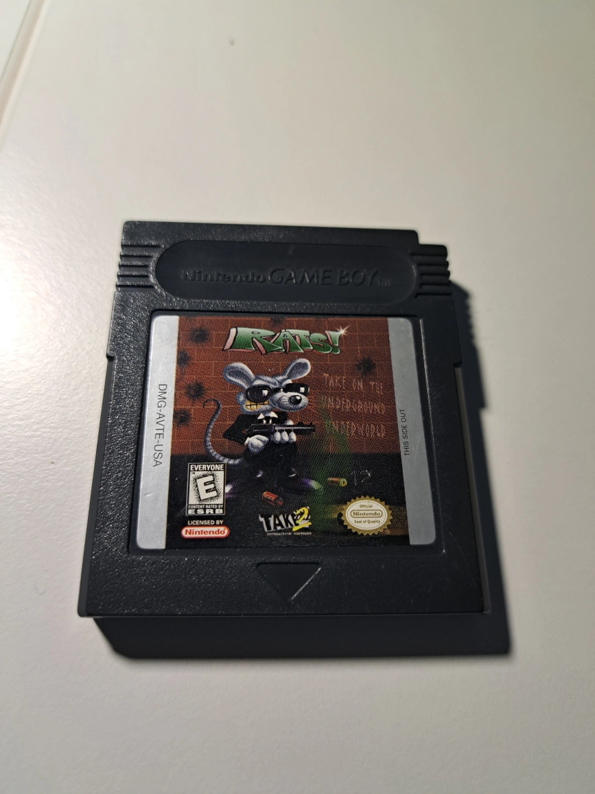 Game Boy game Rats! Take on the Underground Underworld. Rated E for Everyone by ESRB. Licensed by Nintendo.