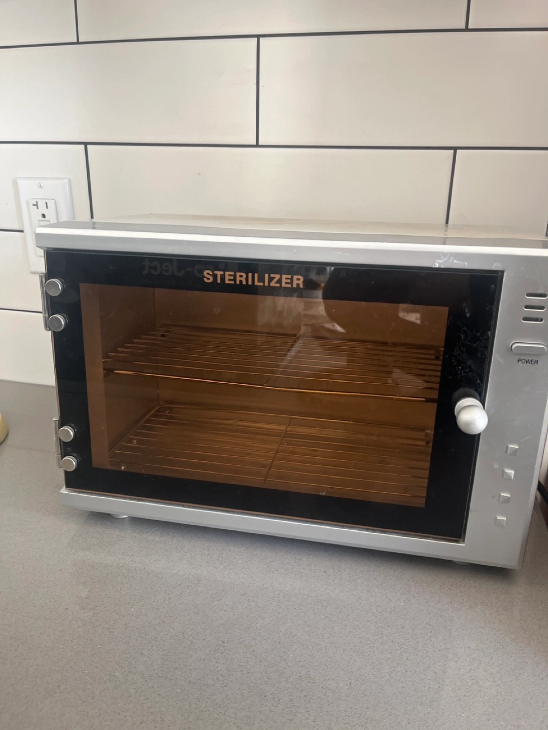 Compact UV sterilizer. Features a glass door and two wire racks. Good for sterilizing small tools or items.
