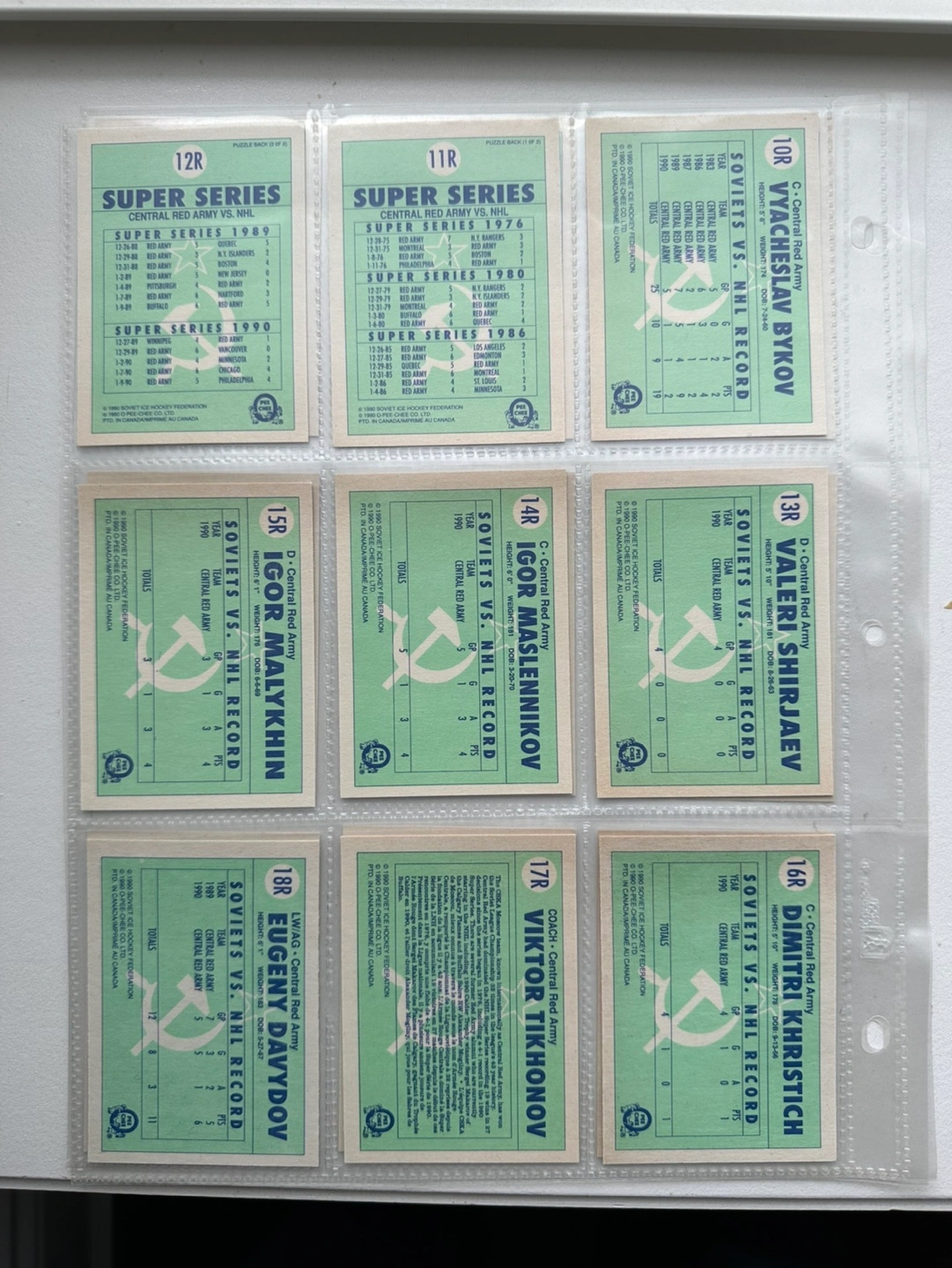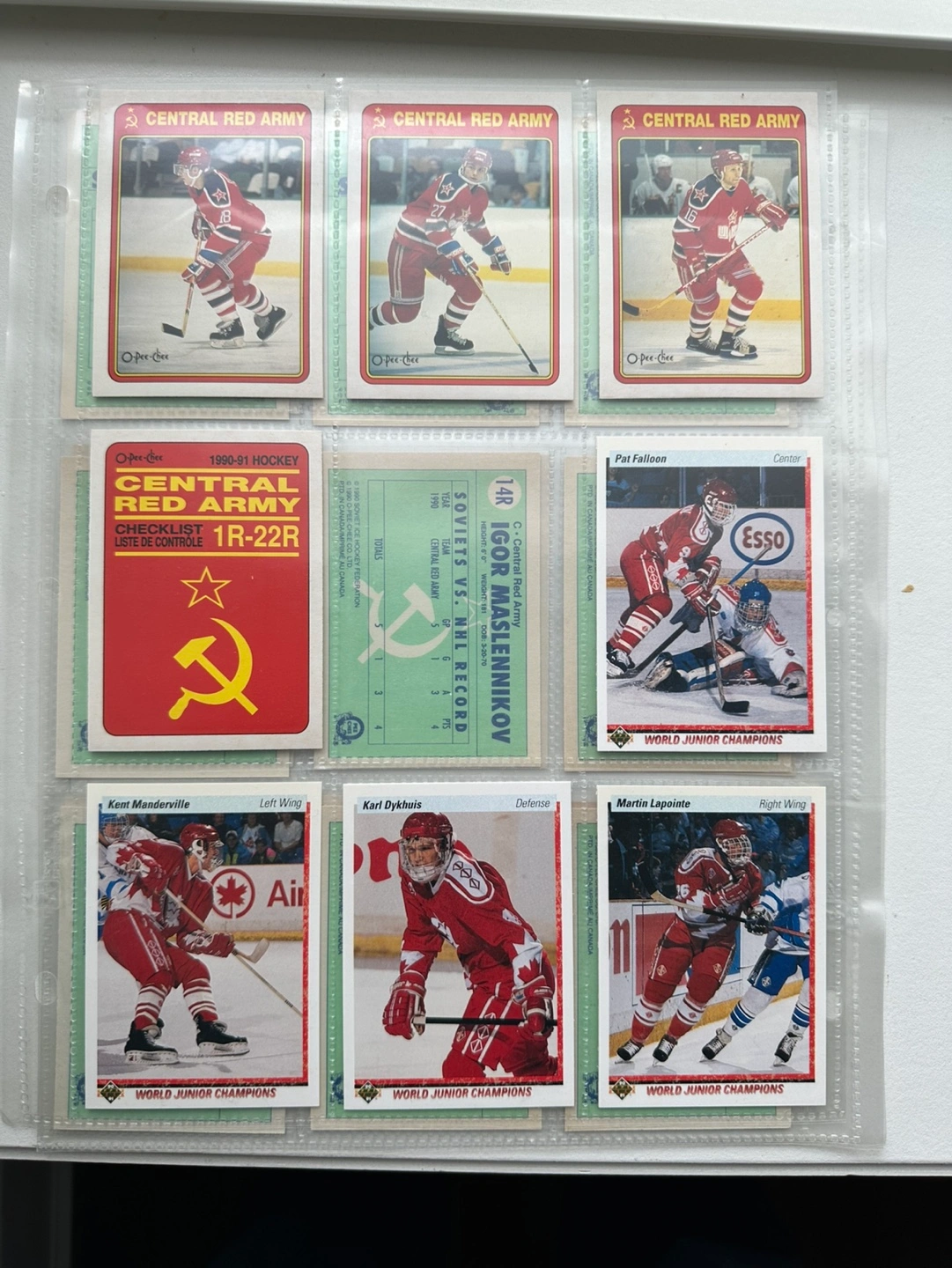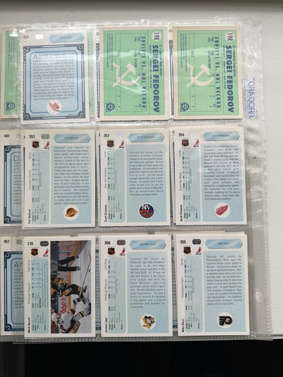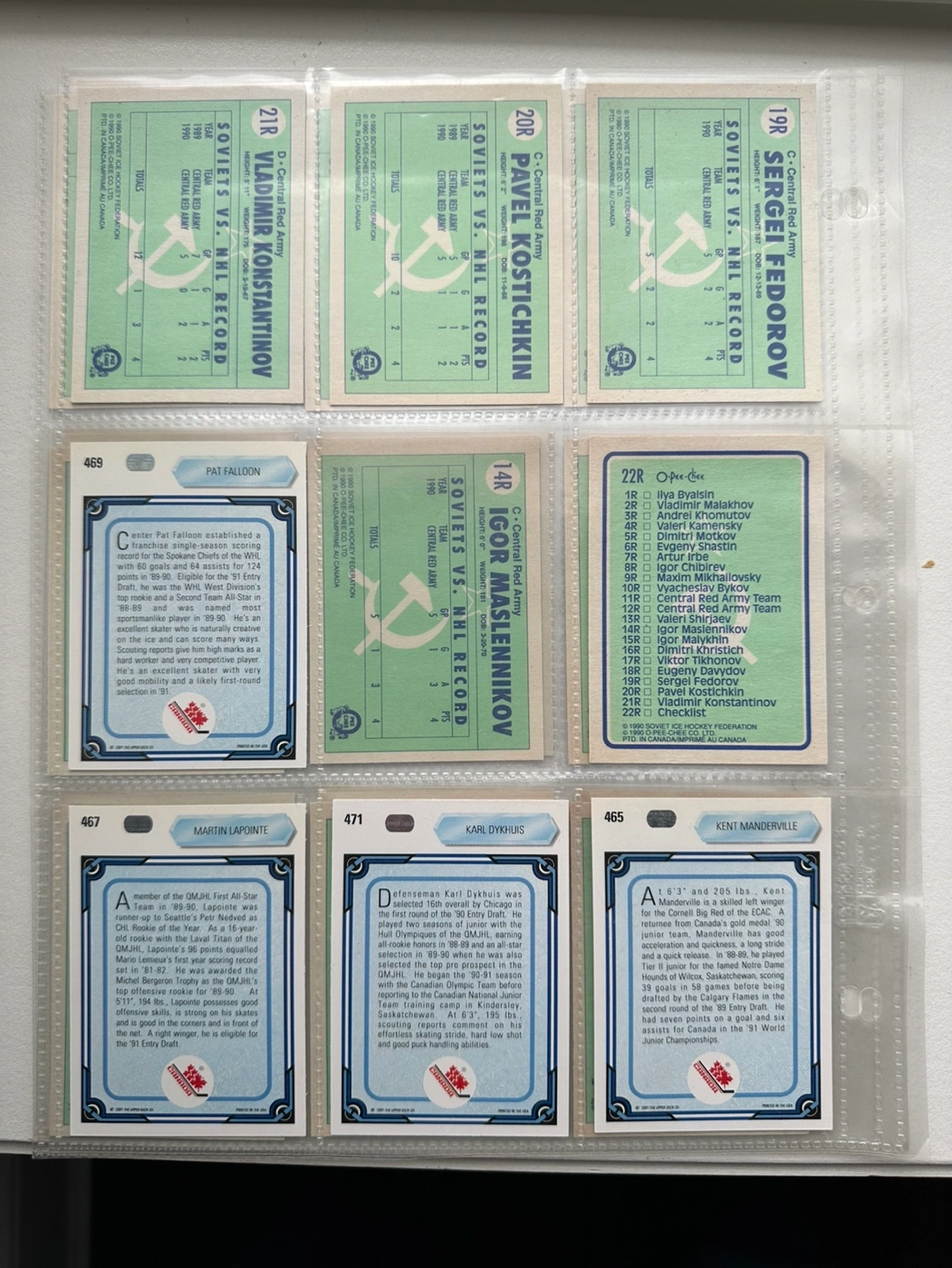 Variety of 1990-91 hockey cards from O-Pee-Chee and Upper Deck in protective sleeves. Complete set of O-Pee-Chee Central Red Army hockey cards including 2 additional Sergei Federov cards. Variety of Upper Deck cards featuring some of Canada’s world juniors such as Felix Potvin, Brad May, and Scott Niedermayer. Also a few rookie cards of players such as Jaomir Jagr. Check out a few of my other listings.