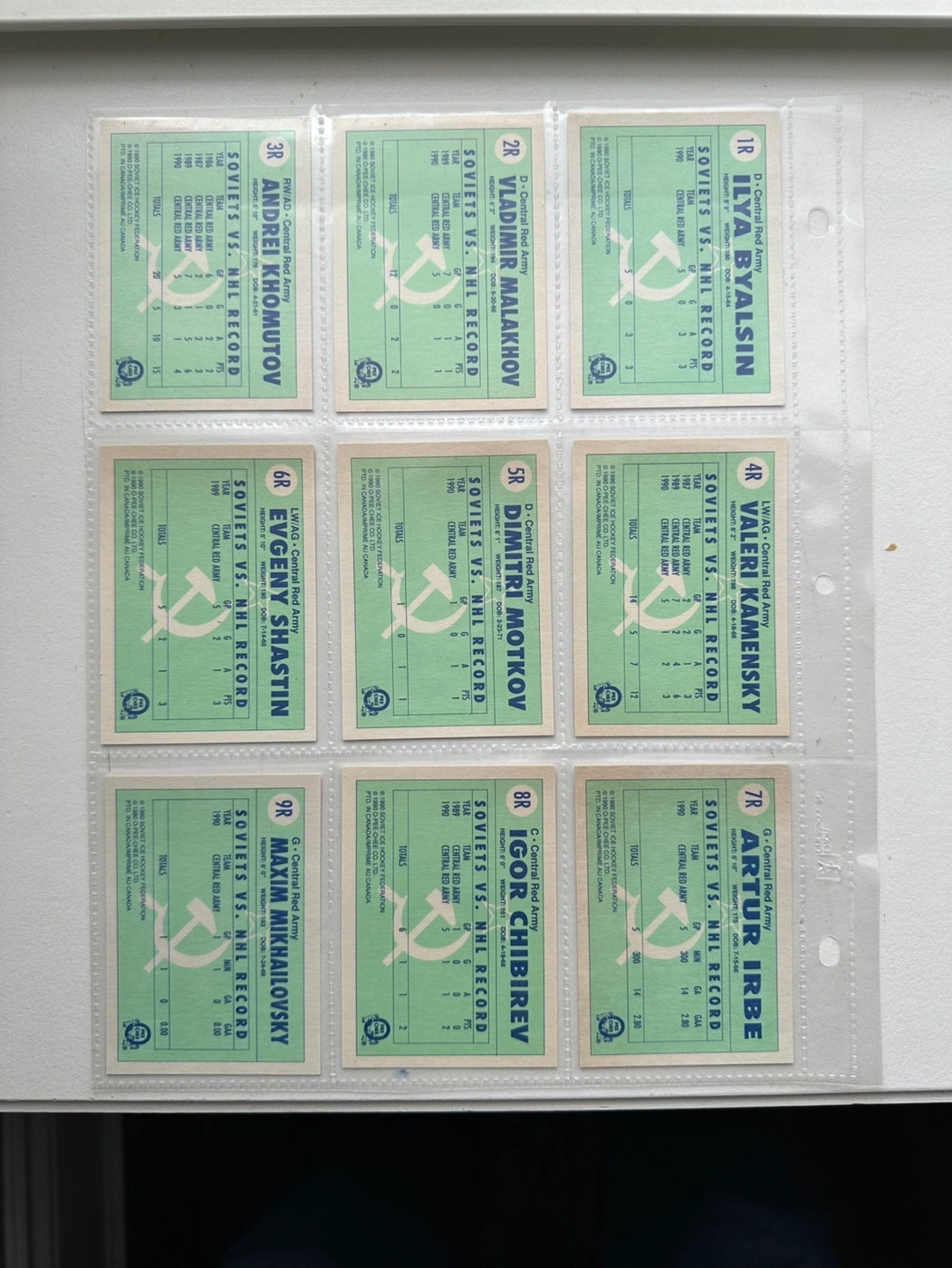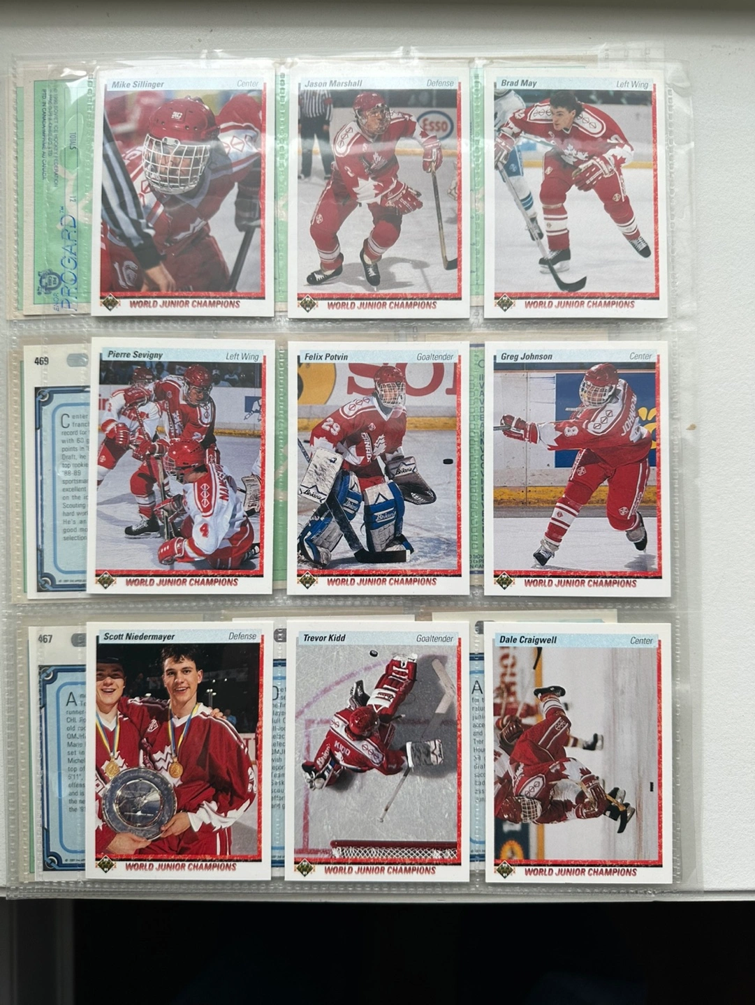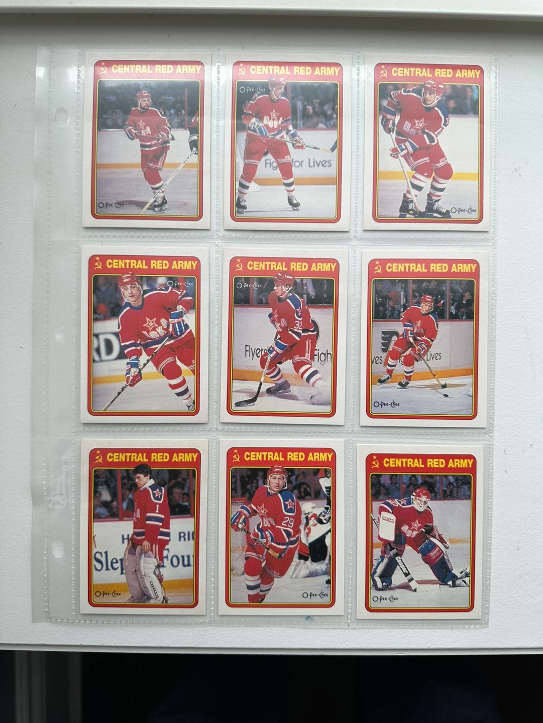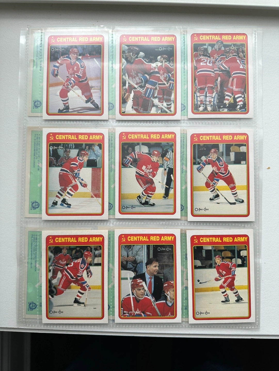 Variety of 1990-91 hockey cards from O-Pee-Chee and Upper Deck in protective sleeves. Complete set of O-Pee-Chee Central Red Army hockey cards including 2 additional Sergei Federov cards. Variety of Upper Deck cards featuring some of Canada’s world juniors such as Felix Potvin, Brad May, and Scott Niedermayer. Also a few rookie cards of players such as Jaomir Jagr. Check out a few of my other listings.