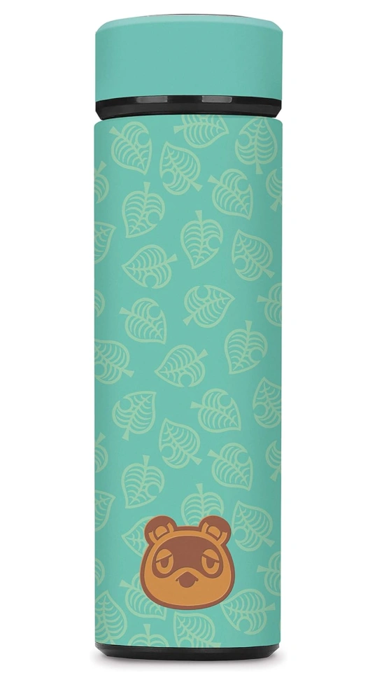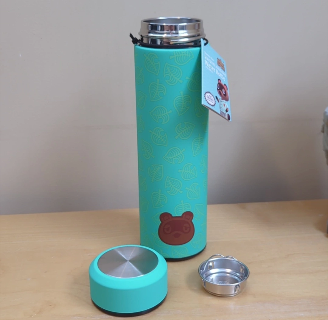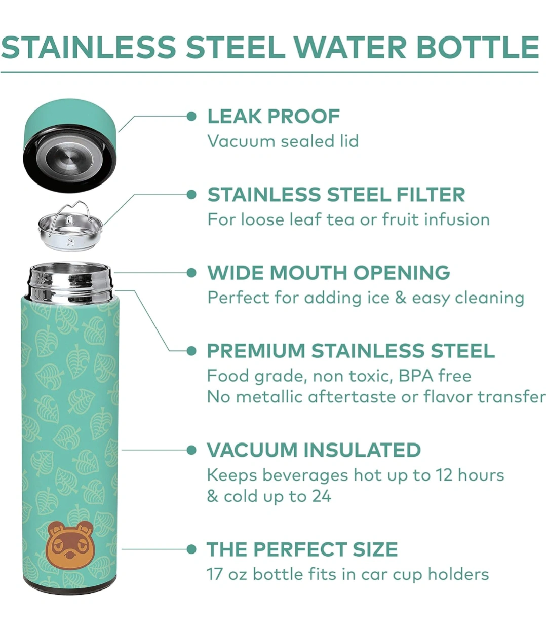 Vacuum insulated, leak proof water bottle. Keeps beverages hot or cold for hours. Includes loose leaf tea infuser. Features Tom Nook and Animal Crossing leaf design. BPA free.
