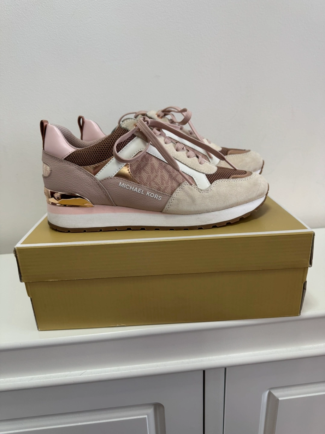 Beautiful Women's Michael Kors Shoes . Size 8M. Soft pink and rose gold colour scheme. Suede and mesh upper. Rose gold accents. Comes in original box. Worn only once, I really like this very much and sad for me to let it go but its tight for me as my feet is wide and and I an also flat footed. Pick up at Bathurst & Steeles.