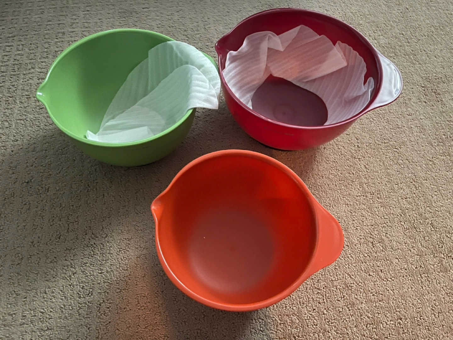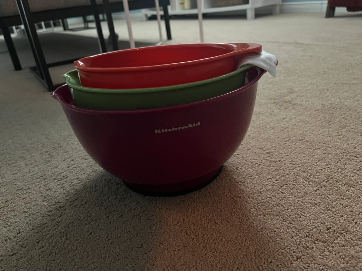 Set of three colourful KitchenAid mixing bowls. Various sizes. Excellent for baking and prepping. Never used