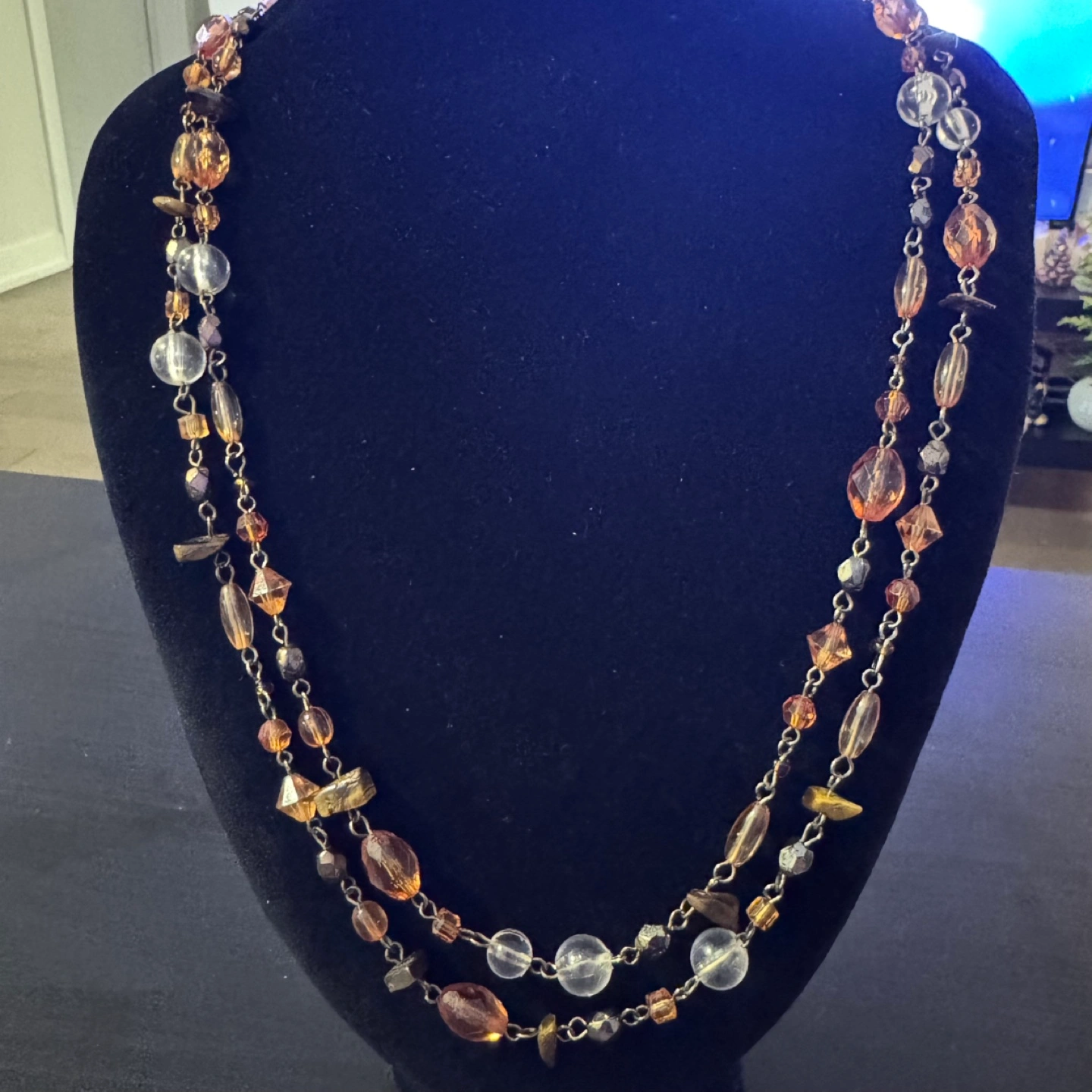 Gorgeous long station necklace. Features tiger eye stone, synthetic amber and clear glass crystal beads, metal accents. Can be worn long or layered twice or thrice. Unique style statement. This item is in lovely vintage condition. Please see photos and let me know if you have any questions.