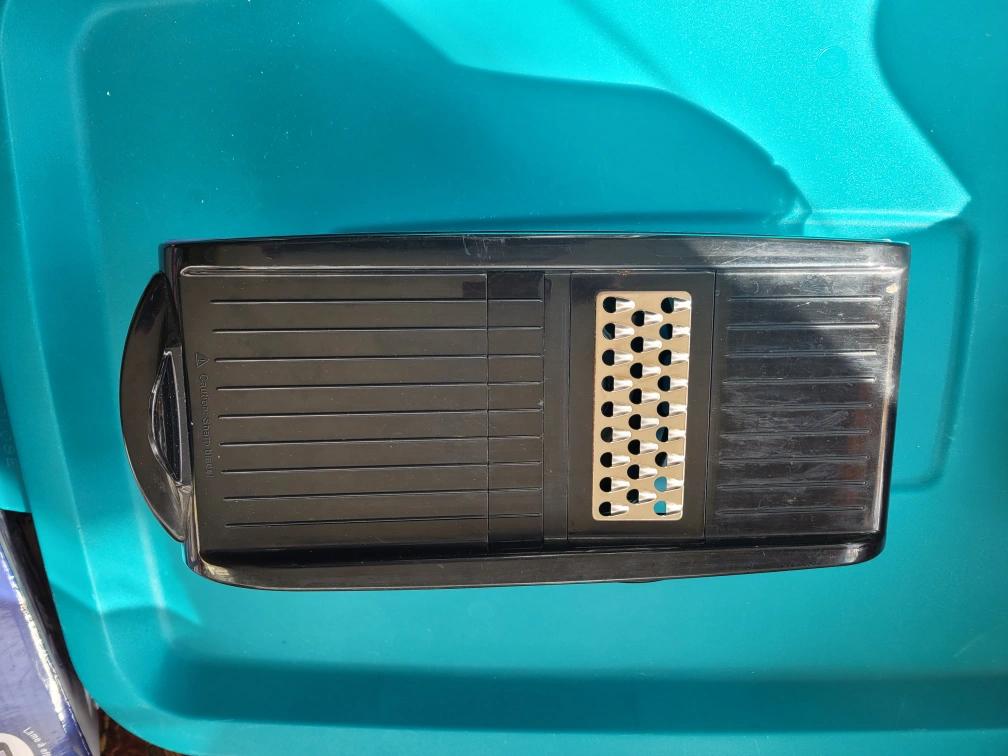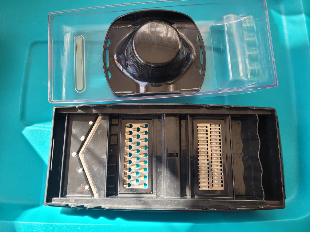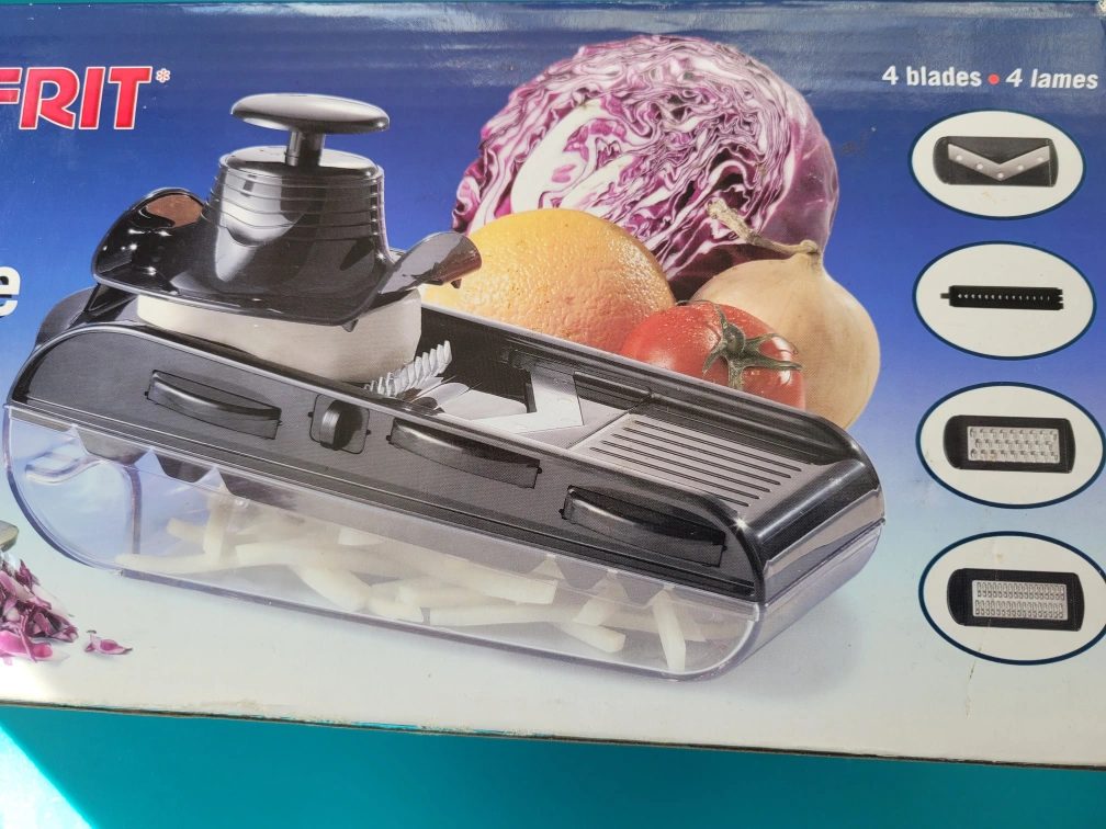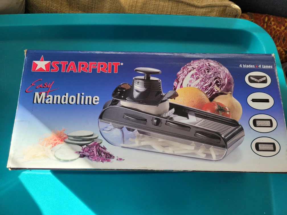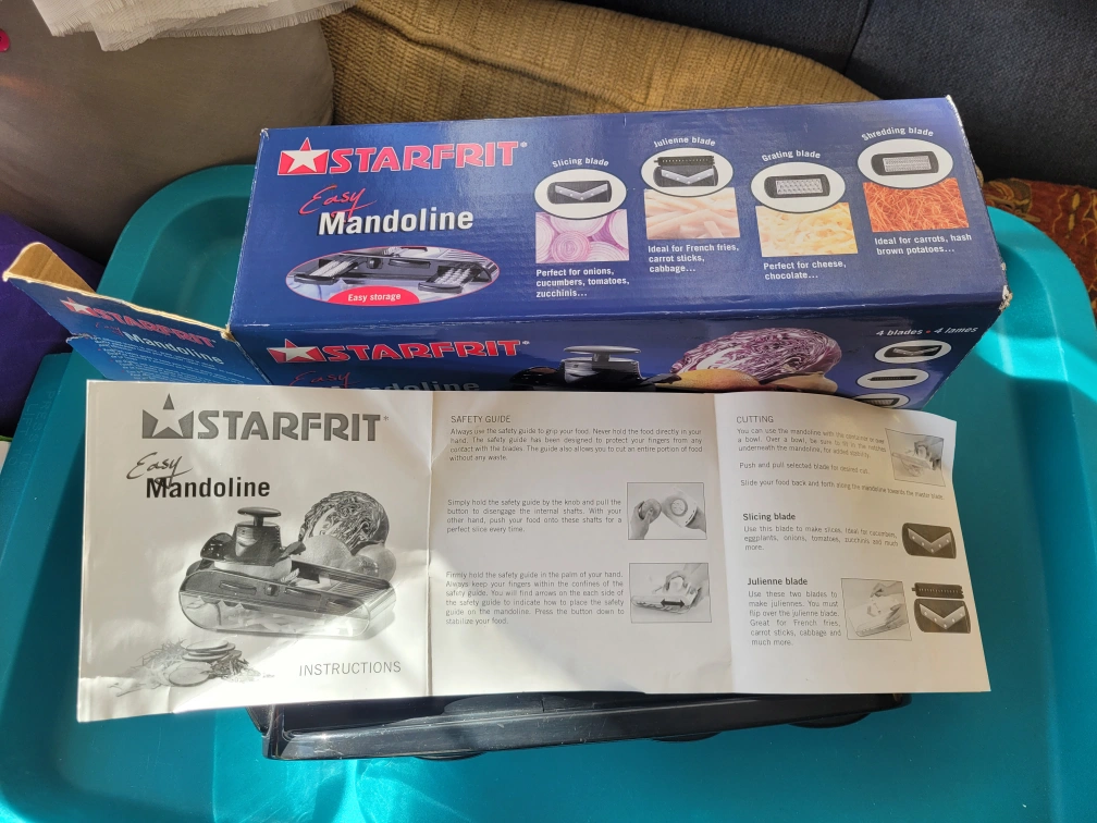 comes with box and manual. Starfrit Easy Mandoline. Four blades included. Great for slicing, julienning, grating, and shredding vegetables. saves your nails and knuckles. makes any job quick read easy.