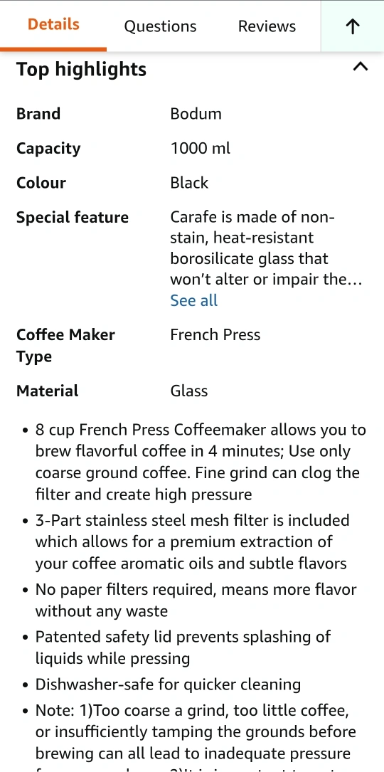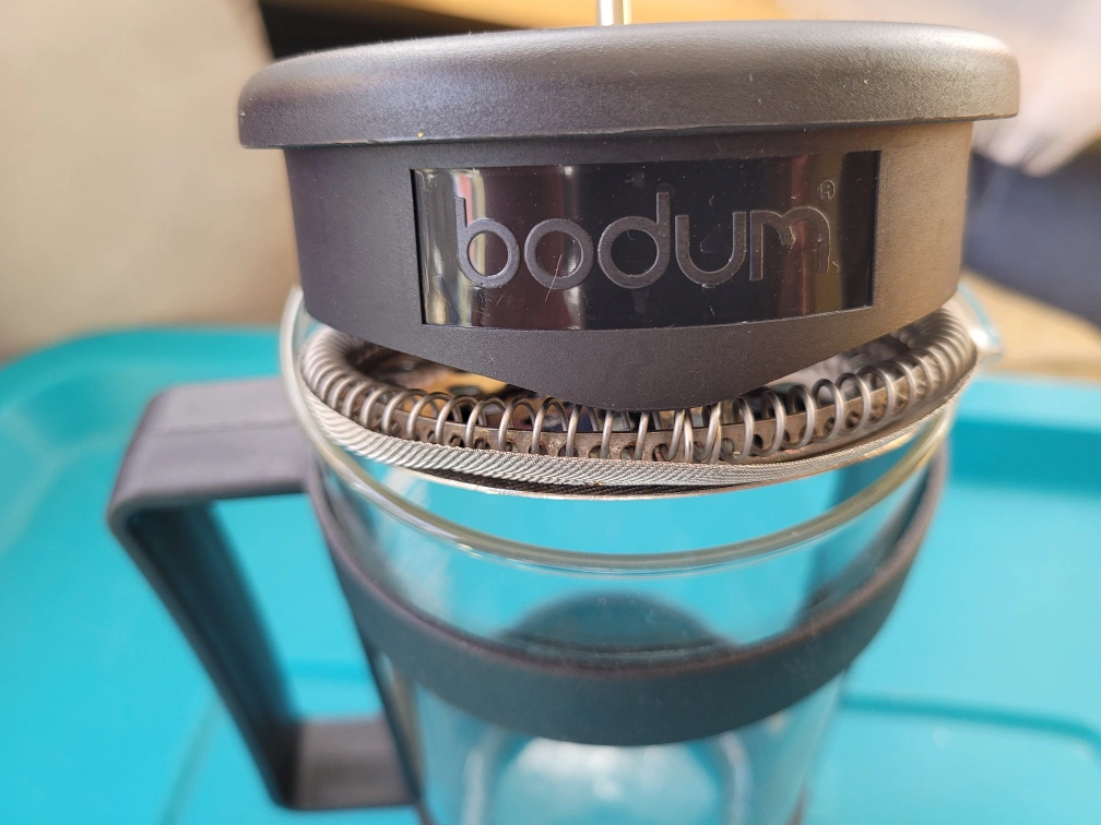 Large Bodum French / Brazilian press. Glass and black plastic. 1l capacity. Good for up to 8 cups of coffee. like new condition.