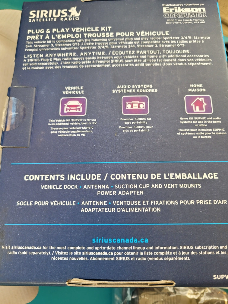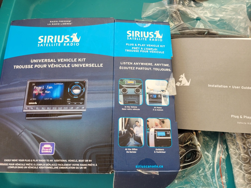 SiriusXM satellite radio mounting kit. Plug & play. Includes antenna, mounts, power adapter, and more. Easily moves to another vehicle, boat, or RV. Keeps the music going no matter what you are with secure mount. All still in packaging other then the mount. fits streamer, sportster and starmate.