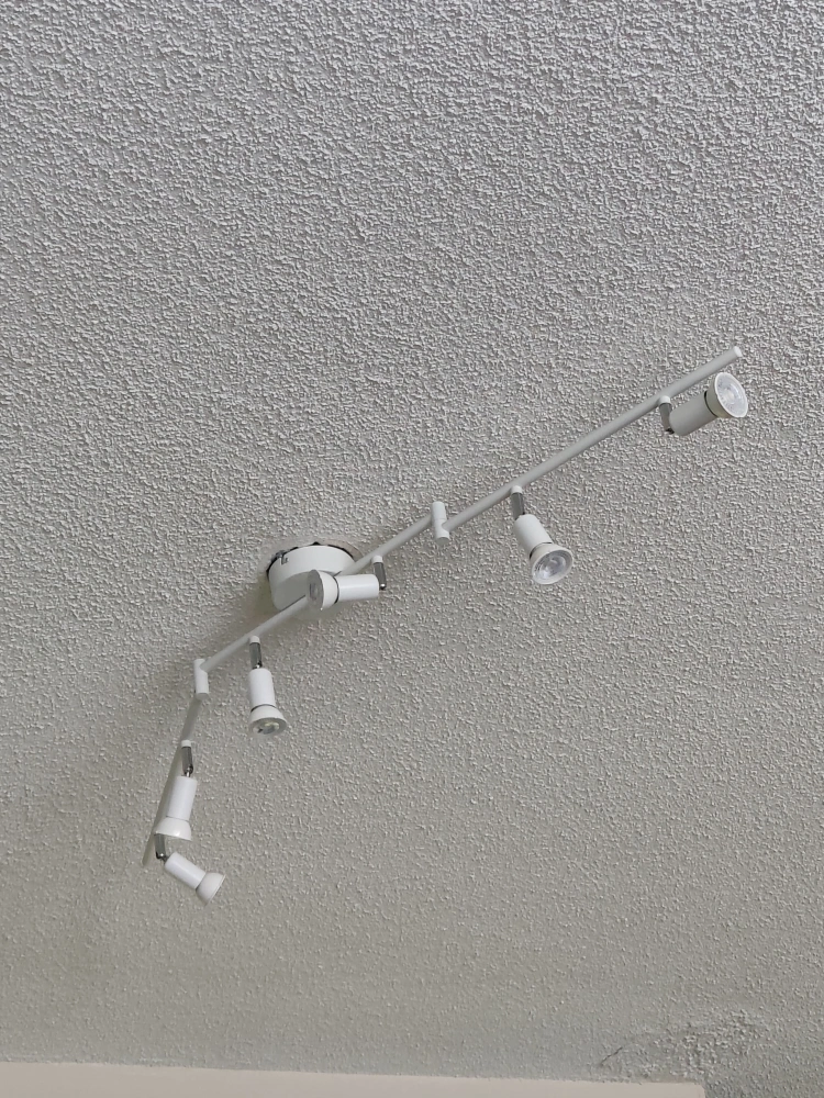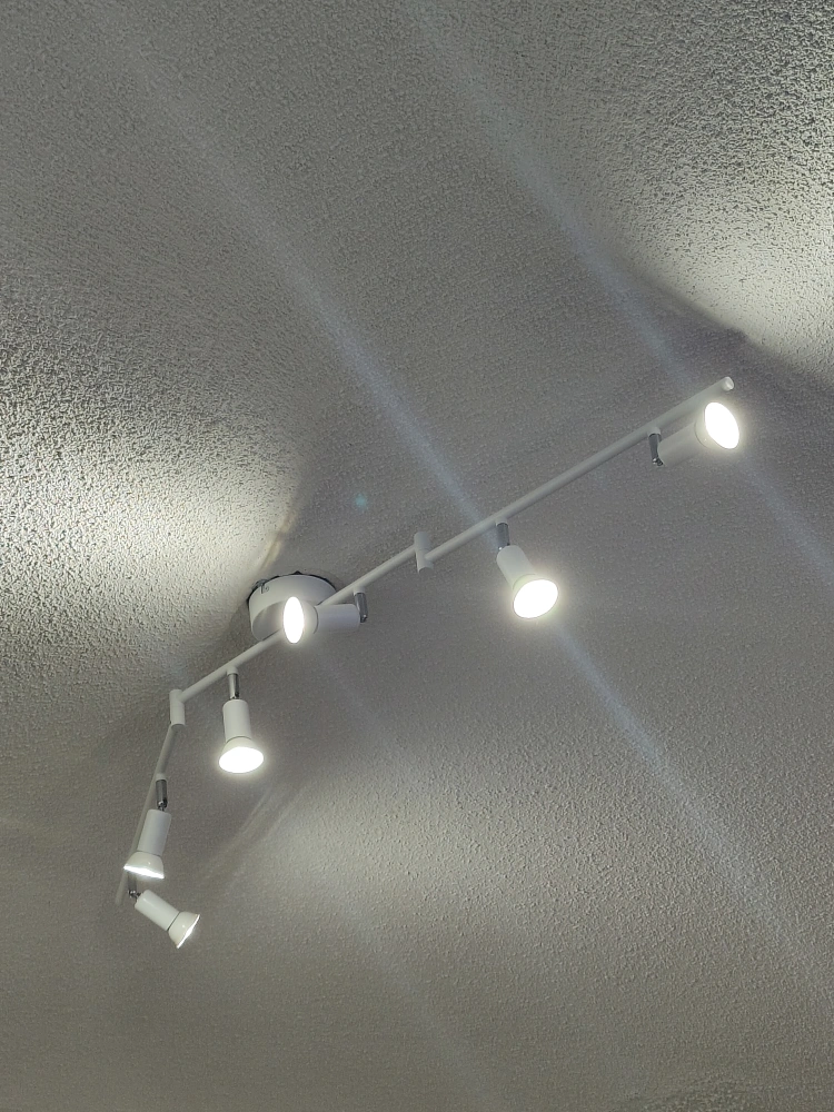 White ceiling-mounted track light. Six adjustable heads. Modern style. Easy installation. Great for kitchens, living rooms, or bedrooms. Does not include bulbs. Can include 6 (5000k) bulbs for 10 extra