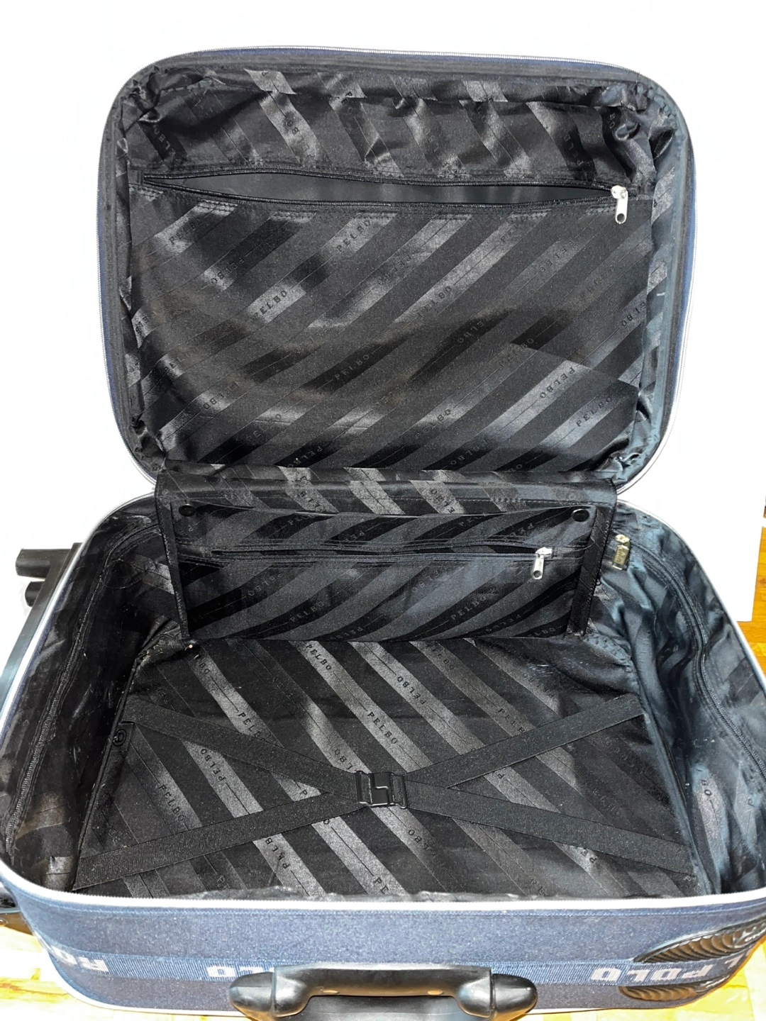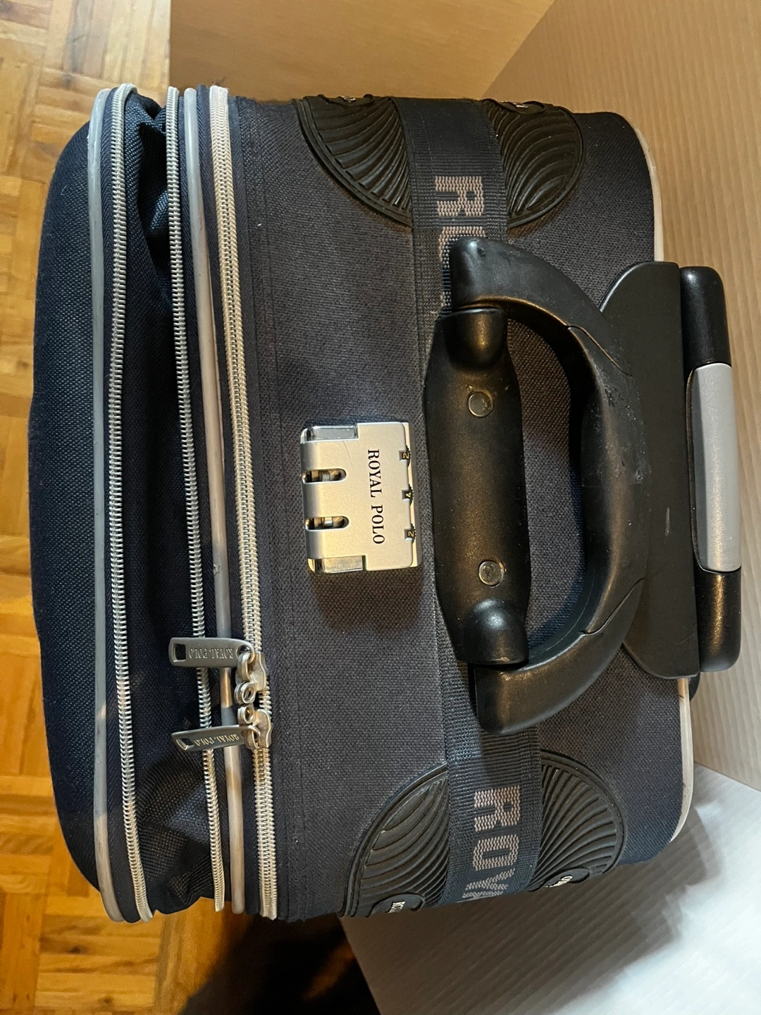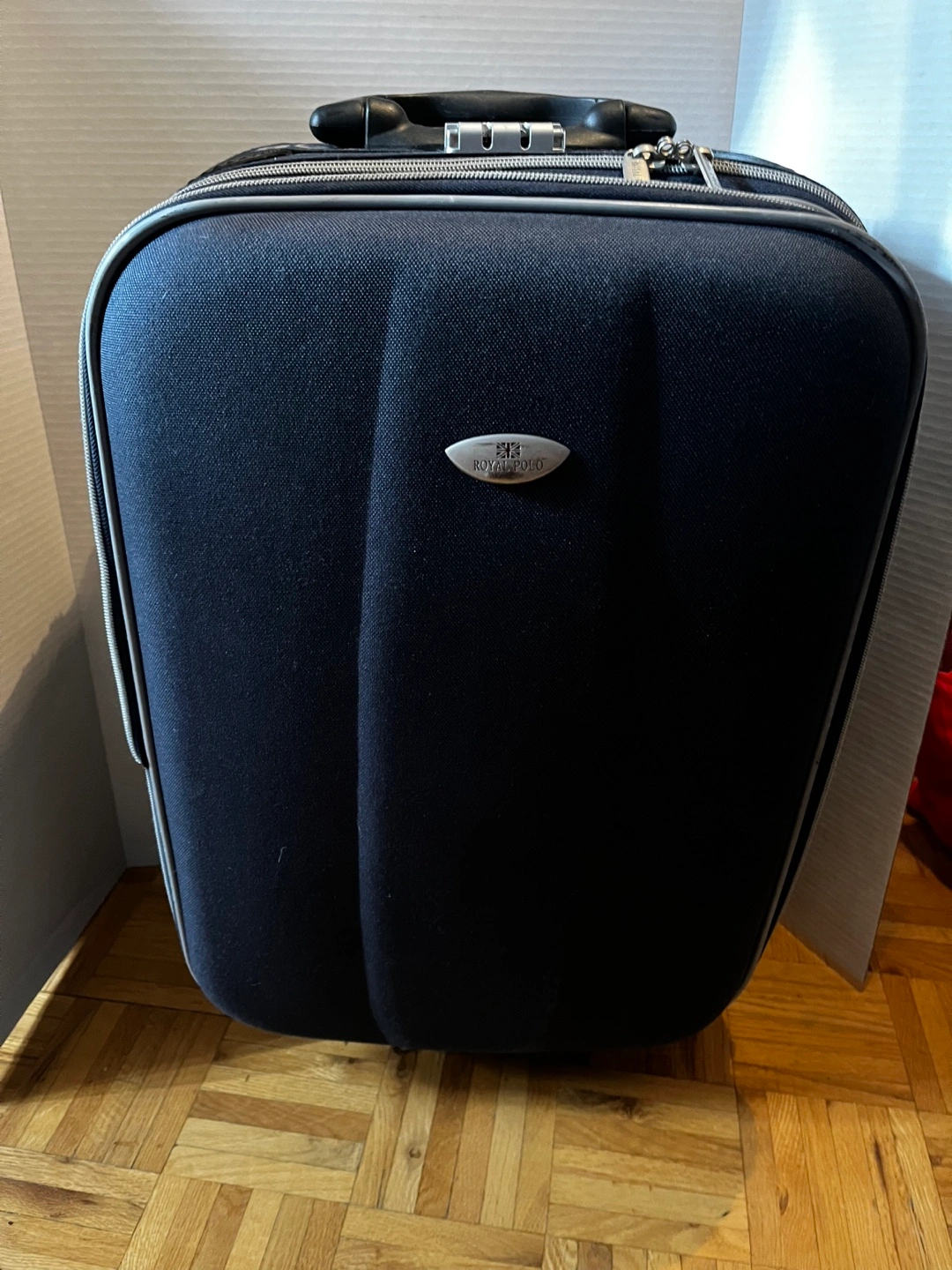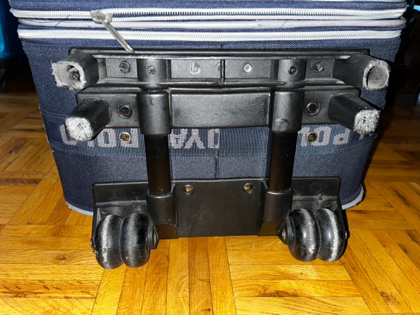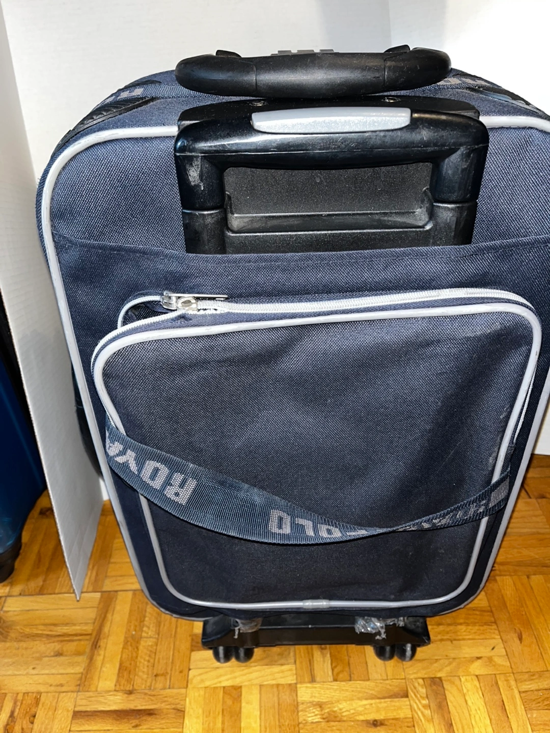 💙Dark blue rolling suitcase. 💙Features two main compartments and several smaller pockets. 💙Combination lock included. 💙22 inches tall. ** the external back pocket zipper is broken 💙everything else in gd condition Pick up only Cash only