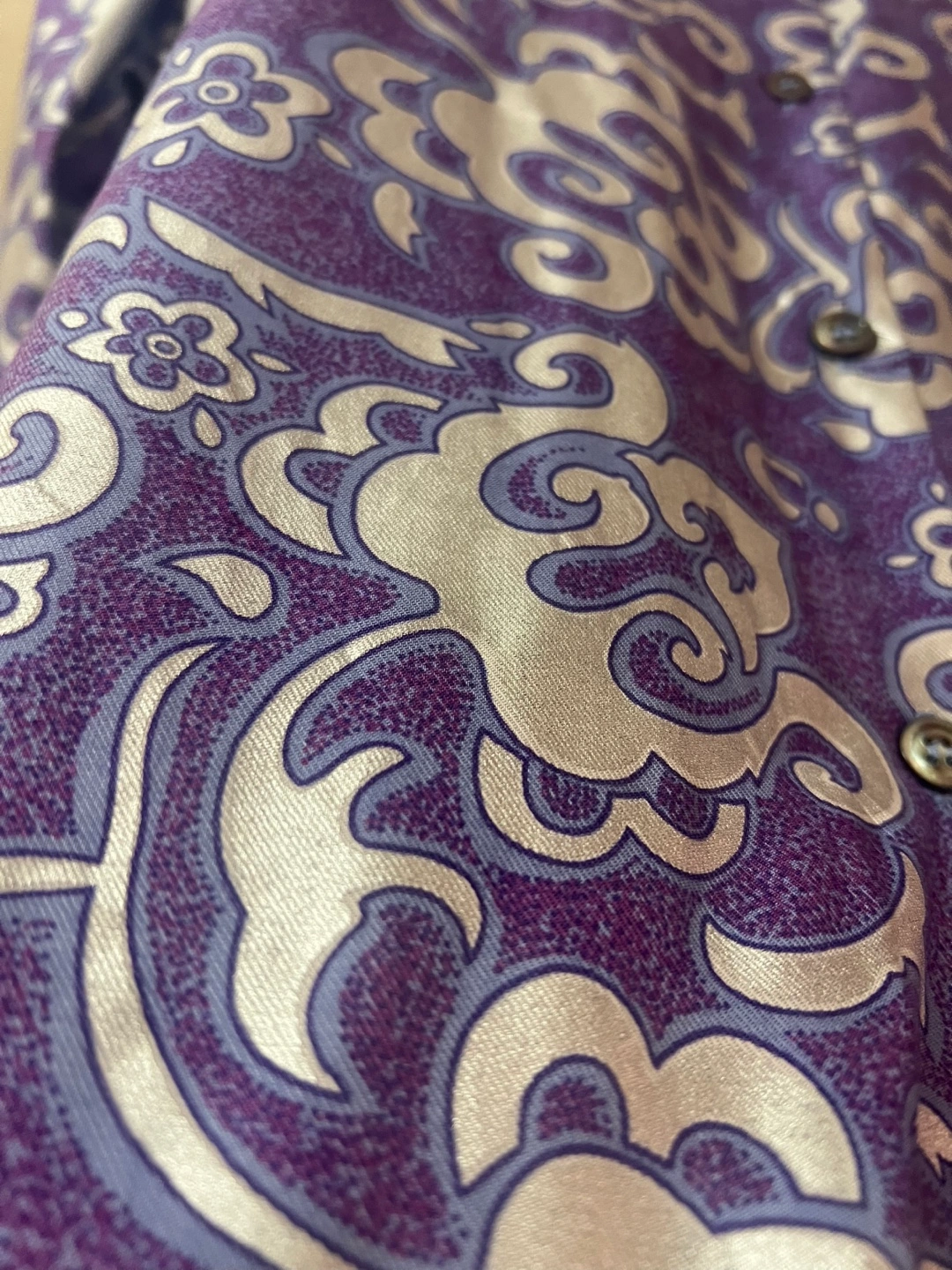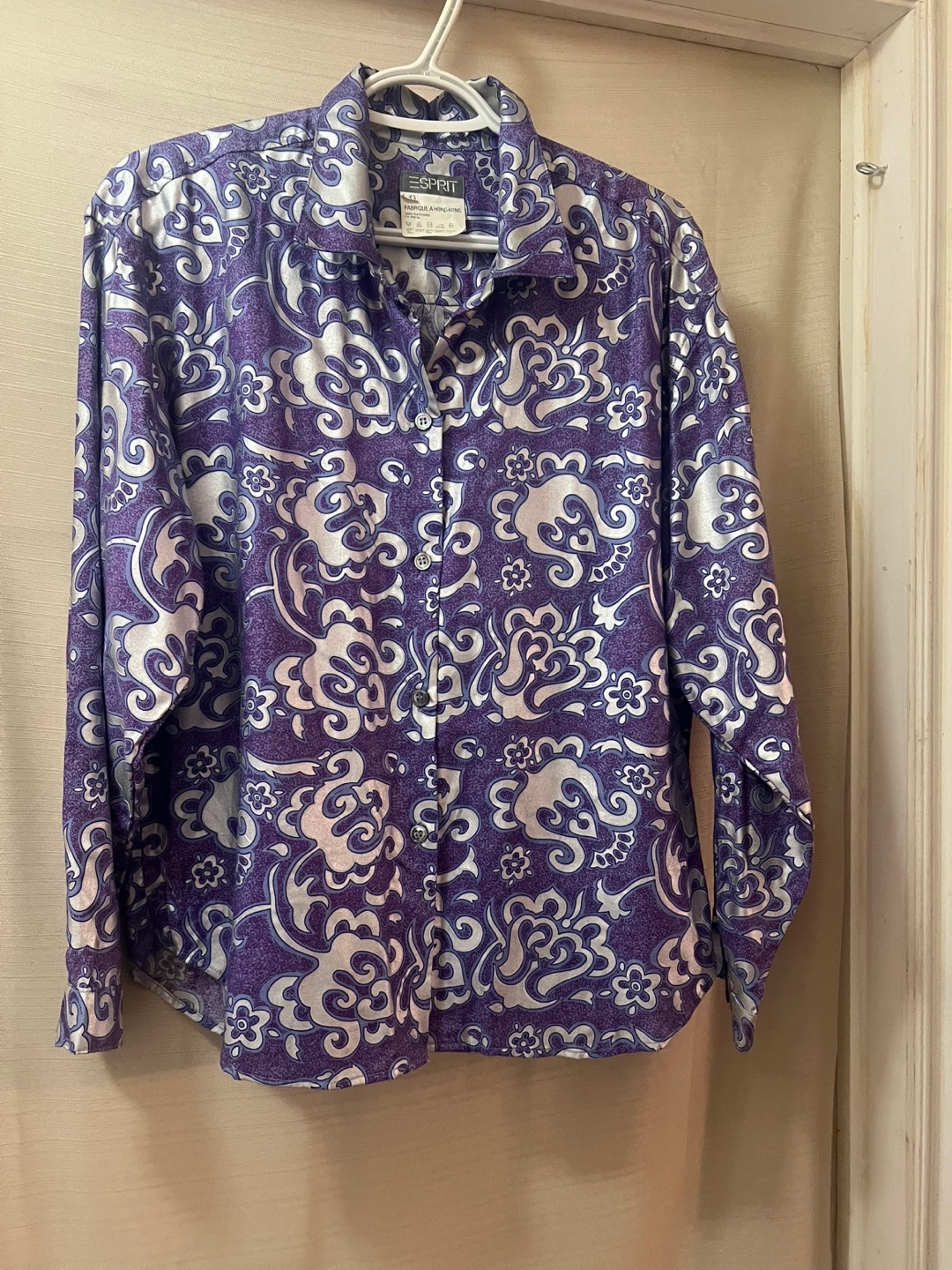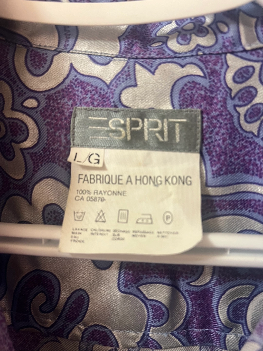 Long-sleeved vintage esprit button-up shirt. Purple and silver paisley print. 100% rayon. Ptp- 23.5 Arm- 21 Length- 26