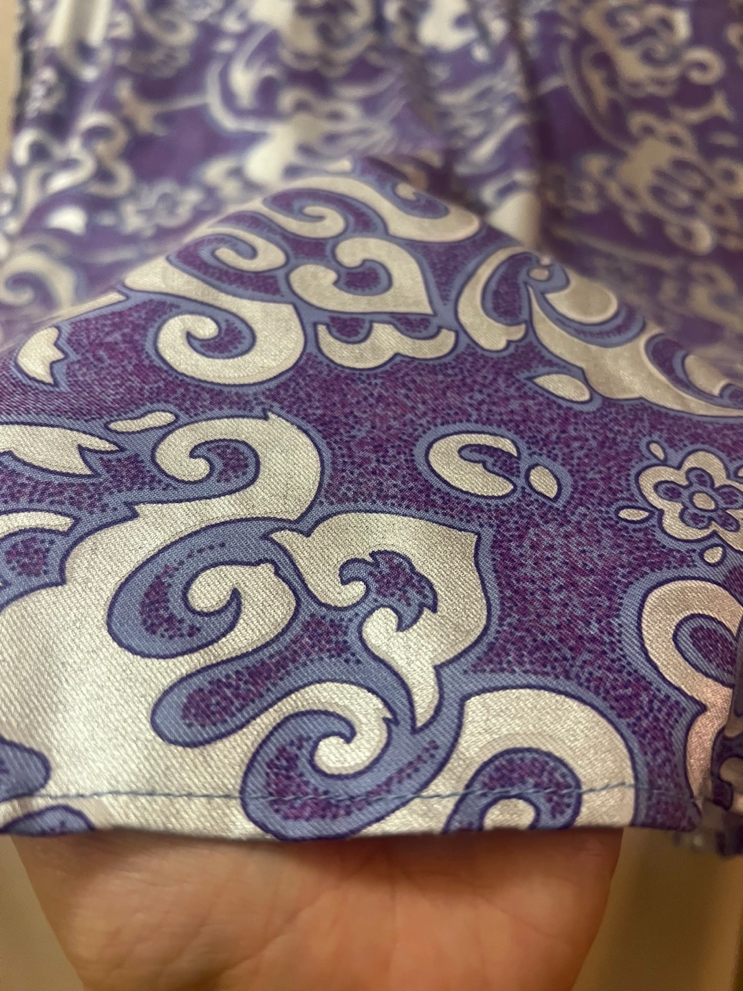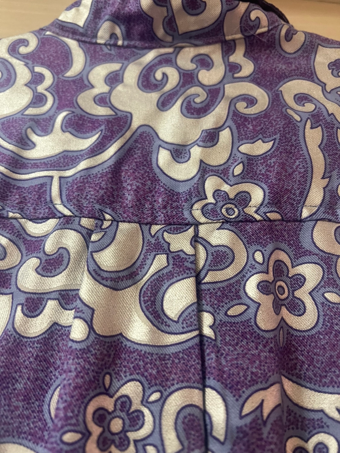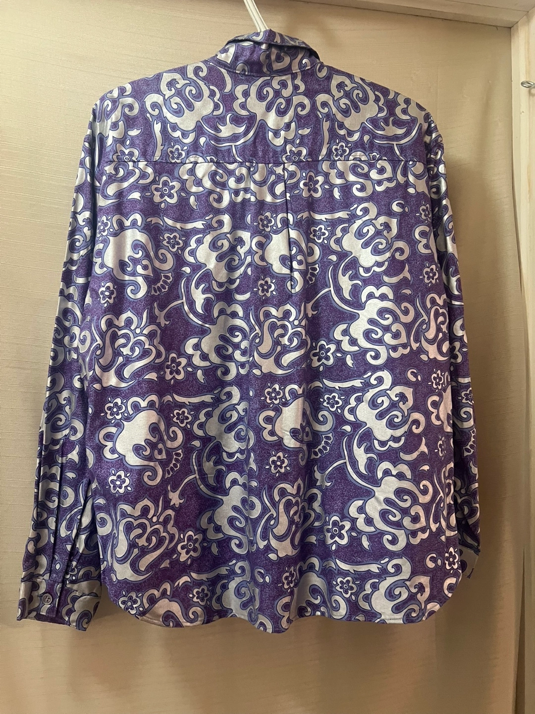 Long-sleeved vintage esprit button-up shirt. Purple and silver paisley print. 100% rayon. Ptp- 23.5 Arm- 21 Length- 26