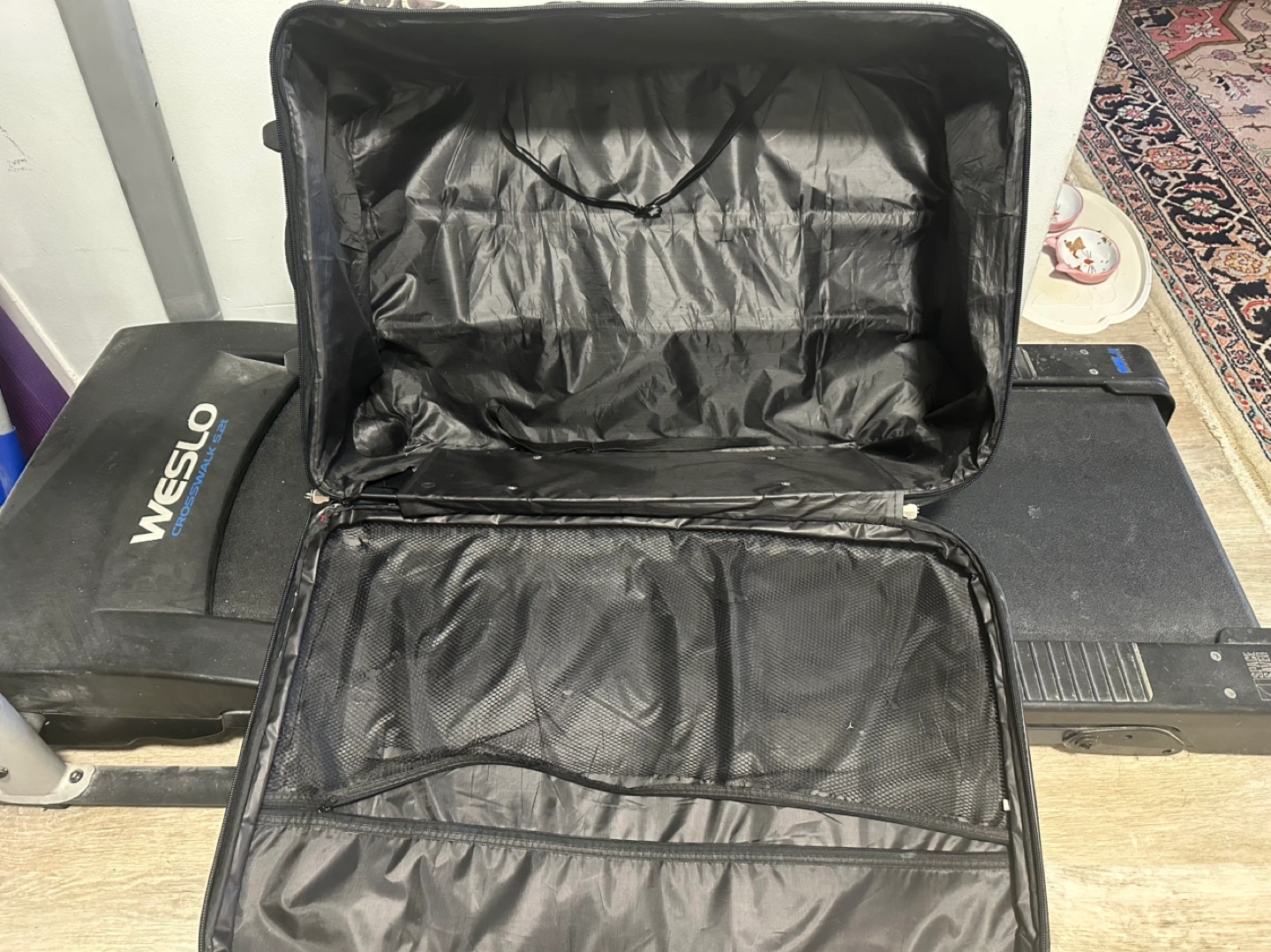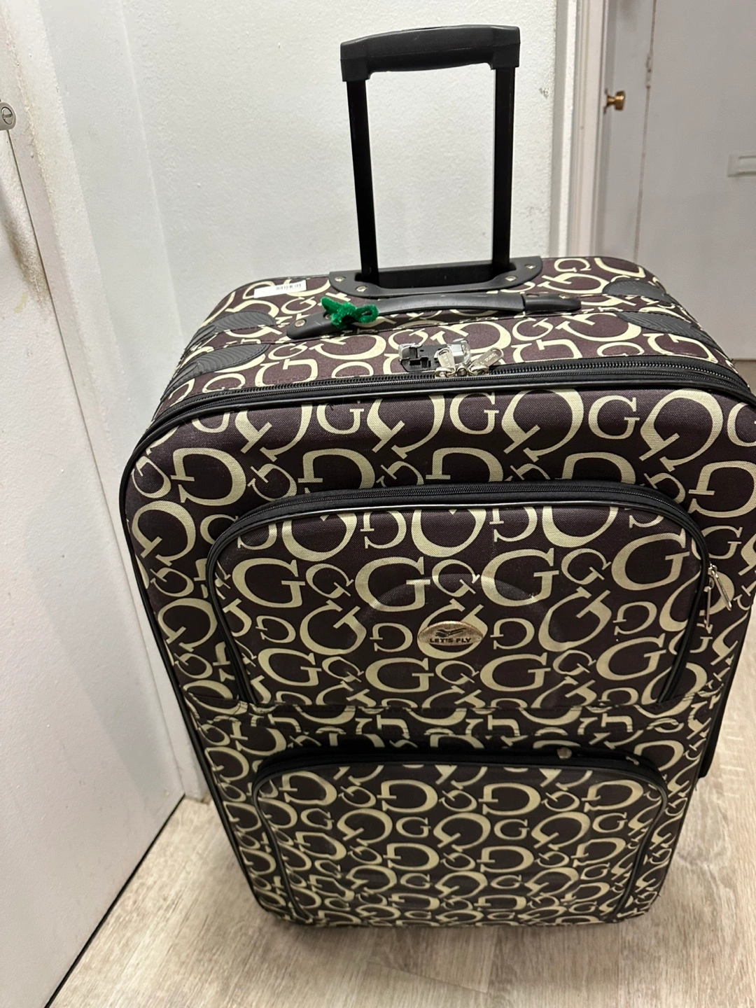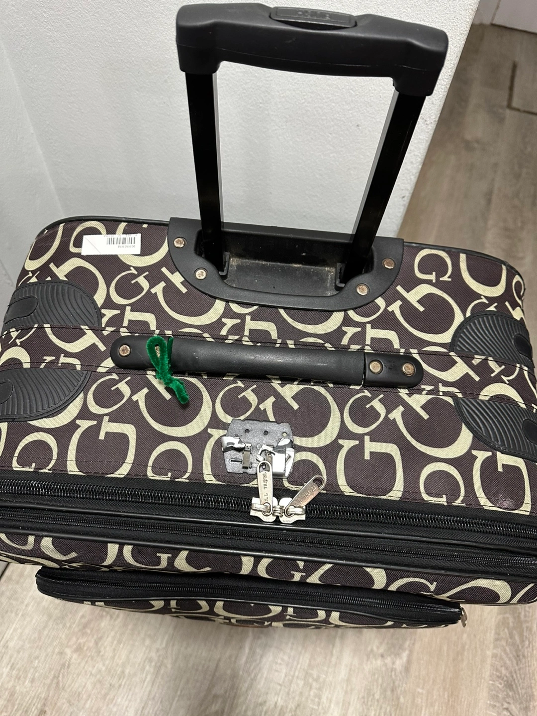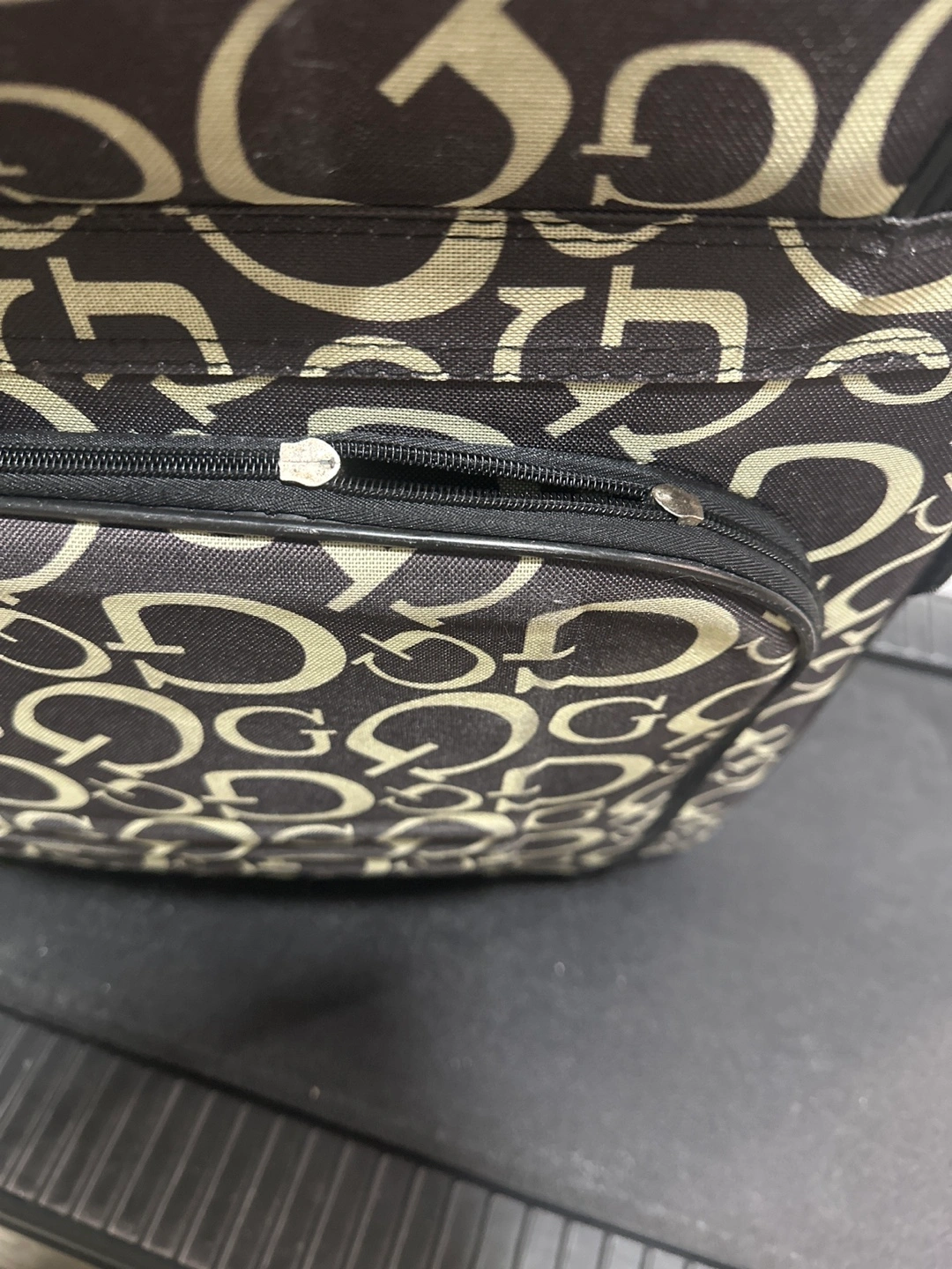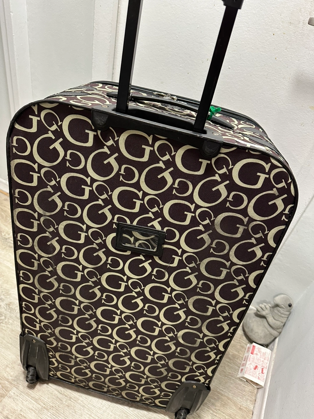 Large rolling suitcase. Brown and beige Guess logo print. Features multiple compartments and a retractable handle. Wheels and zippers appear functional. Only the front lock is broken and the front zipper is missing.