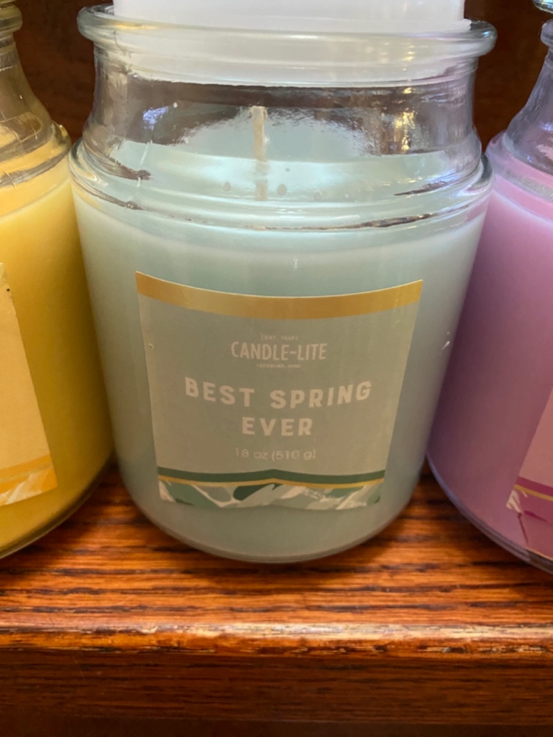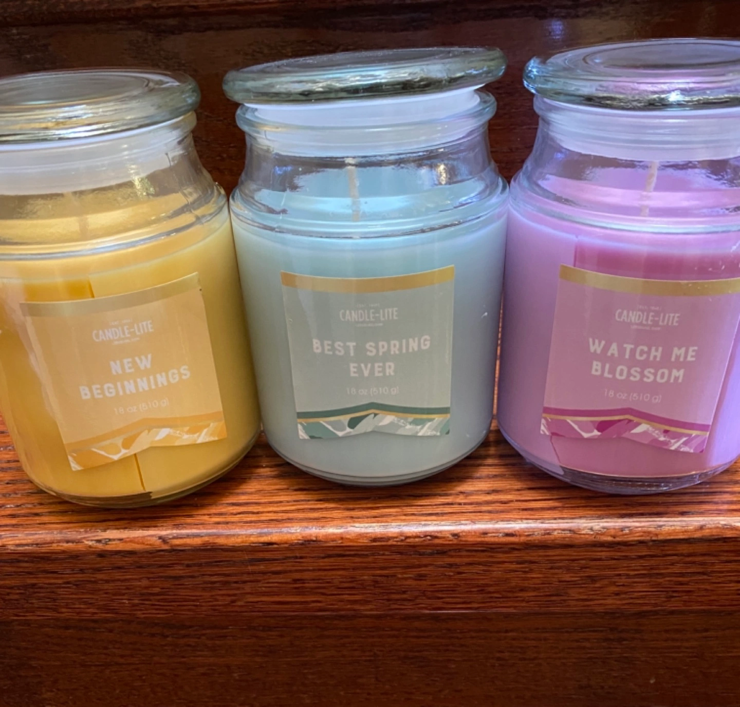 Brand New Set of three Springtime 18 oz Candle-Lite jar candles. Scented candles in yellow, light green, and lilac. Glass jars with lids. New Beginnings, Best Spring Ever and Watch Me Blossom Cash Only