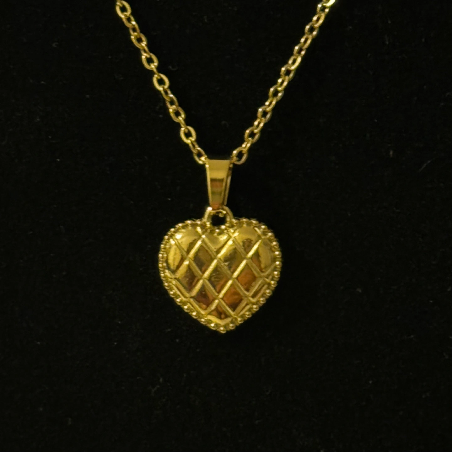 Delicate gold tone necklace. Features a small heart pendant with a quilted pattern. Simple chain. Perfect for everyday wear. Material: Plated Stainless Steel This item is in brand new/unused condition. Please see photos and let me know if you have any questions.