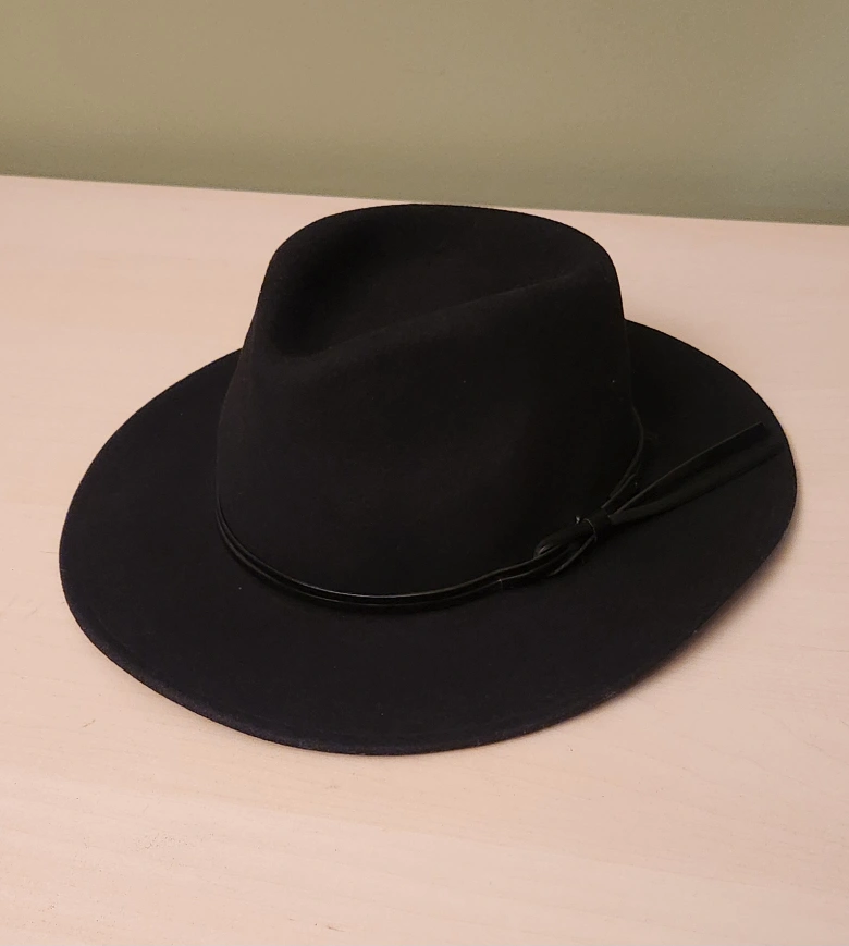 Black felt fedora. Water repellent. 100% wool. Leather band. Good condition.