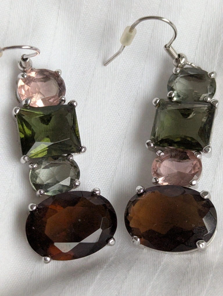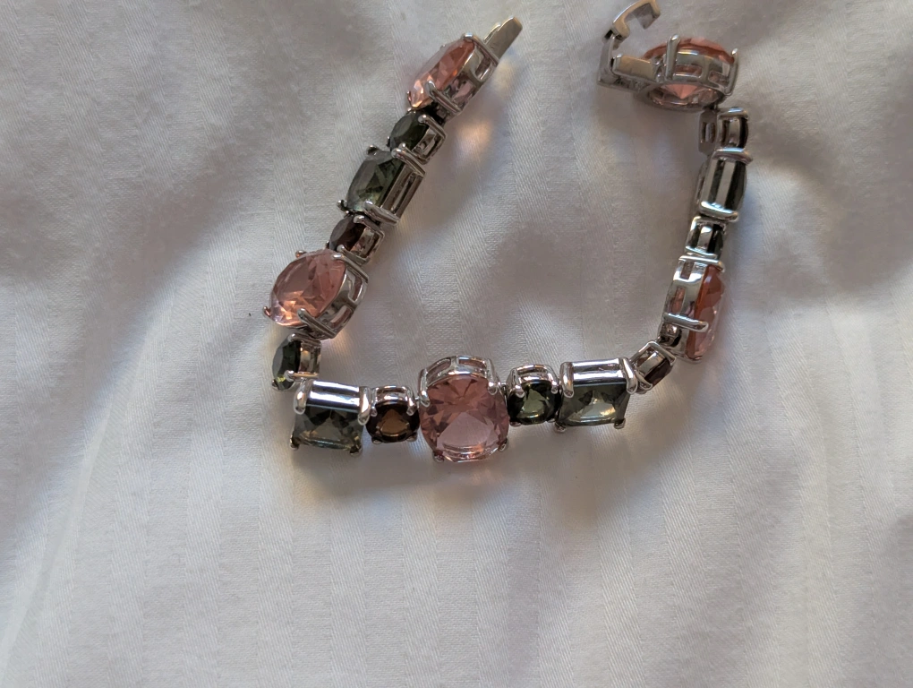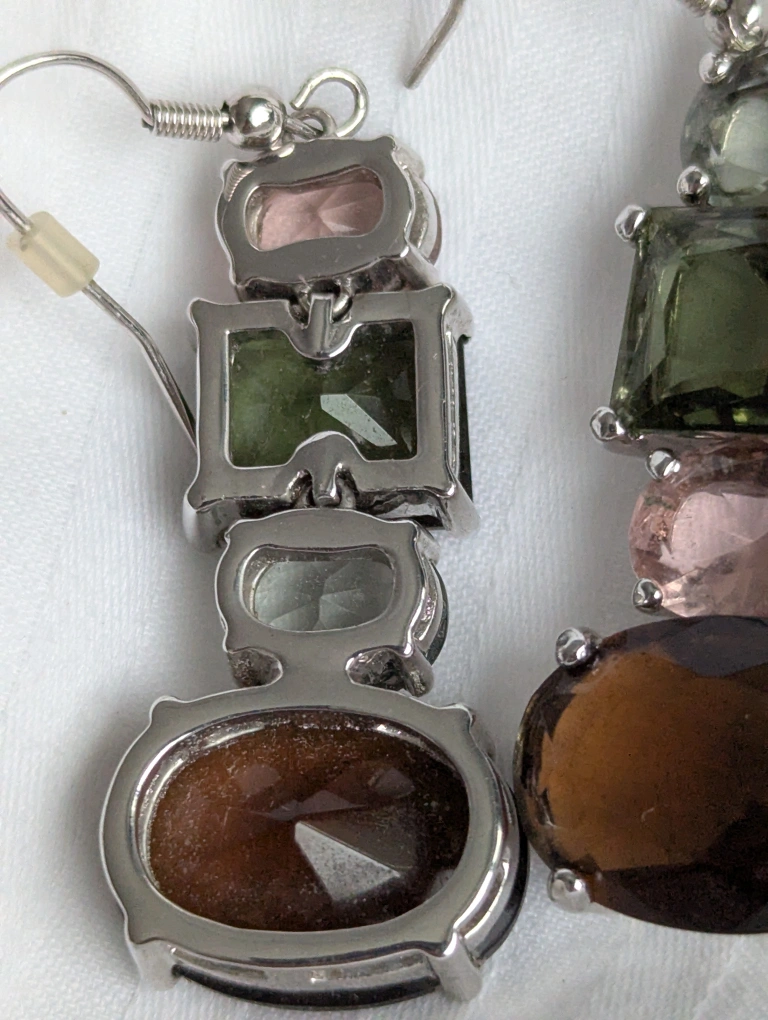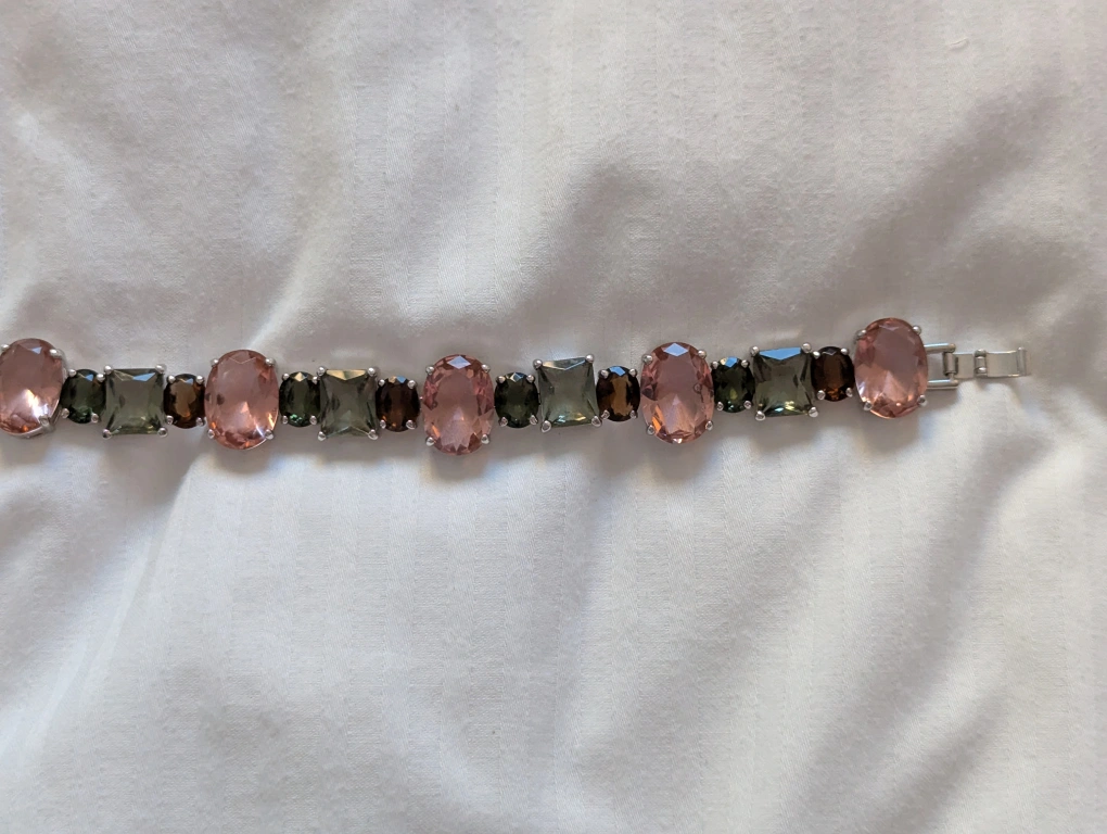 Elegant bracelet featuring pink, green and brown gemstones. Oval and rectangular cut stones. Silver-toned metal. Clasp closure. with matching dangle earrings.