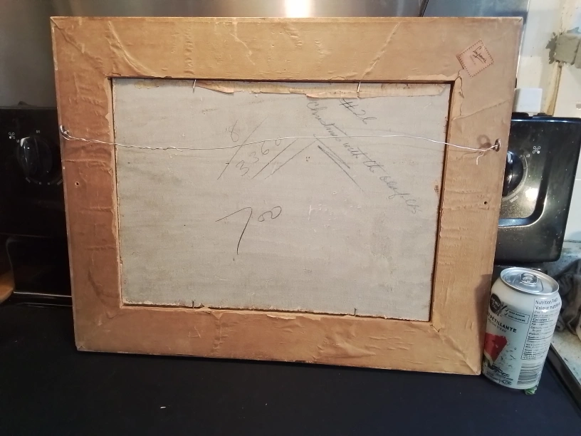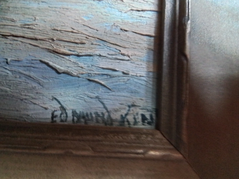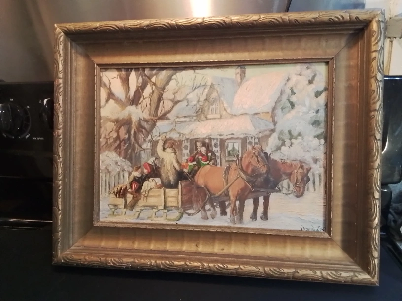 Canadian Vintage Framed Winter Scene Painting by Edmund Kinis Canadian Oil on Board Winter Sleigh Ride Signed Beautiful vintage framed oil painting. Depicts a winter scene with a horse-drawn sleigh. Ornate gold frame. Signed by the artist. Oil on board, framed. The artwork captures a vibrant scene of two individuals in a horse-drawn sleigh, traversing through a snowy landscape. A quaint cottage nestles in the background, surrounded by leafless trees that suggest the chill of winter. Signed on bottom right corner. Inscription on verso. 24 cm x 34 cm (9 1/2" x 13 1/2"), F:37 cm x 46 cm (14 1/2" x 18") Estimate 150.00 - 300.00 USD Pickup at Young Street and Steels Ave