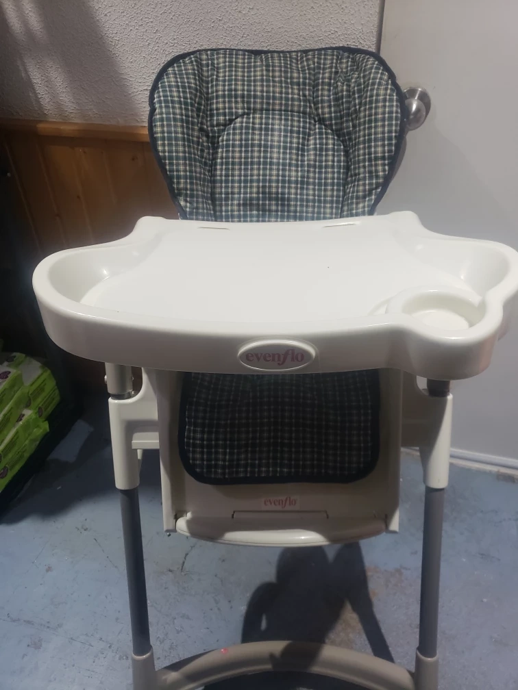 Evenflo high chair. Features a removable tray, padded seat and is on wheels. Great for feeding babies and toddlers. Shows some wear.