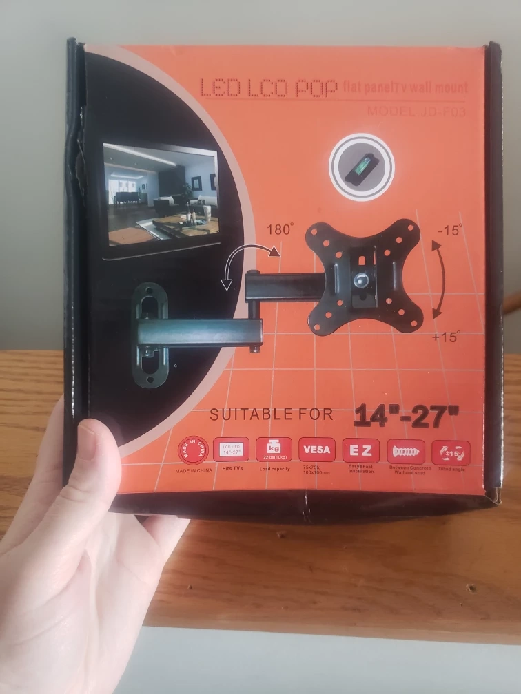 New in box. Suitable for 14"-27" TVs. VESA compliance: 50x50mm, 75x75mm, 100x100mm. Load capacity: 22lbs (10kg). Tilts up and down 30°. Left and right 180°. Arm length: 300mm. Includes all mounting hardware and level.