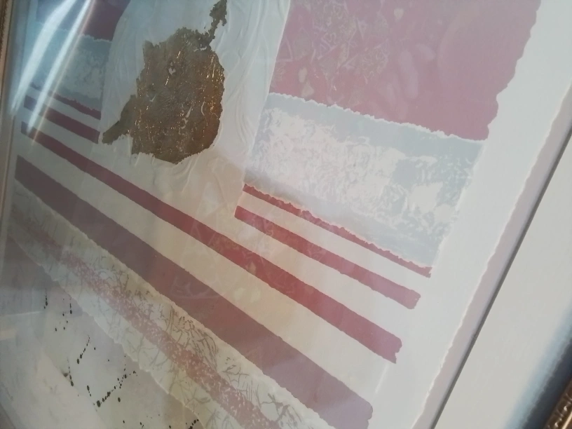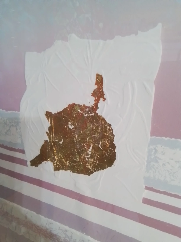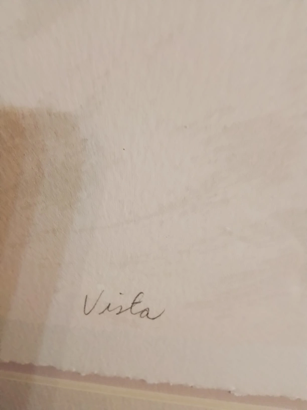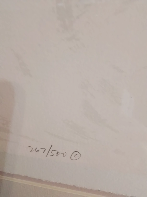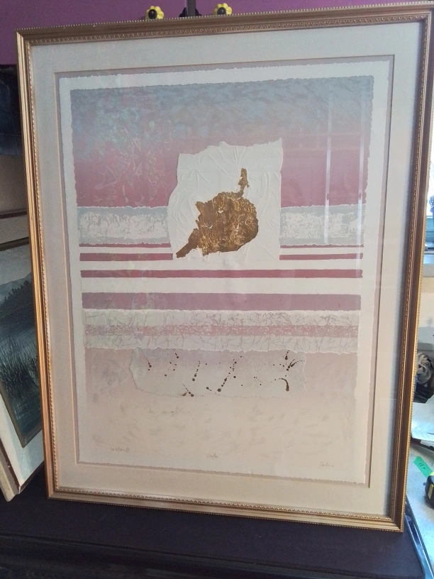 Serigraph on Paper Signed Ricardo Calero 267/500 Serigraph on paper, framed. The composition features an abstracted landscape, with a central golden shape set against a pale, hazy background. The use of soft, muted tones and repetitive horizontal lines creates a serene, contemplative atmosphere. Signed Calero on bottom right corner. "Vista" inscribed on bottom; "267/500" inscribed on bottom left corner. Label on verso of California Fine Art Publishing. Attributed to Ricardo Calero (1955-). 64 cm x 45 cm (25 1/4" x 17 3/4"), F: 81 cm x 63 cm (32" x 25") Large framed art serigraph. Features gold leaf and pastel colours. Signed and numbered 267/500. Beautiful piece for your home. Estimate 150.00 - 300.00 USD Pickup at Young Street and Steels Ave