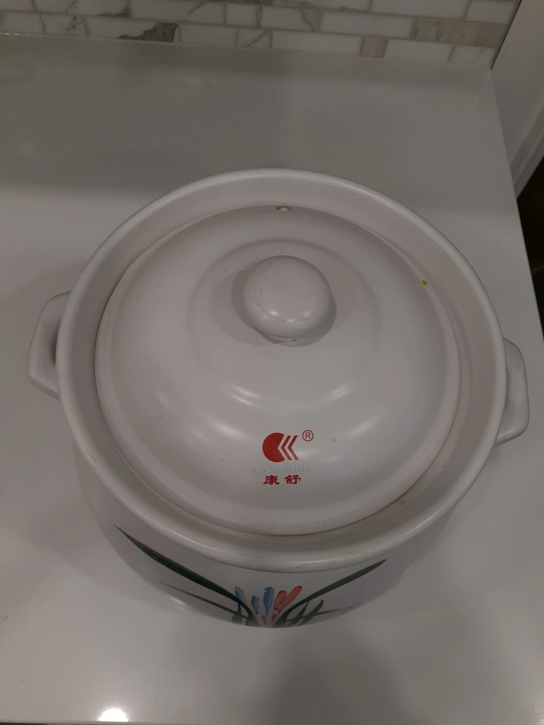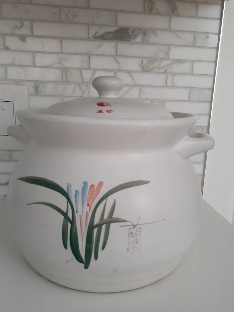 Large ceramic pot, 8 Qrt white with floral design. Features two handles and a fitted lid. Suitable for stovetop. Good used condition. Height: 8" Widest circumference: 32" Cash and Pickup close to Willowdale middle school only.