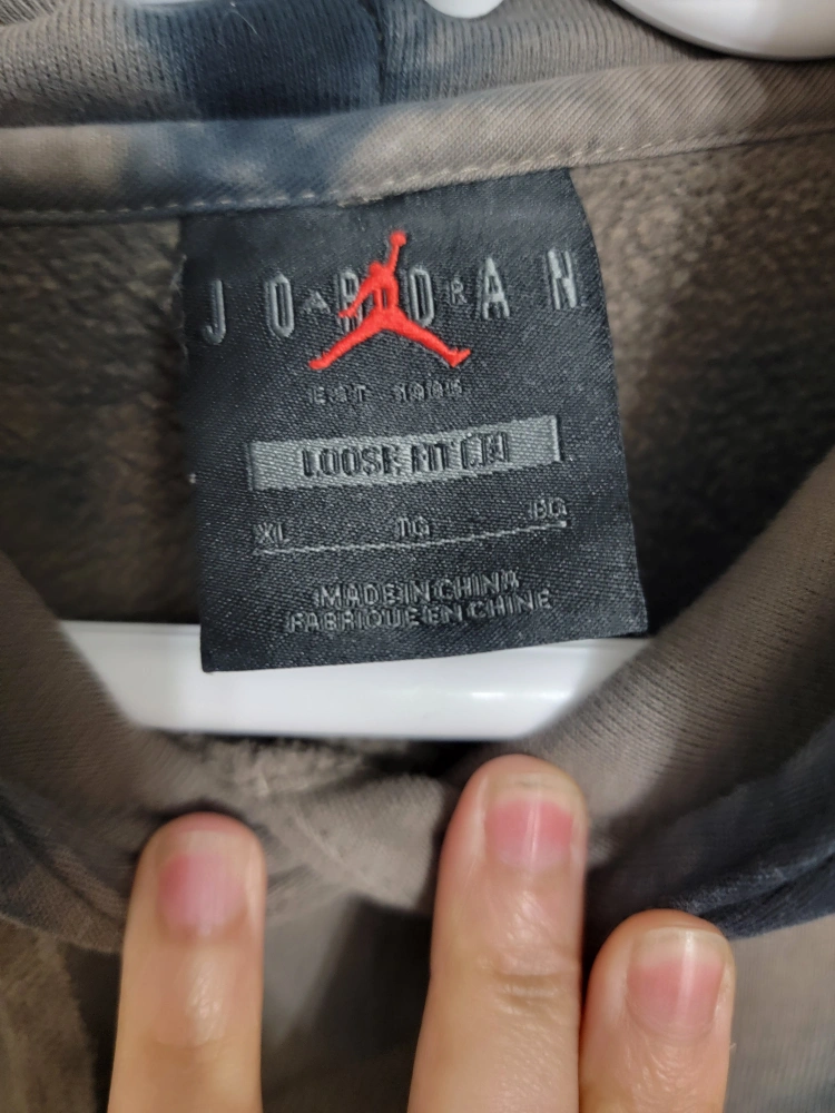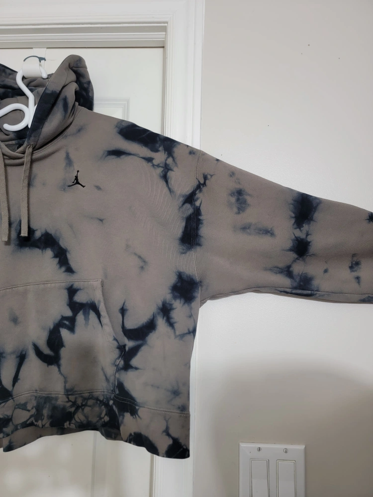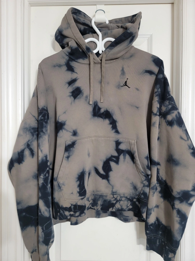 Jordan Brand hoodie. Loose fit. Tie-dye pattern in grey and black. Features a kangaroo pocket and drawstring hood. heavy cotton.