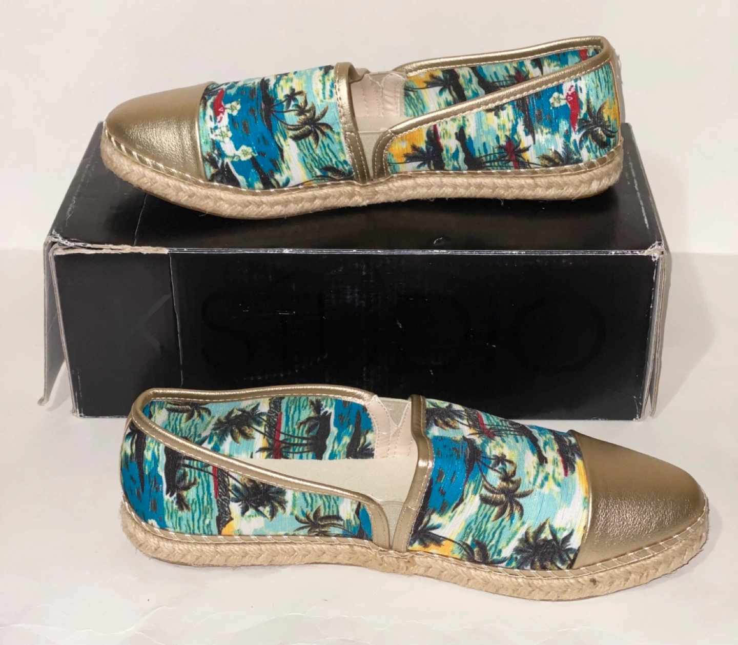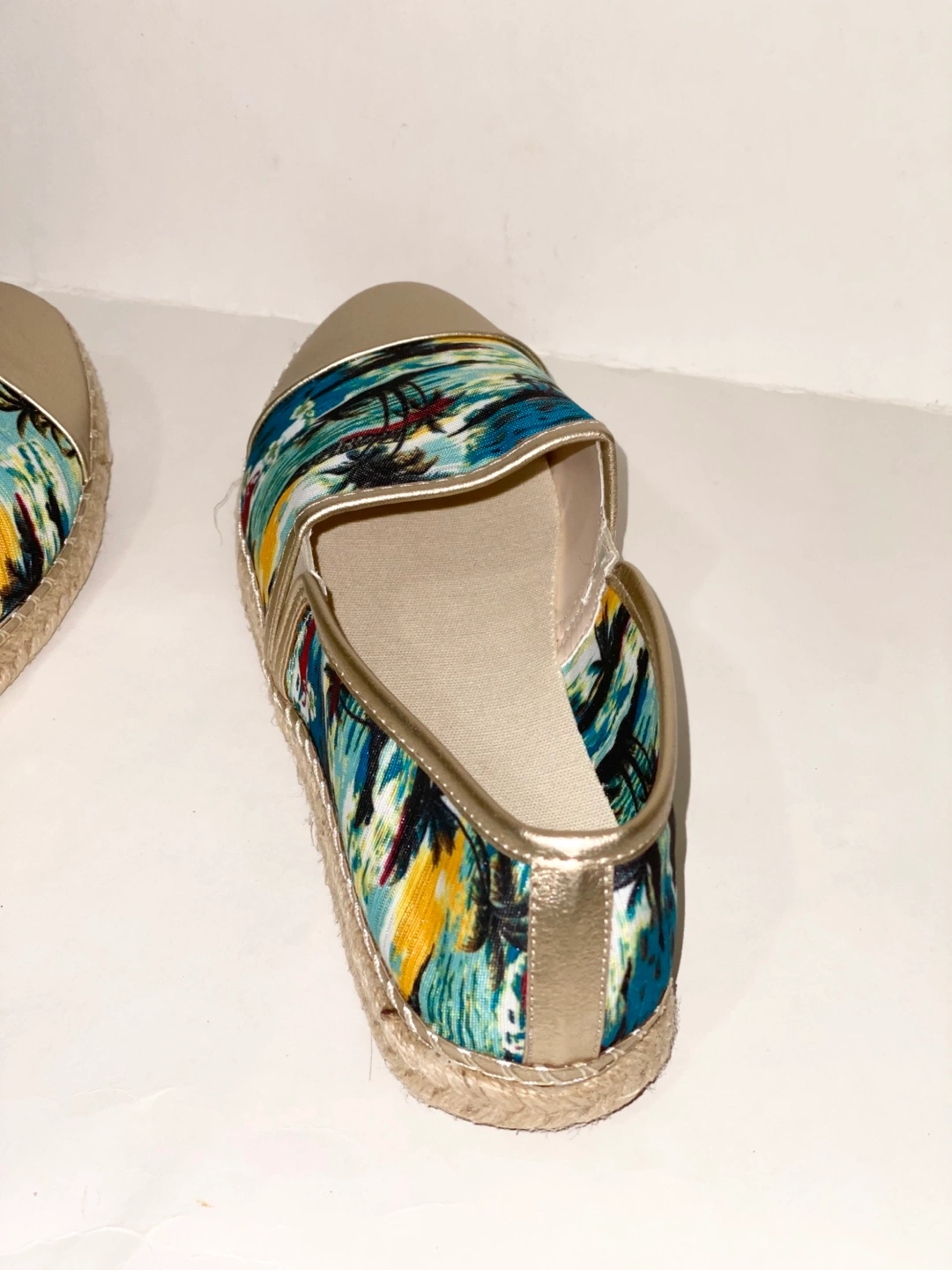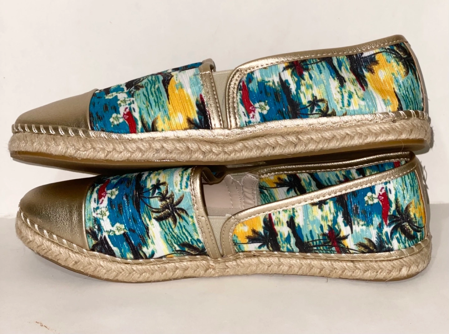 Pair of women's slip-on espadrilles. Gold metallic toe and heel. Tropical print fabric upper. Lightweight and comfortable. Size 9. Pickup in Chinguacousy and Remembrance.
