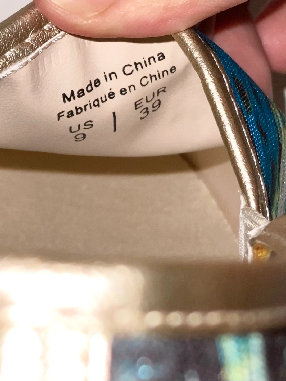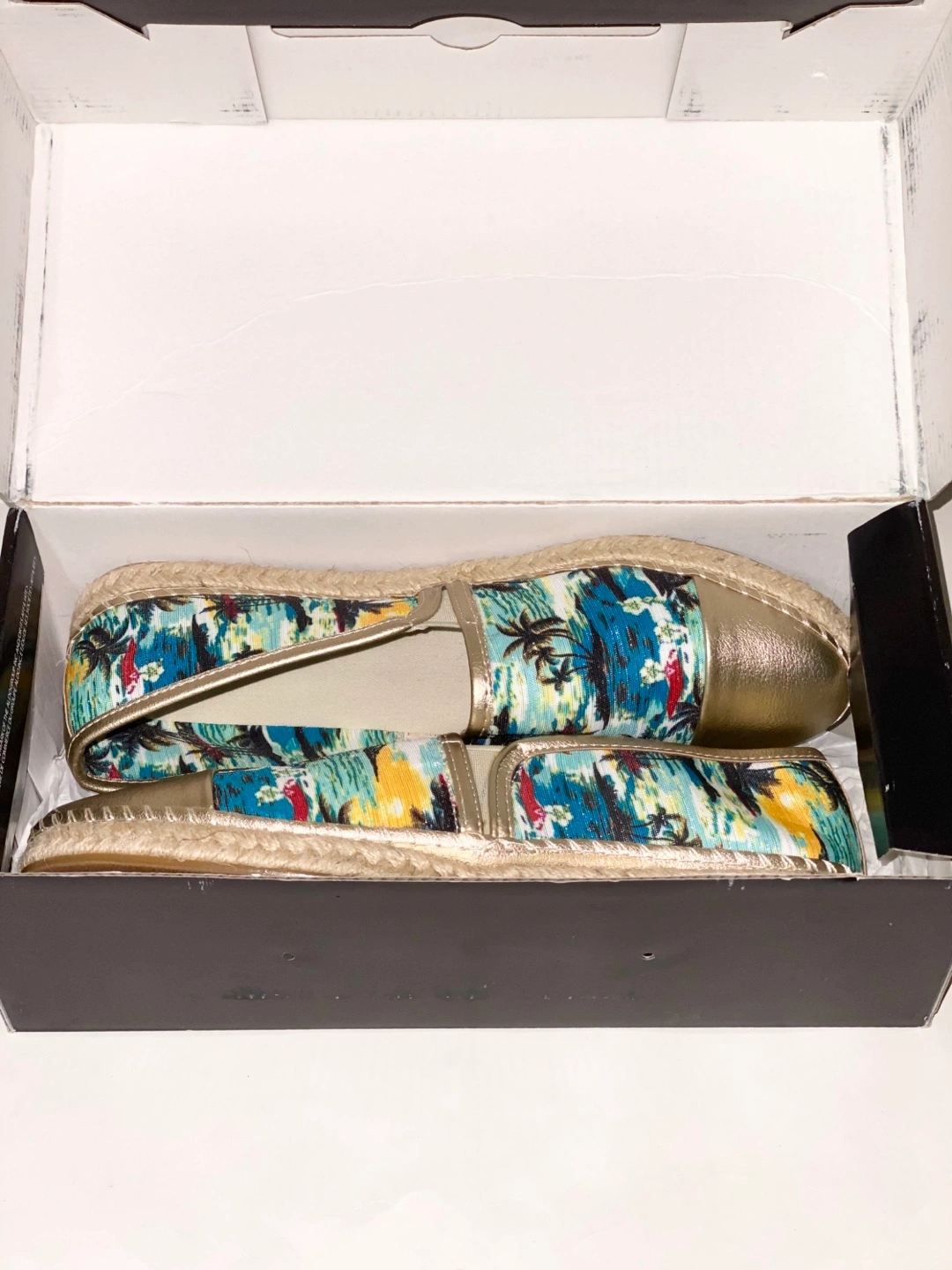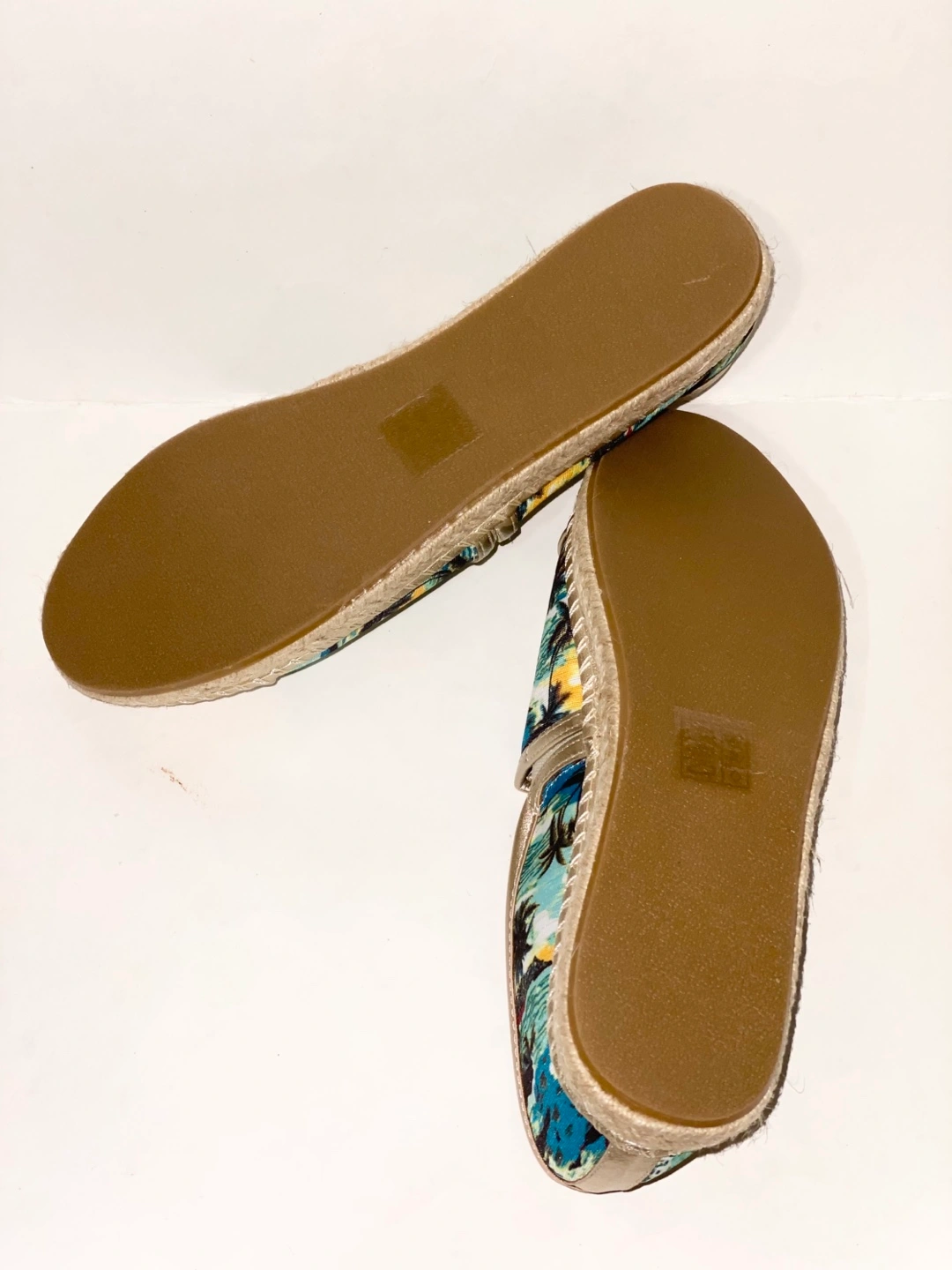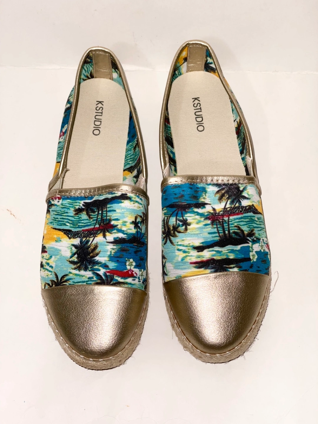 Pair of women's slip-on espadrilles. Gold metallic toe and heel. Tropical print fabric upper. Lightweight and comfortable. Size 9. Pickup in Chinguacousy and Remembrance.