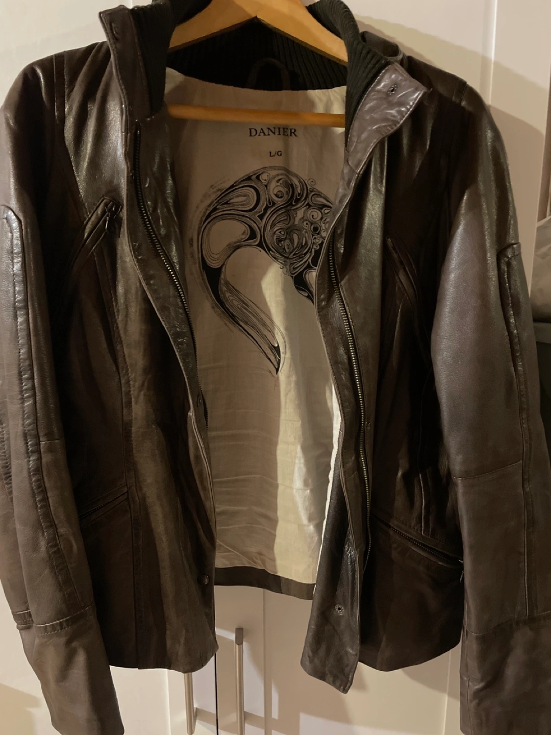 Brown leather jacket. Size large/grande. Features zipper closure and pockets. Soft leather.