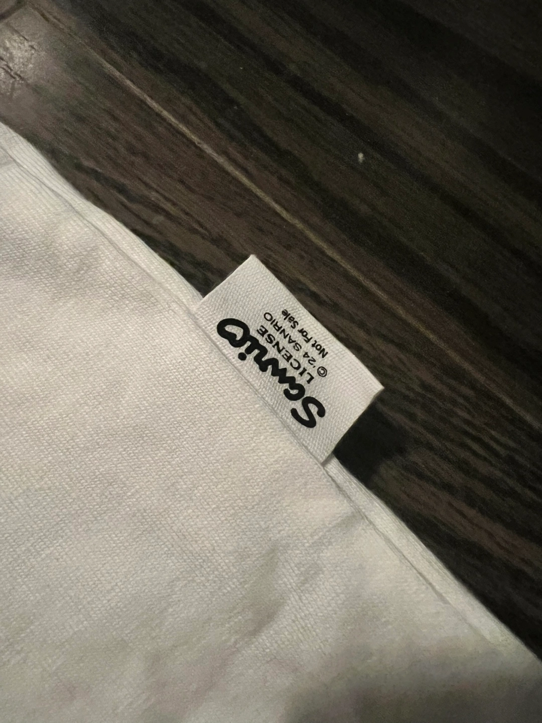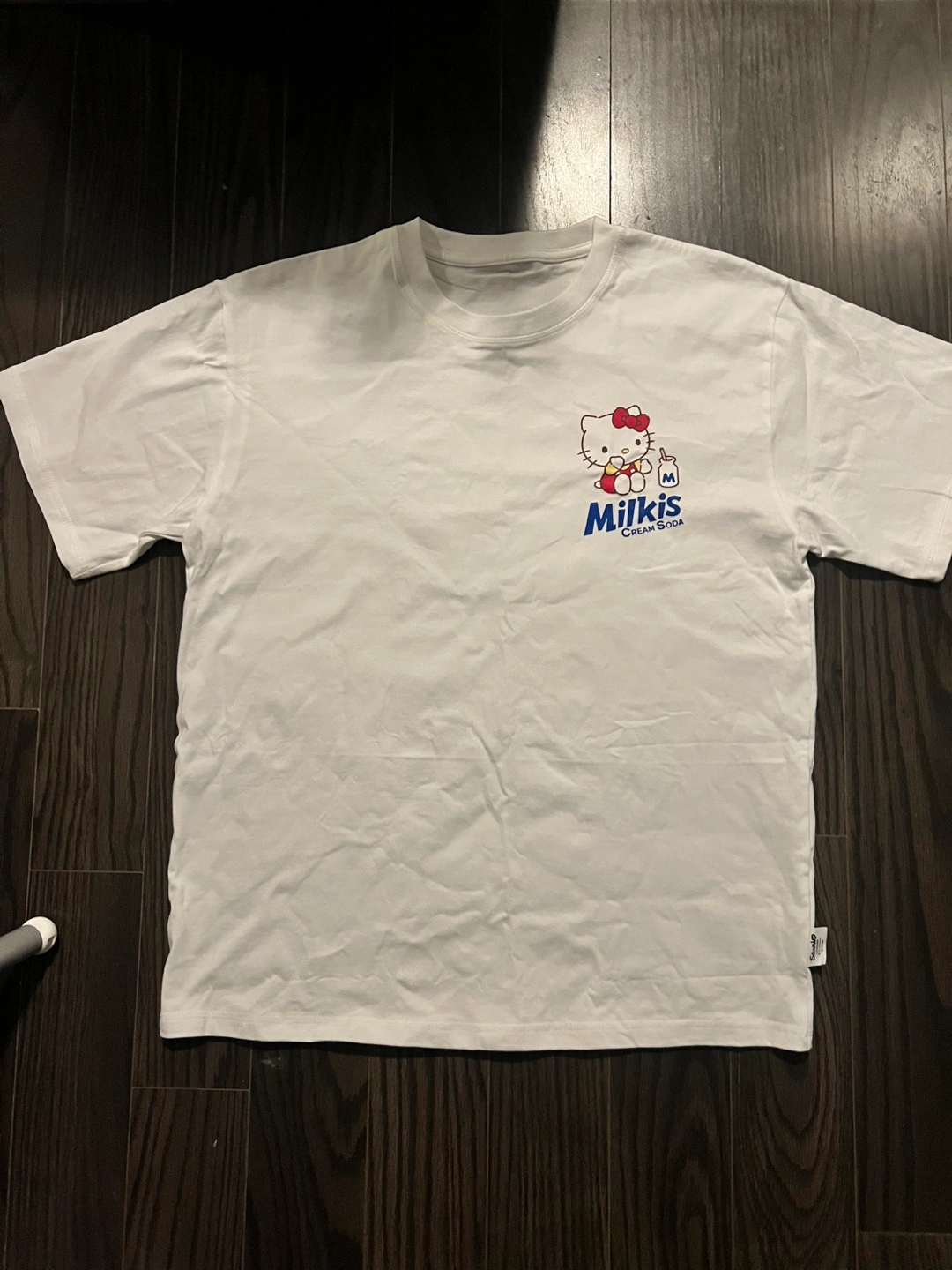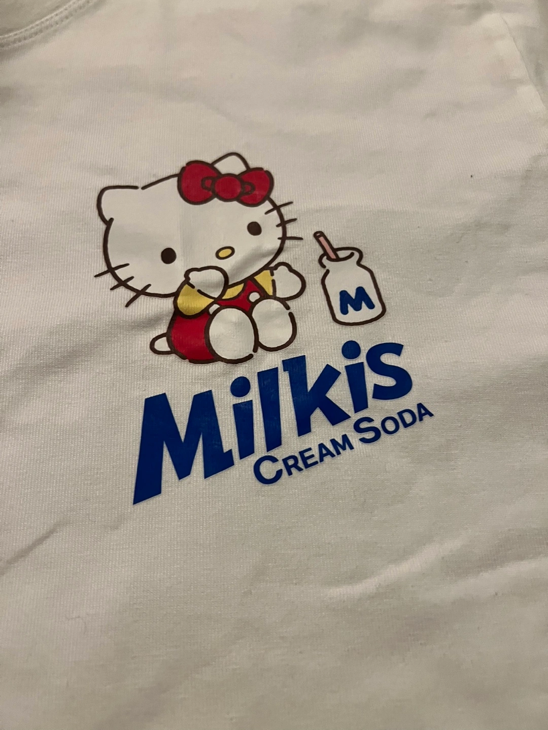 White short sleeve t-shirt. Features Hello Kitty and Milkis Cream Soda graphic. Adult size.