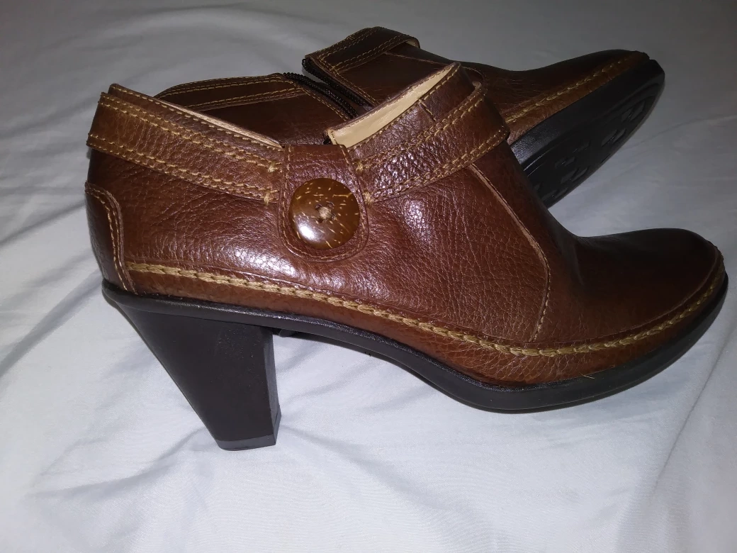 Brown leather ankle boots. Side zipper closure. Small button accent. Block heel. N5 Comfort insole.