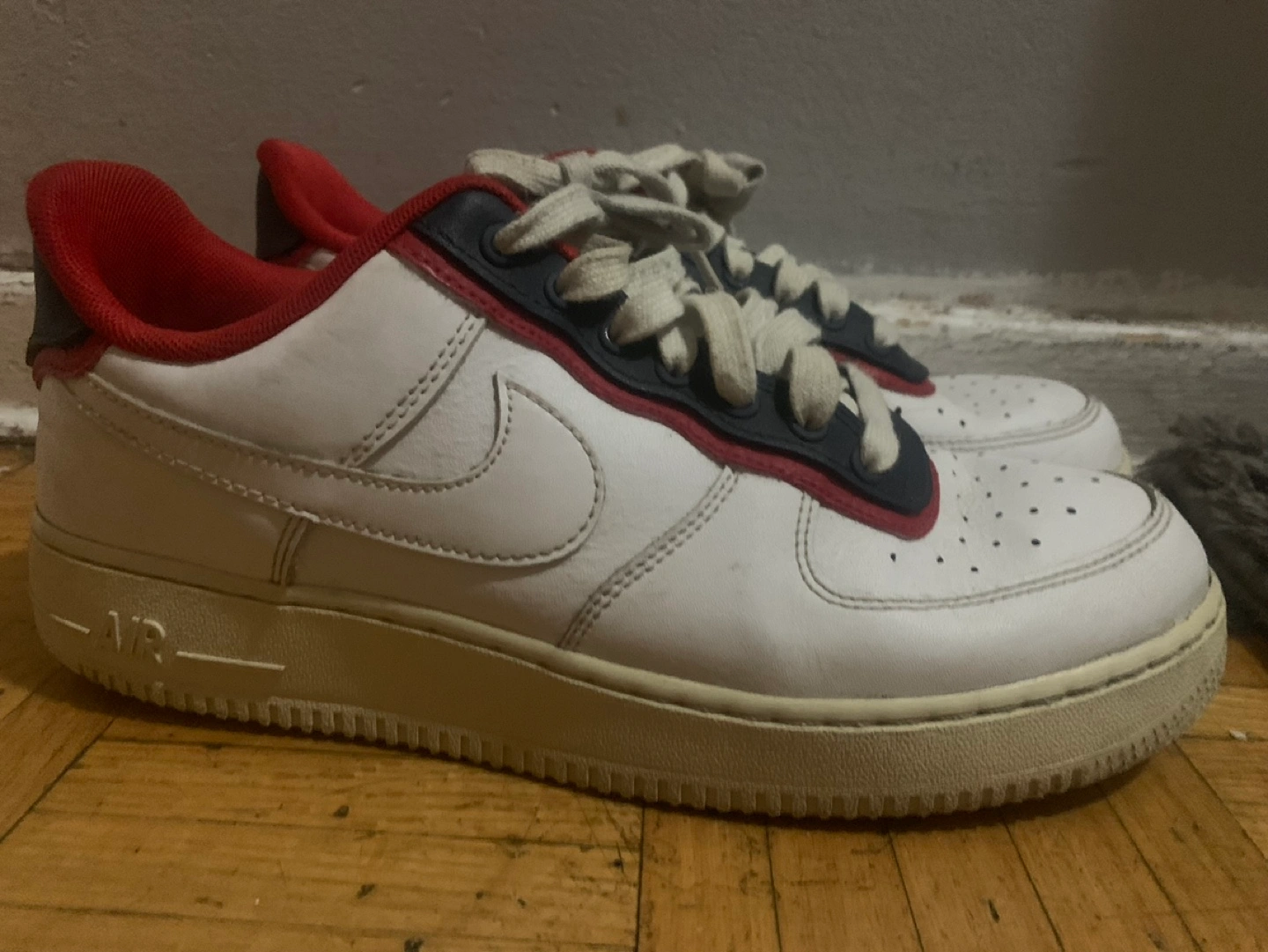 Pair of white leather Nike Air Force 1 '07 sneakers. Red and navy accents. Cream sole. Pre-owned. Open to trades only if I’m winning