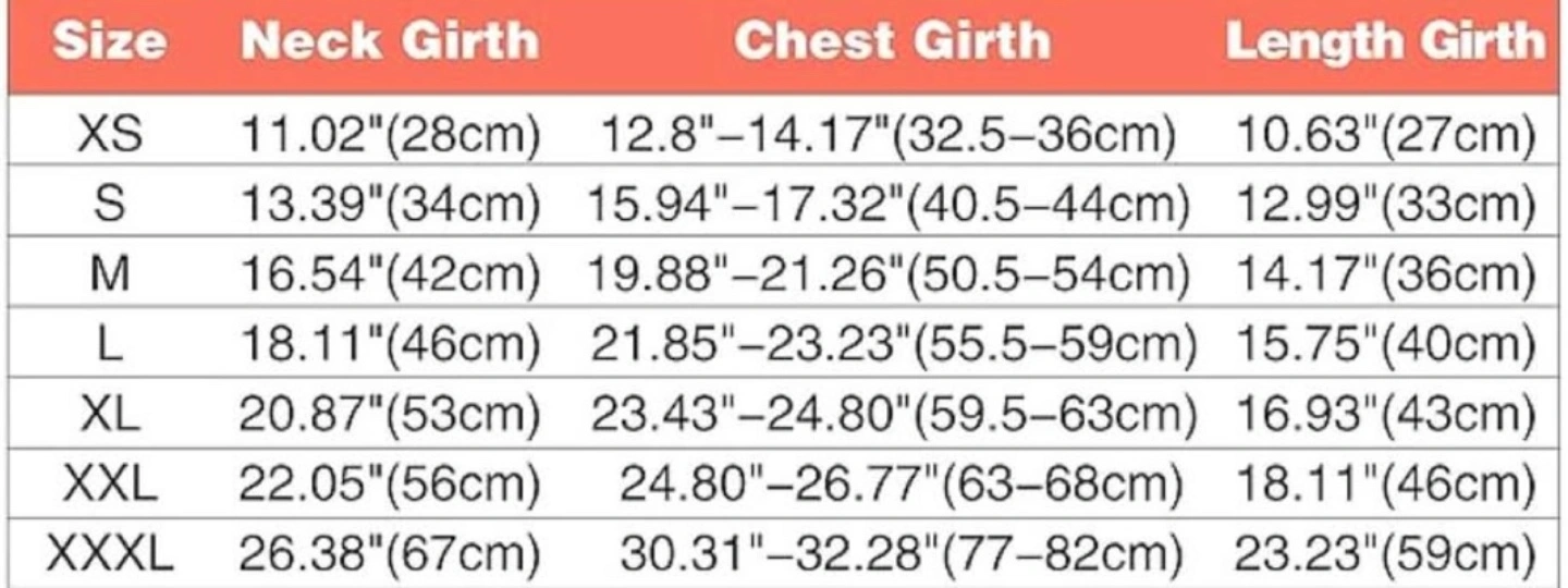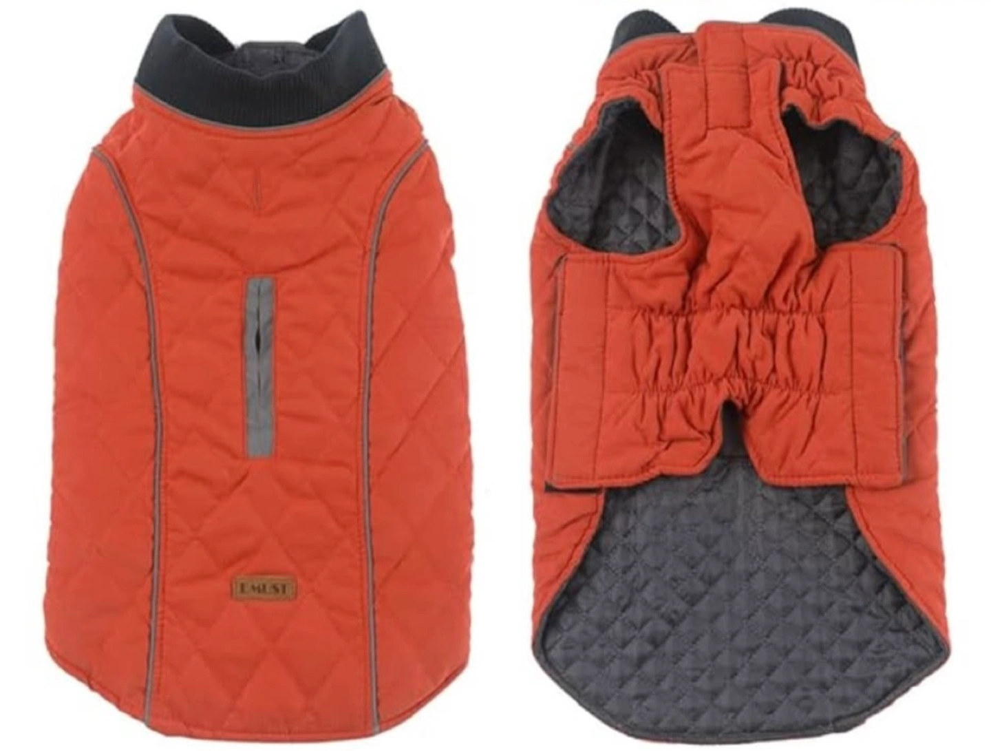 Warm quilted dog coat. Orange exterior, grey interior. Size large. Zipper closure. Measurements in image.