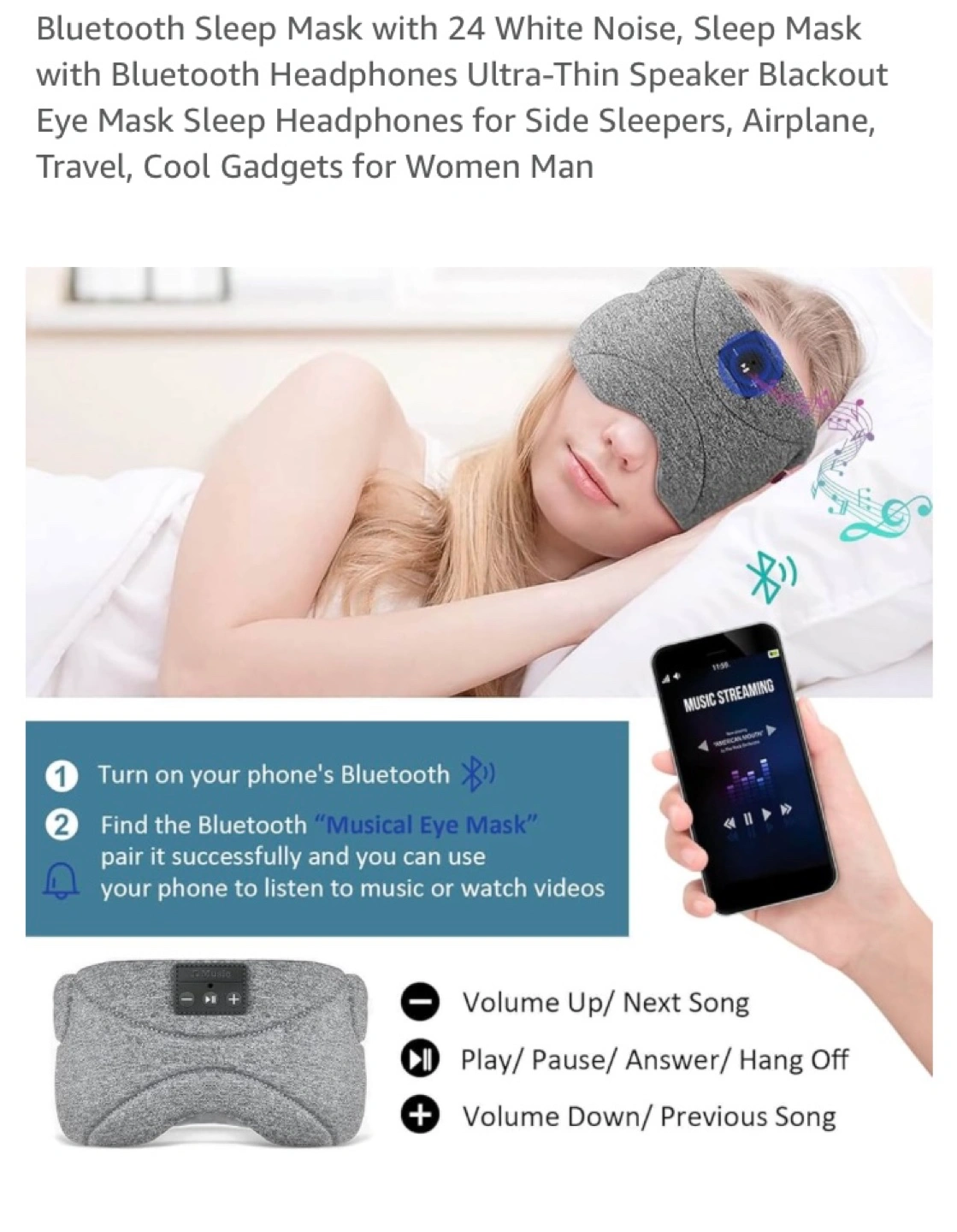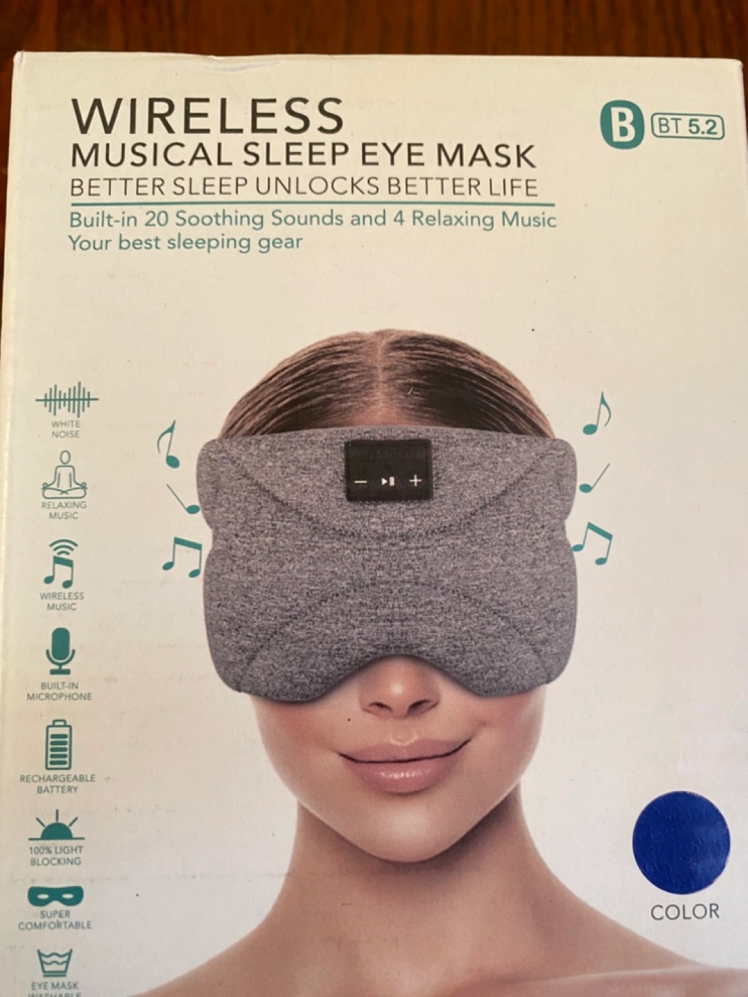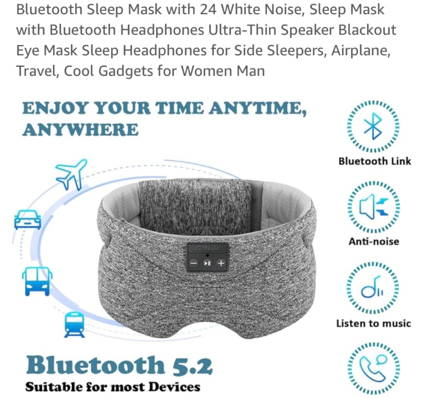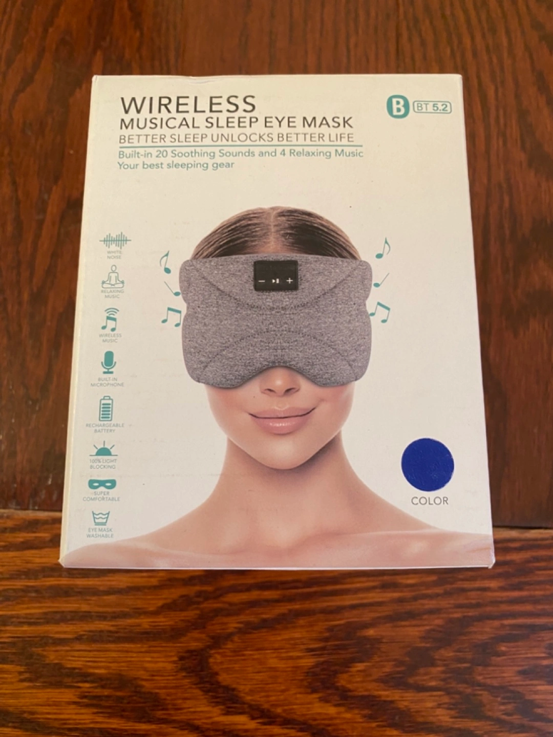 Grey Bluetooth sleep mask. Features 20 soothing sounds and 4 relaxing music options. Ultra-thin speakers. 100% light-blocking design. Cash Only