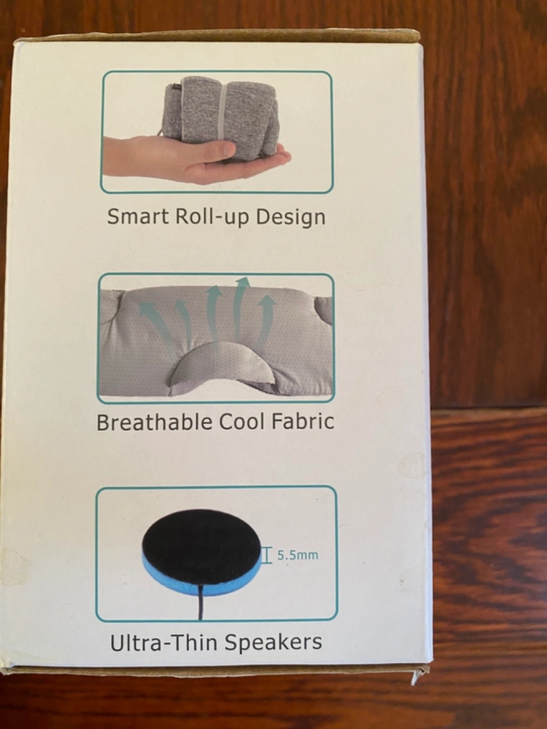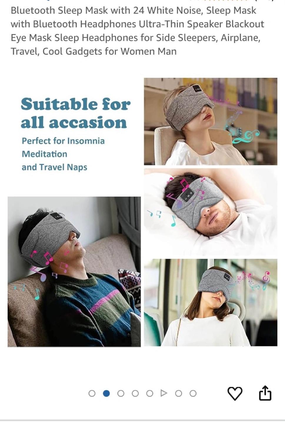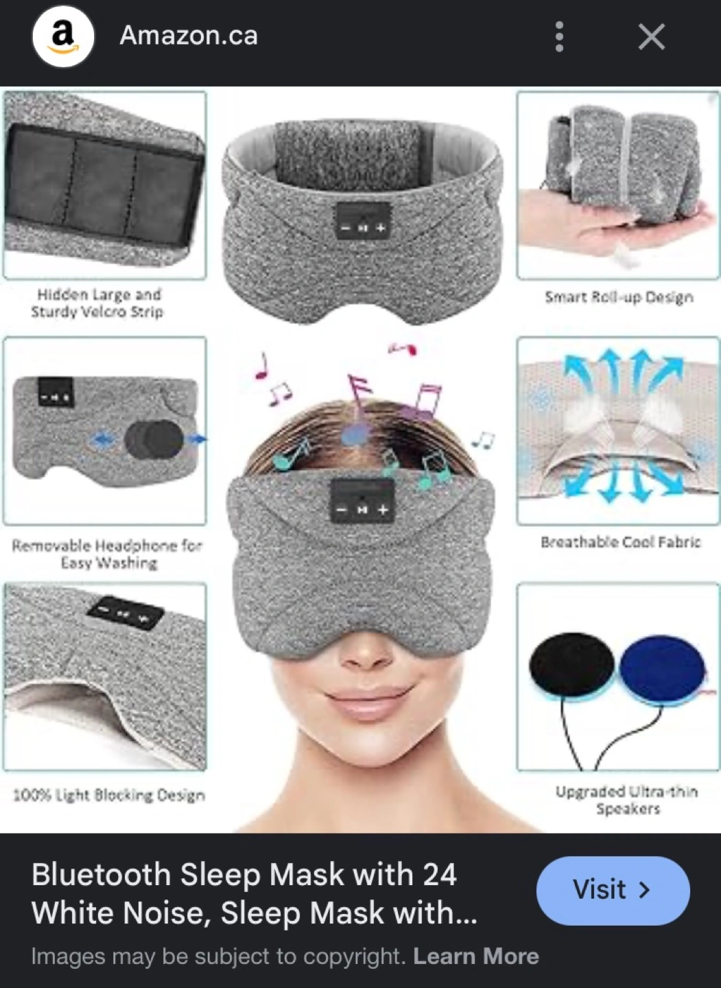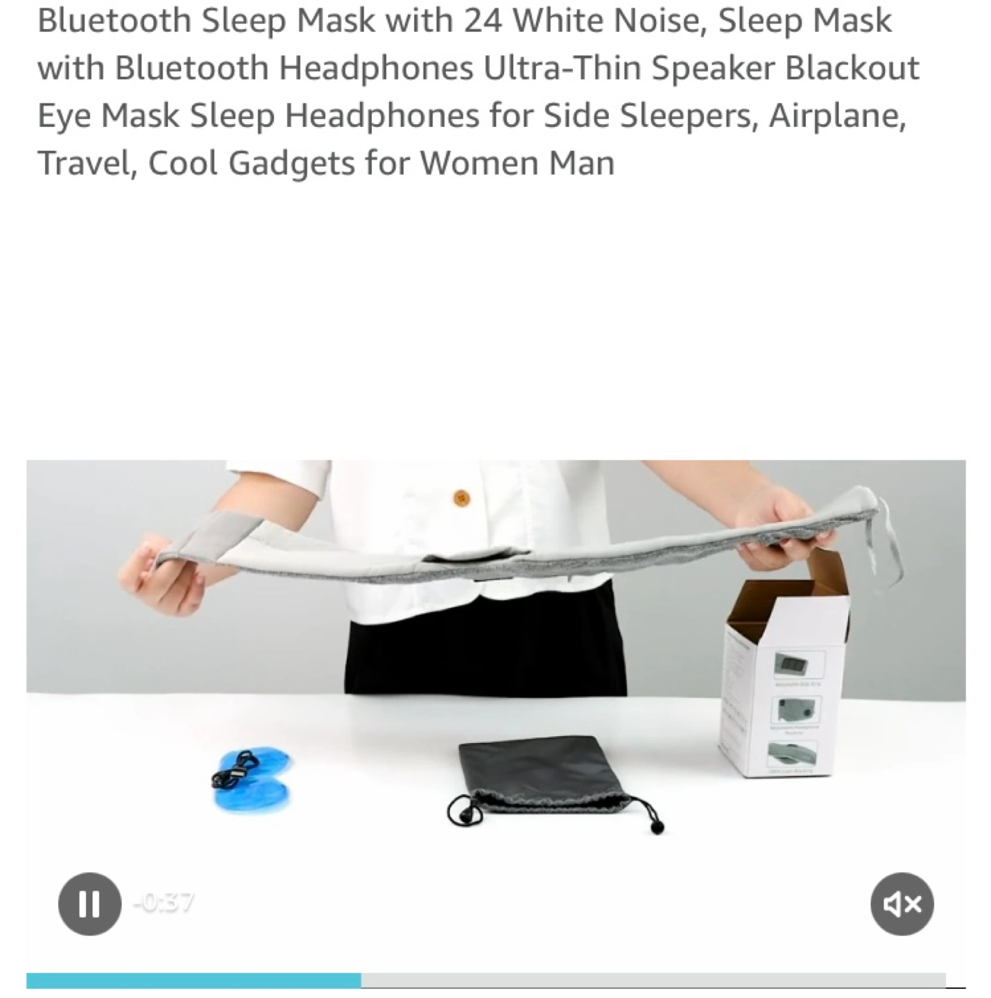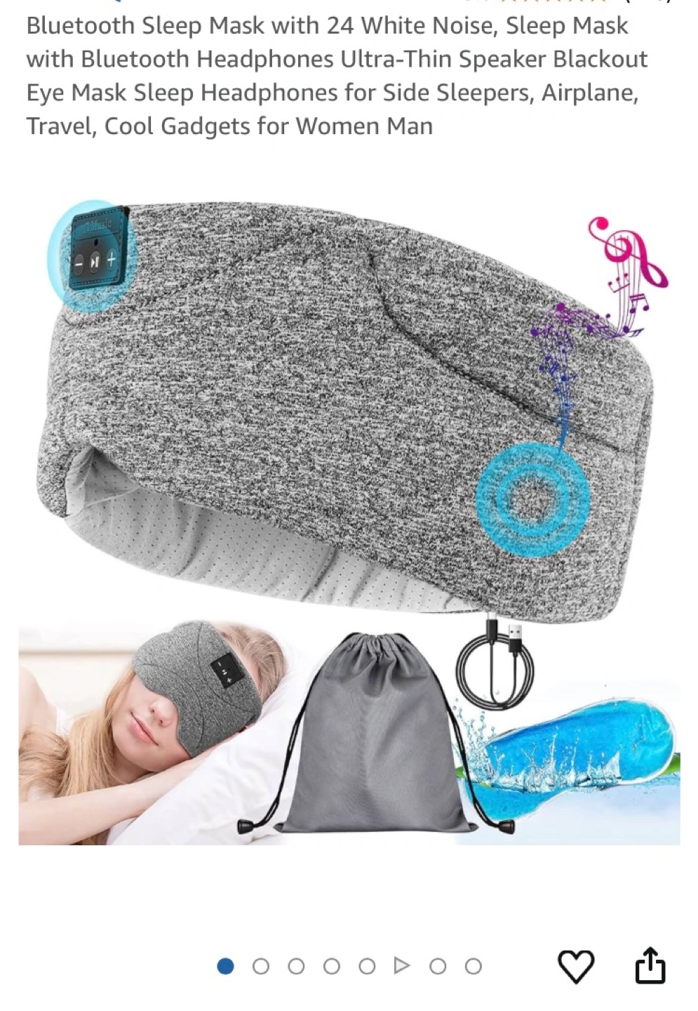Grey Bluetooth sleep mask. Features 20 soothing sounds and 4 relaxing music options. Ultra-thin speakers. 100% light-blocking design. Cash Only