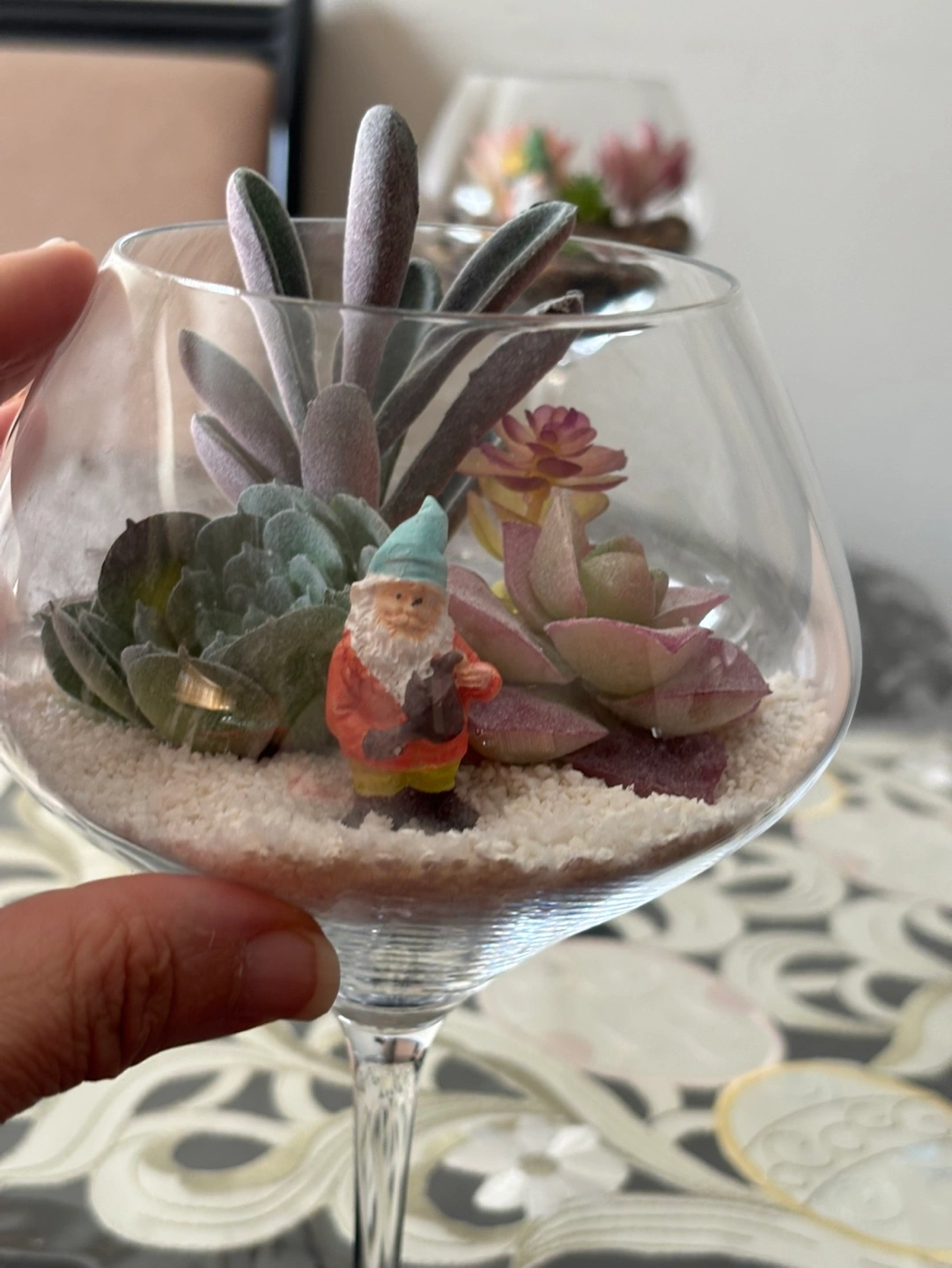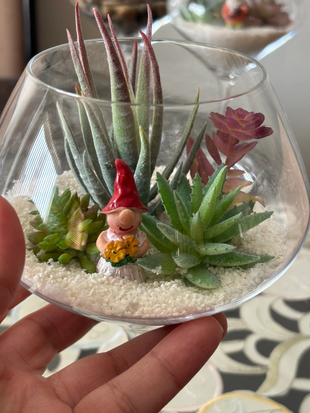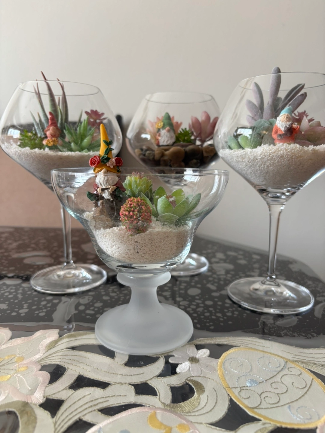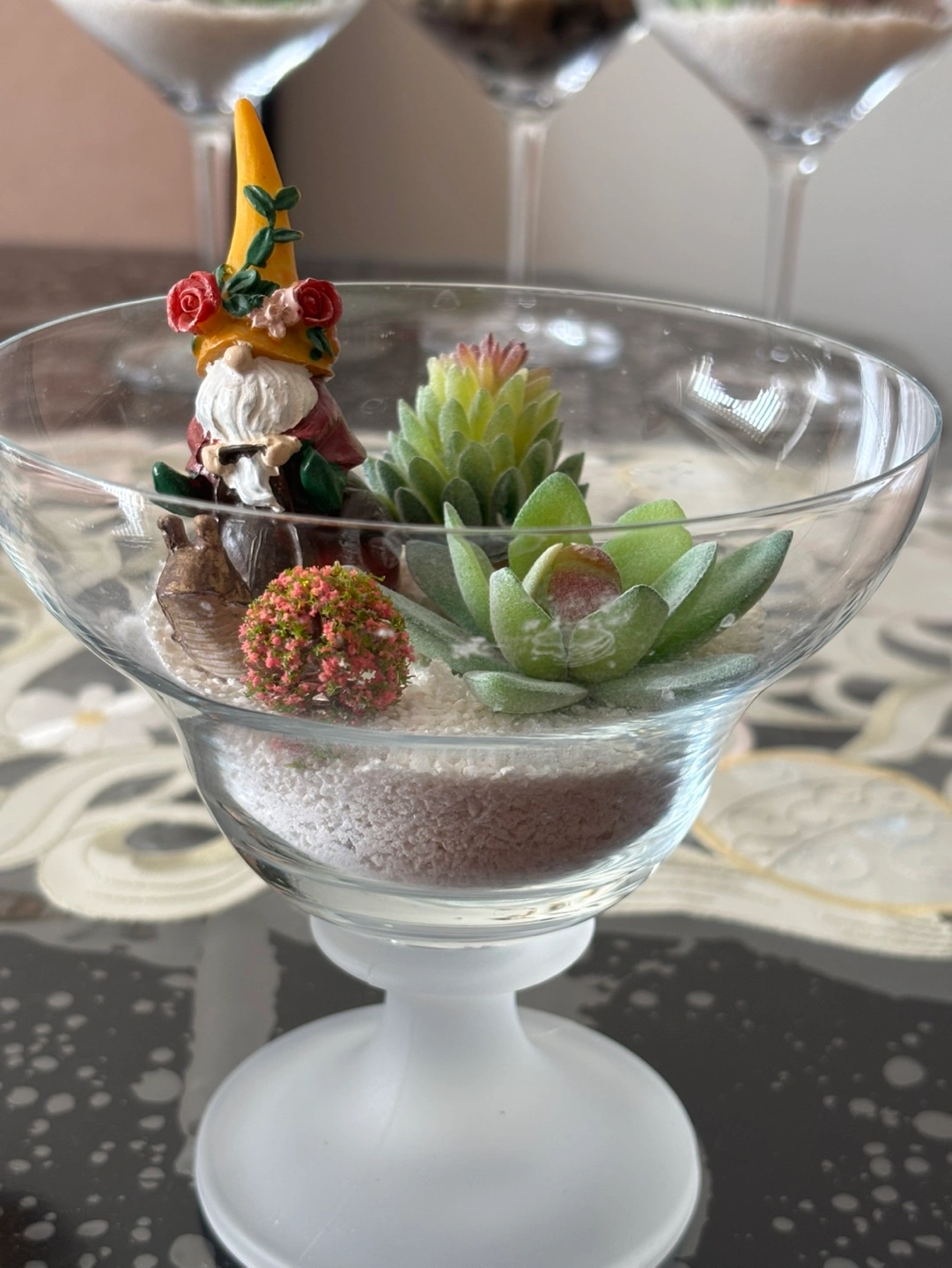 Charming miniature garden features a gnome figurine among artificial succulents. Set in a glass bowl with white sand. Perfect tabletop décor or a gift: I only have the ones in this listing. 3 tall glasses are 8.5” tall and the smaller one is 4.5” tall $25 each or all 4 for $80 No holds, pickup with cash Only Location in Mississauga